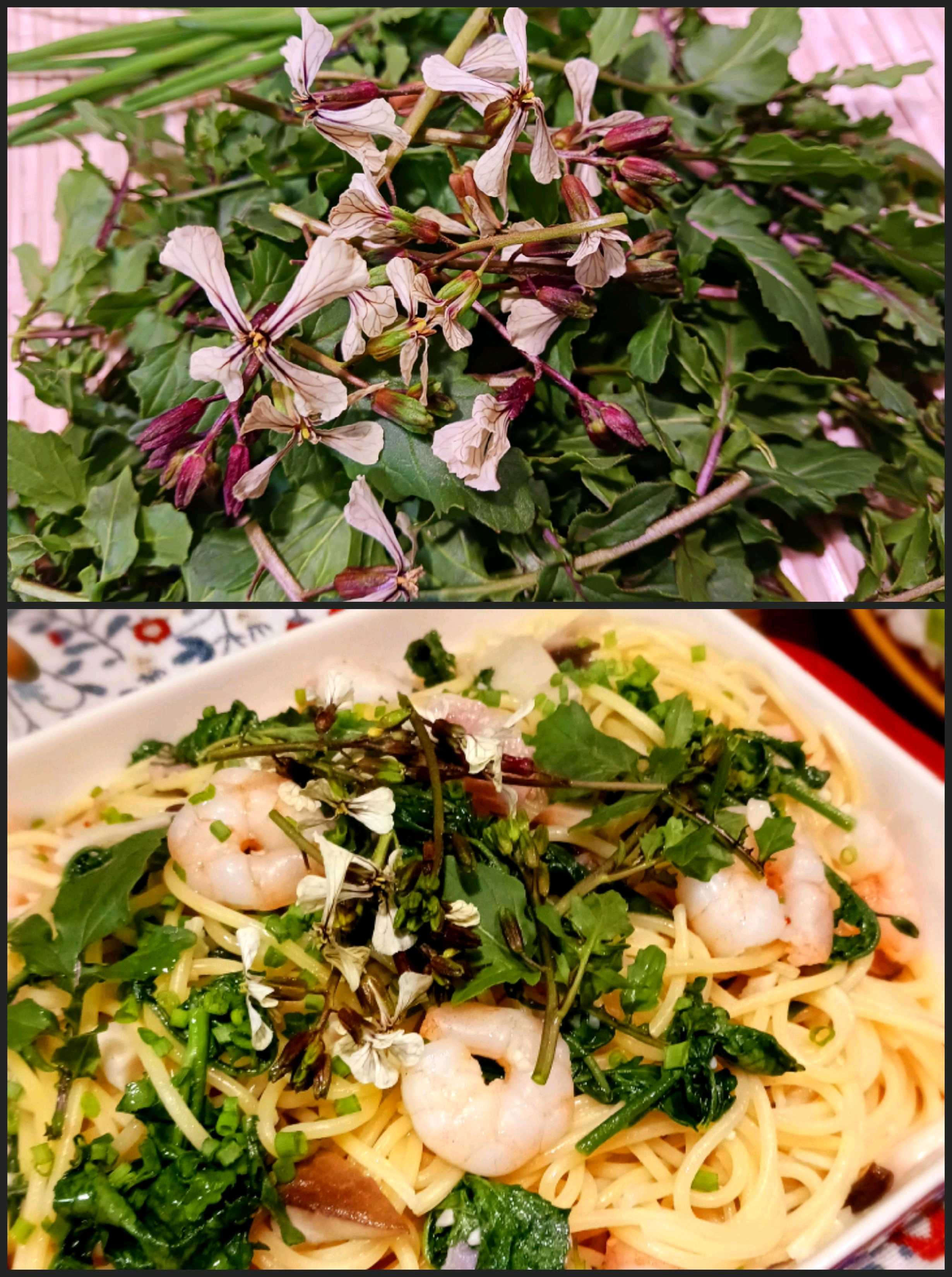 冬越しルッコラがたくさん新芽を吹いてきたので山盛り収穫してペペロンチーノに(エビとエリンギ入り)