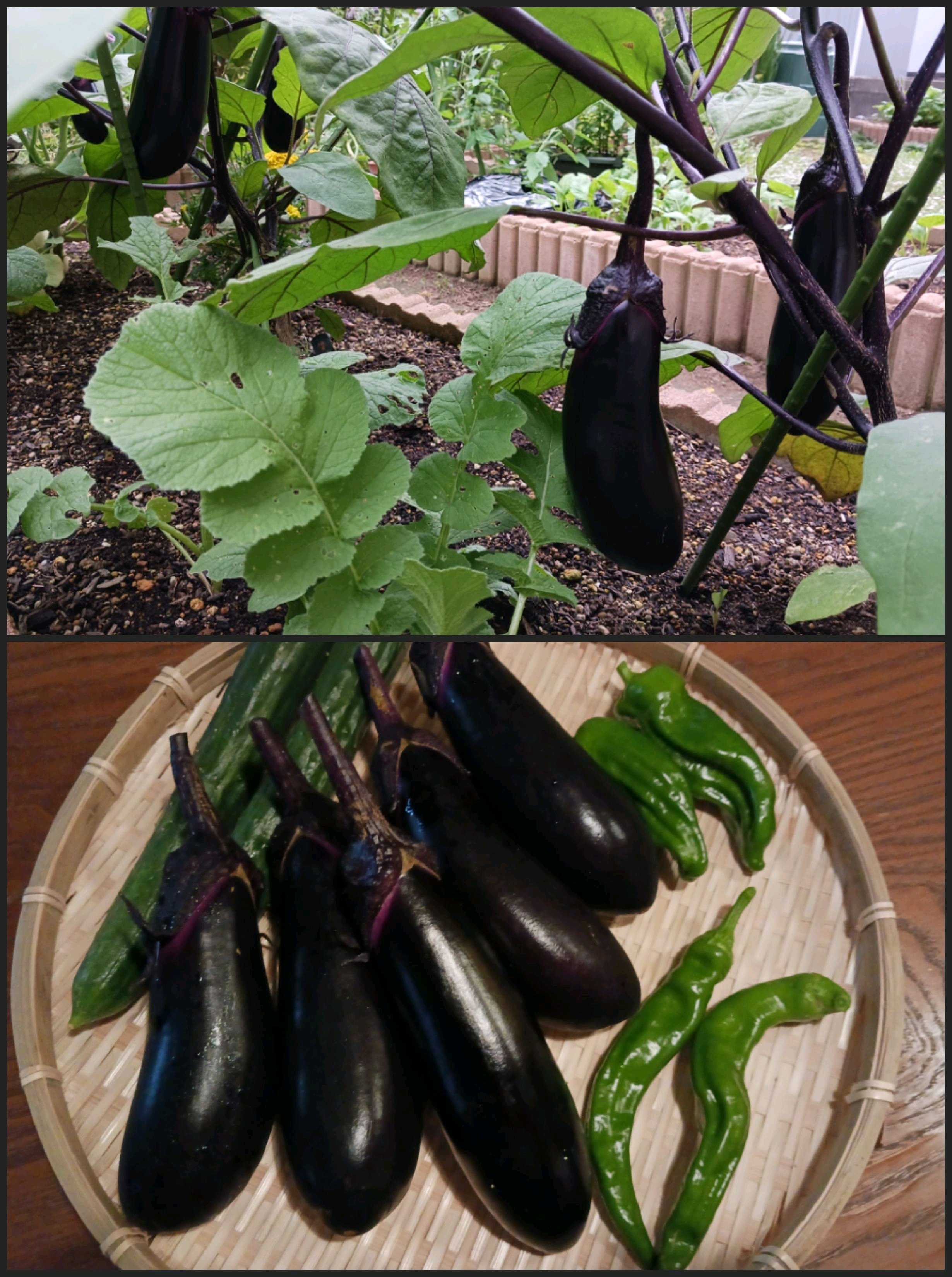 イボイボの四川キュウリ🥒と立派なナス🍆を初収穫。夏すずみキュウリは毎日1、2本採れるので助かってます(6/23)