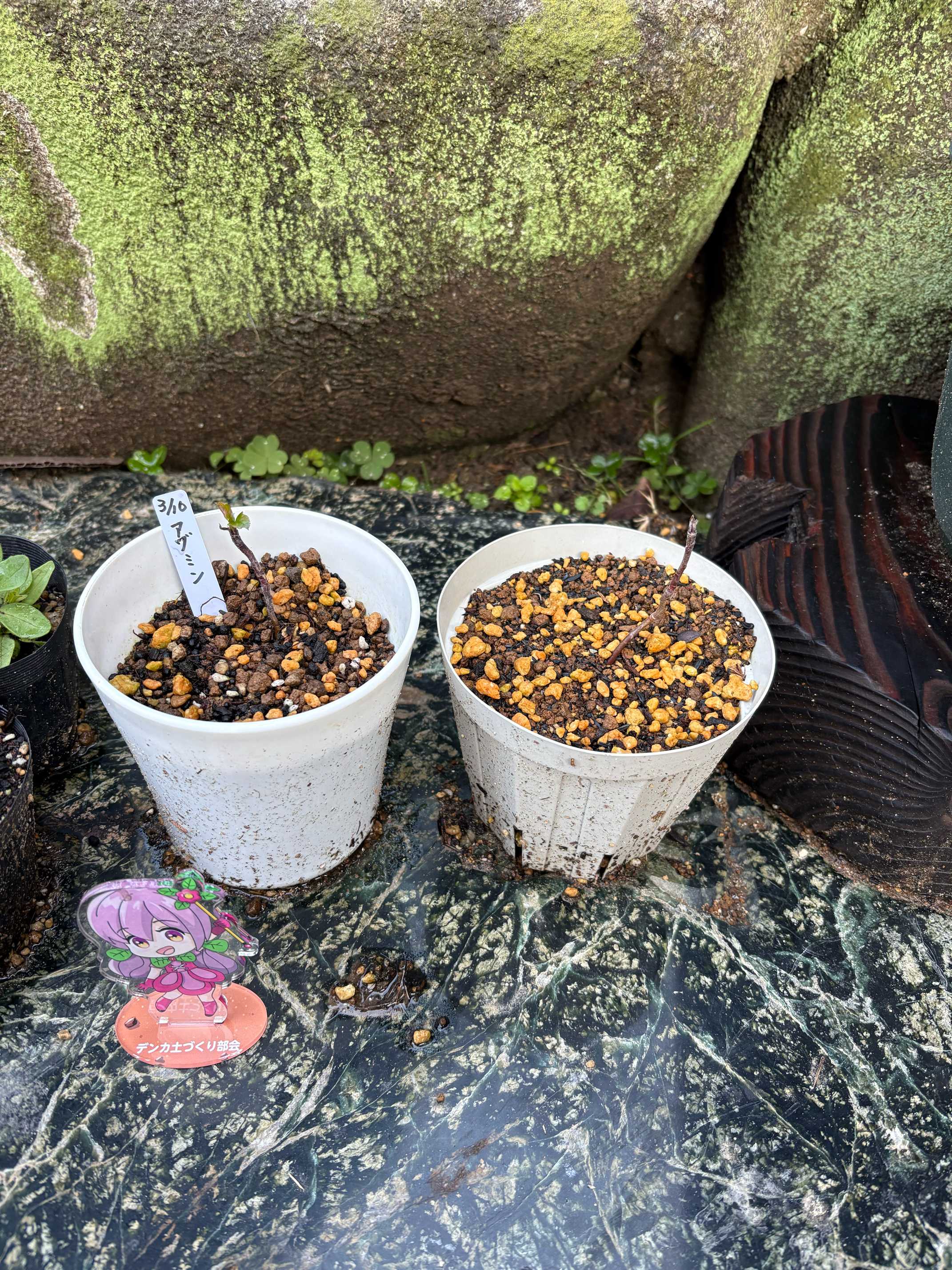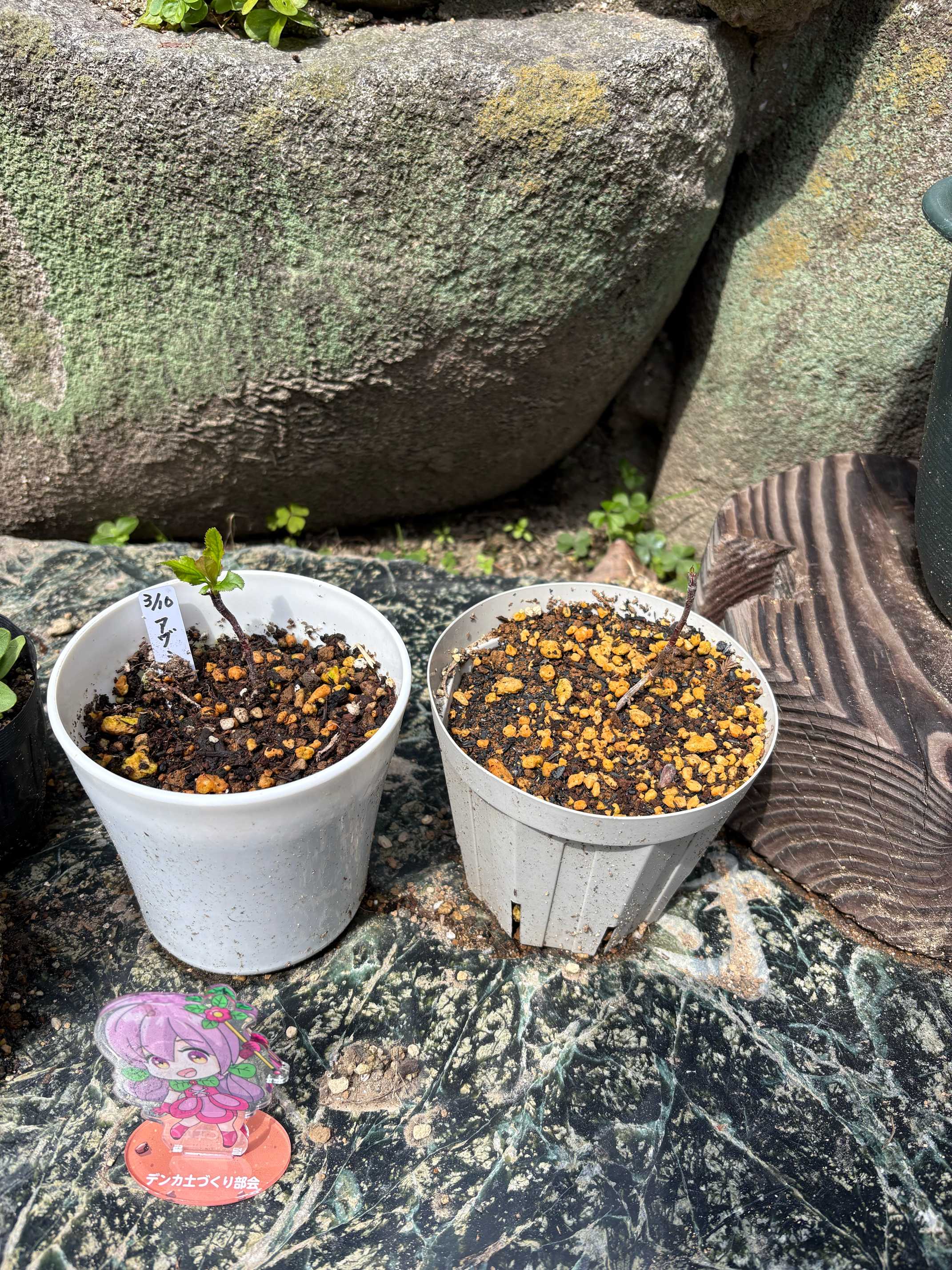 落葉して枯れたようになった実生のリンゴ弱々しい方にアヅミンを撒いてみて違いを見たいなって思っていたら、もう新芽が出てきてる
