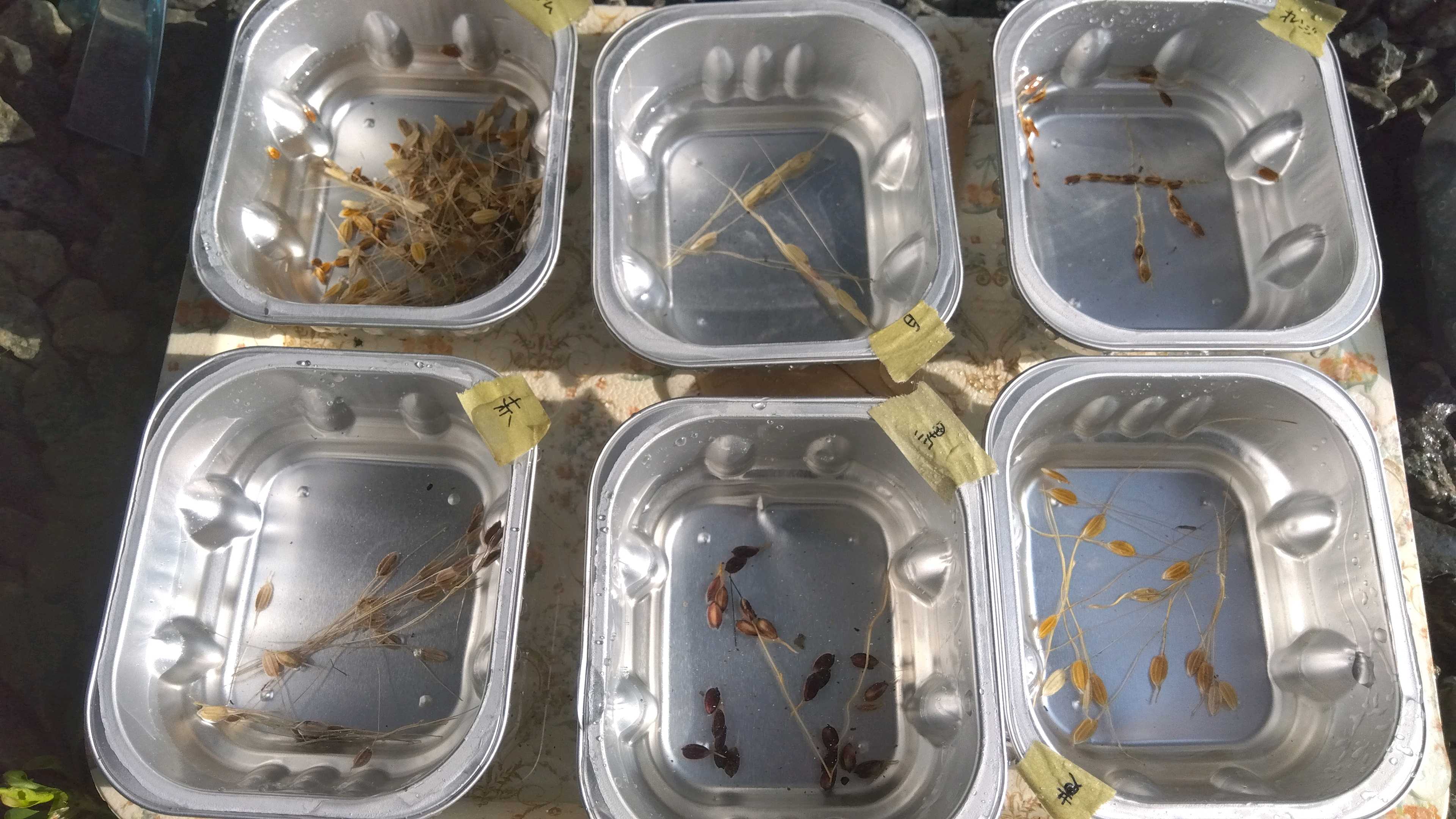 古代米の一部を各色に分けて、水へ浸し、芽出しします。