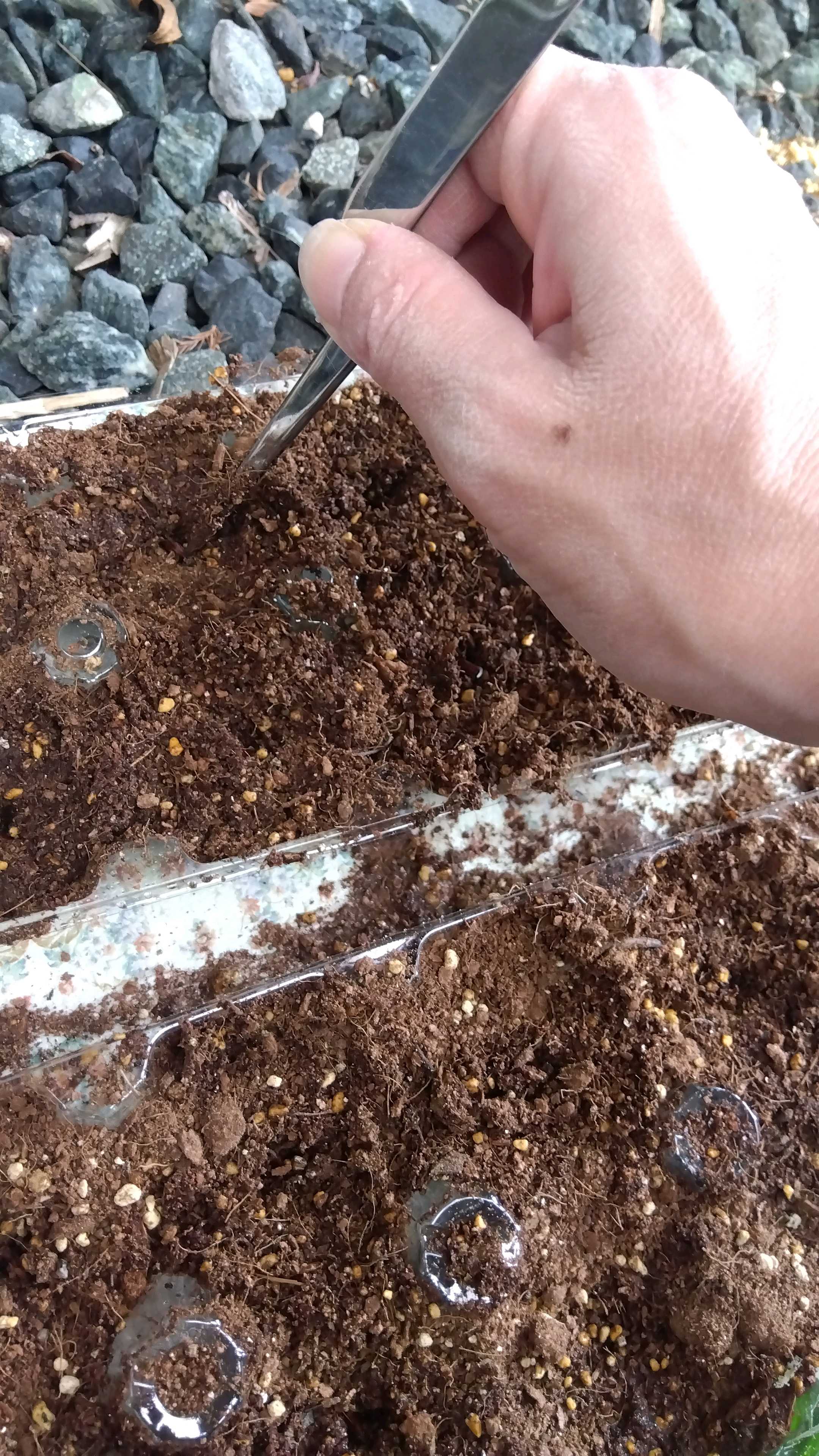 発芽したコを一個ずつ土に入れていきます。