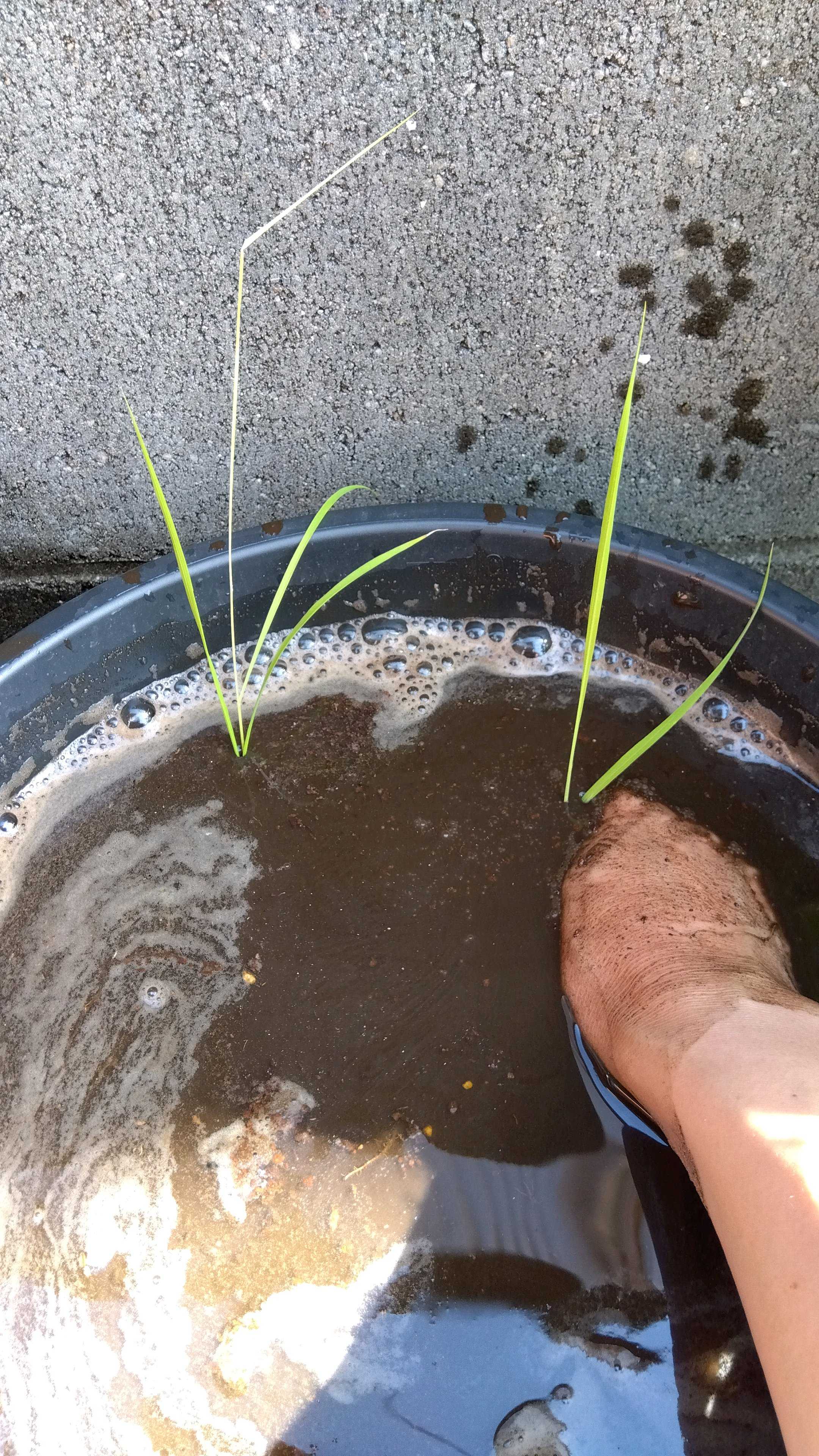 田植え。植える前にしろかきと言う作業をしました。田植え用の土を一度捏ねて馴染ませてあるから、いらないのかも?平坦だったのを、混ぜてしまって、濁った土をまた平坦に戻すのは難しかったです。元気そうな苗から選んで植えていきました。