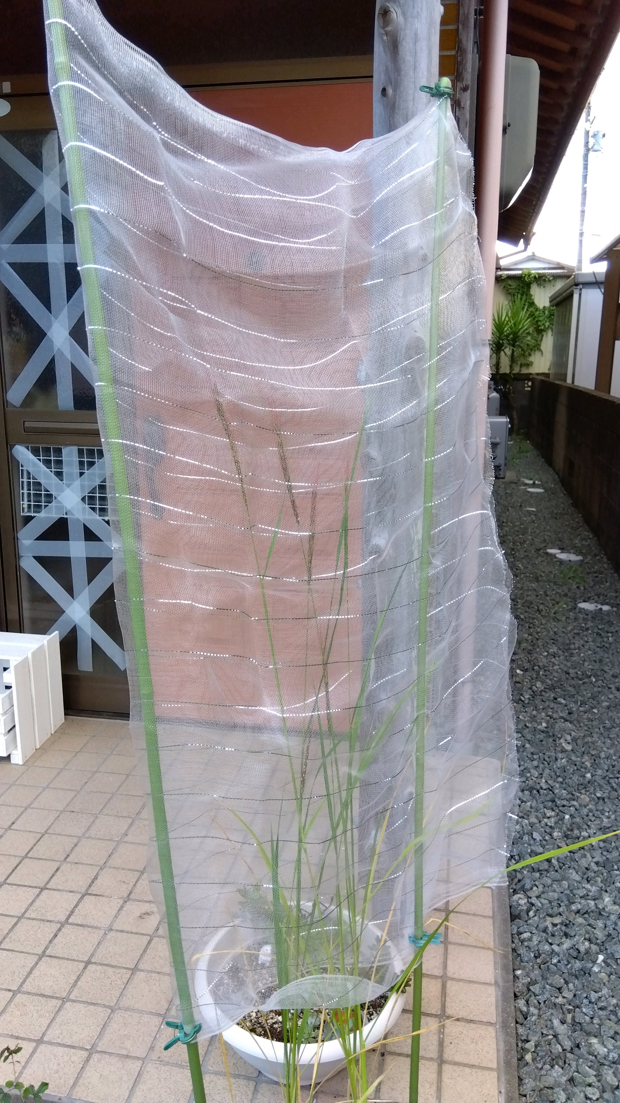 実が膨らんできたので、鳥対策でカバーをかけました。