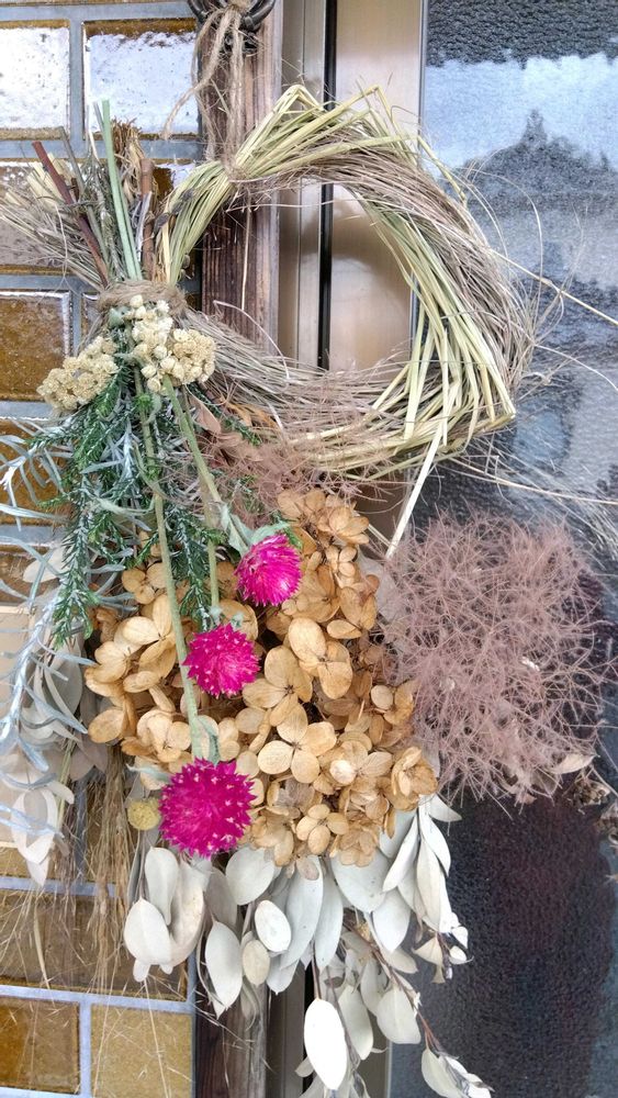 今年はユーカリ、ノリウツギ、ライスフラワー、スモークツリー、センニチコウ、ヘリクリサム、我が家に勝手に生えてきた謎の穂で歳神様をお迎えです。
