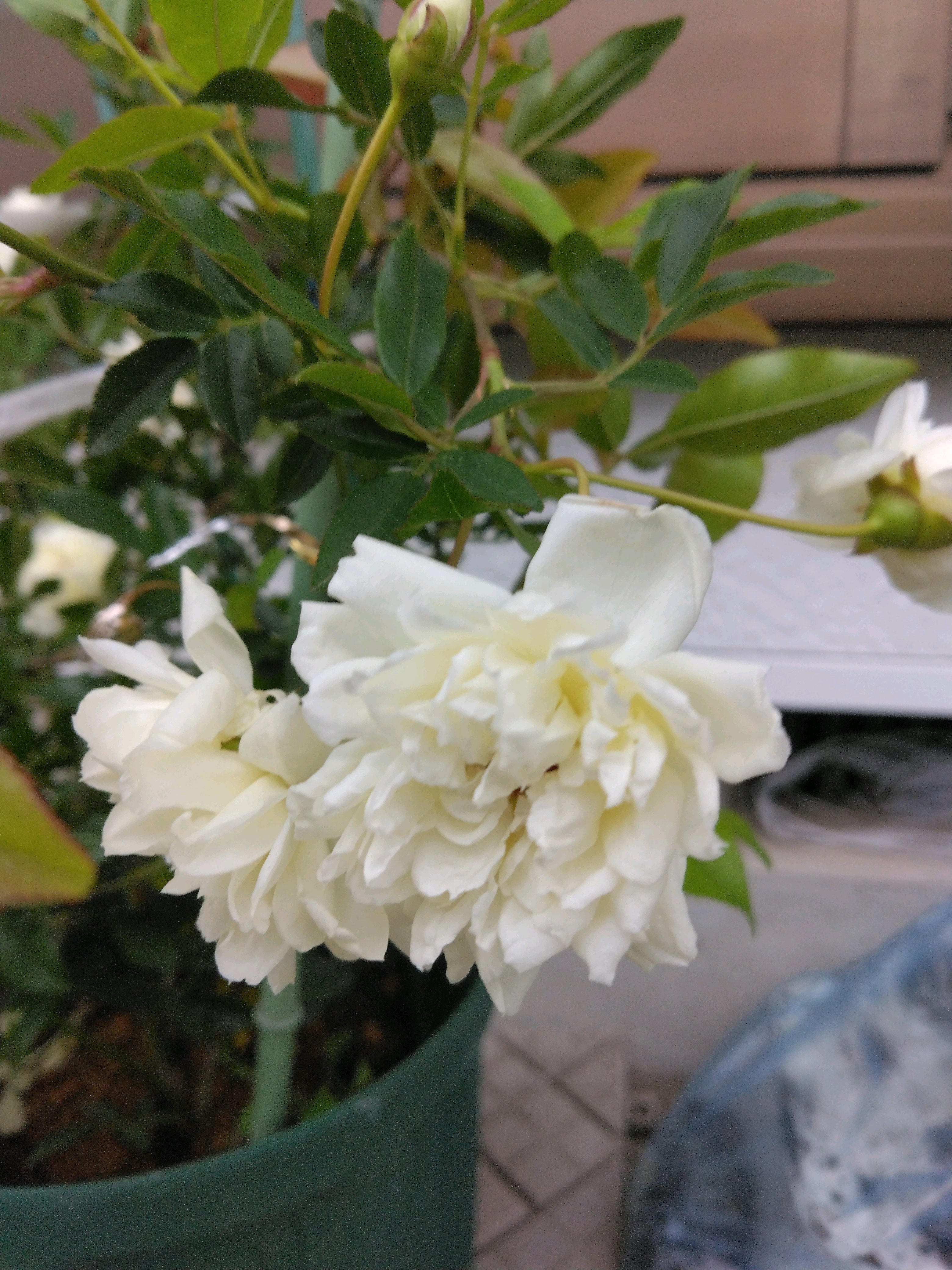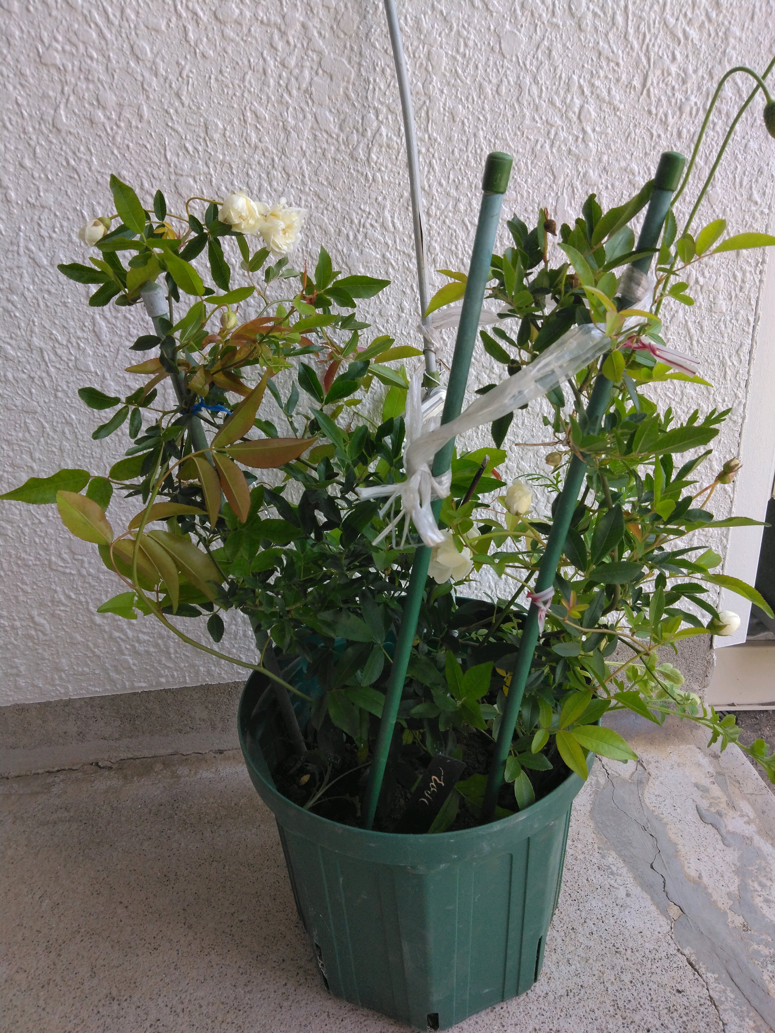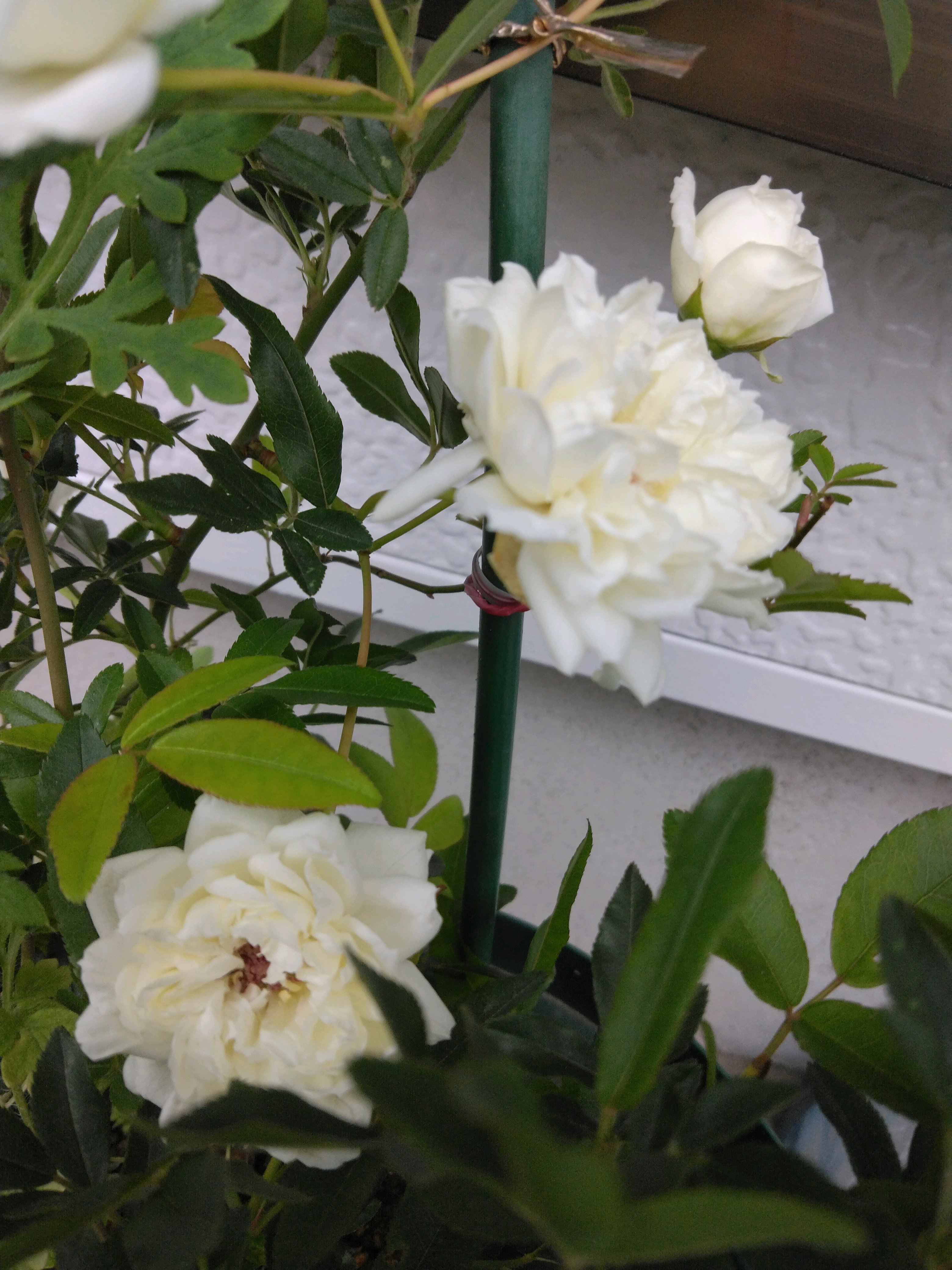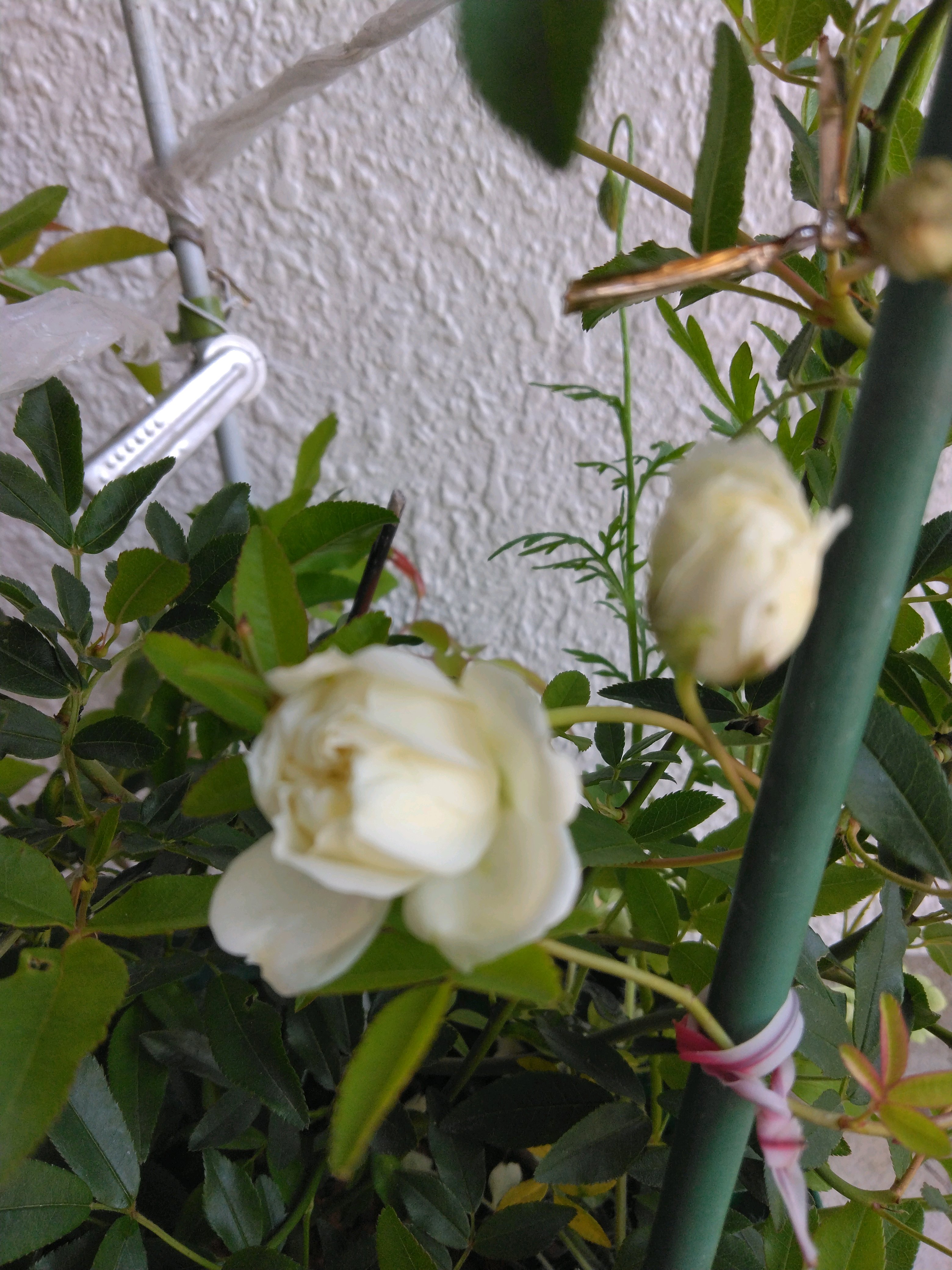 外壁修繕で白壁が綺麗になり、玄関横にて撮影 先ずは全体の姿からどーぞ🤗🎶全体的に見た目蕾の数は10~15位はあるかな?