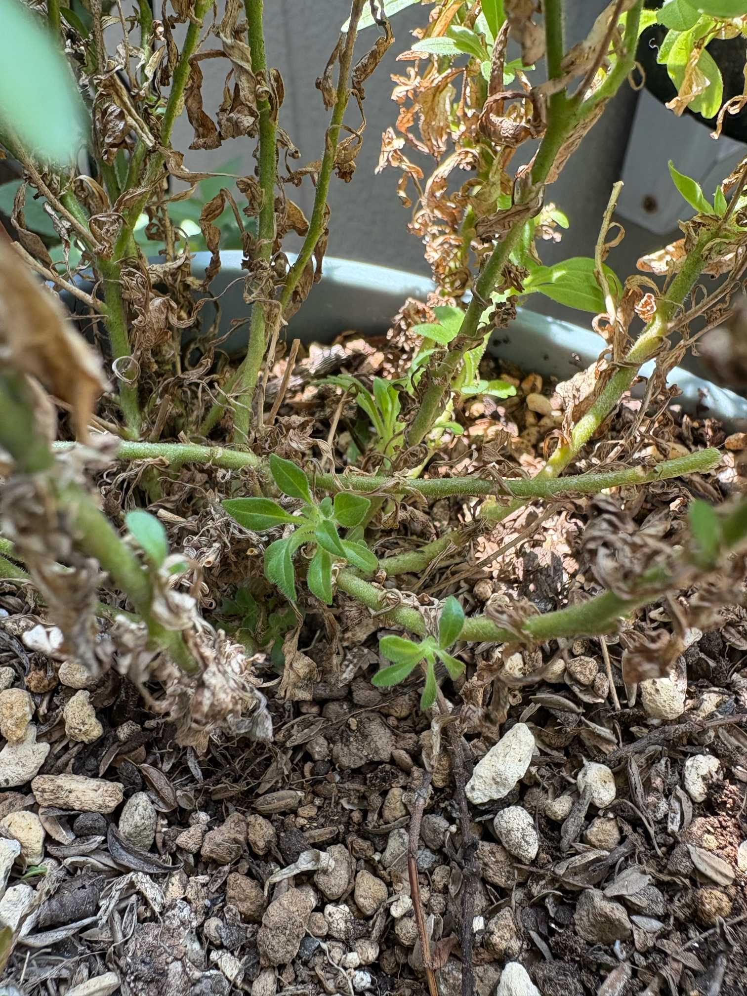 株元の葉っぱが枯れてきました。新芽が見えたらバッサリ切って夏越しさせるつもりでしたがその気配が無くてここまできてしまいました。