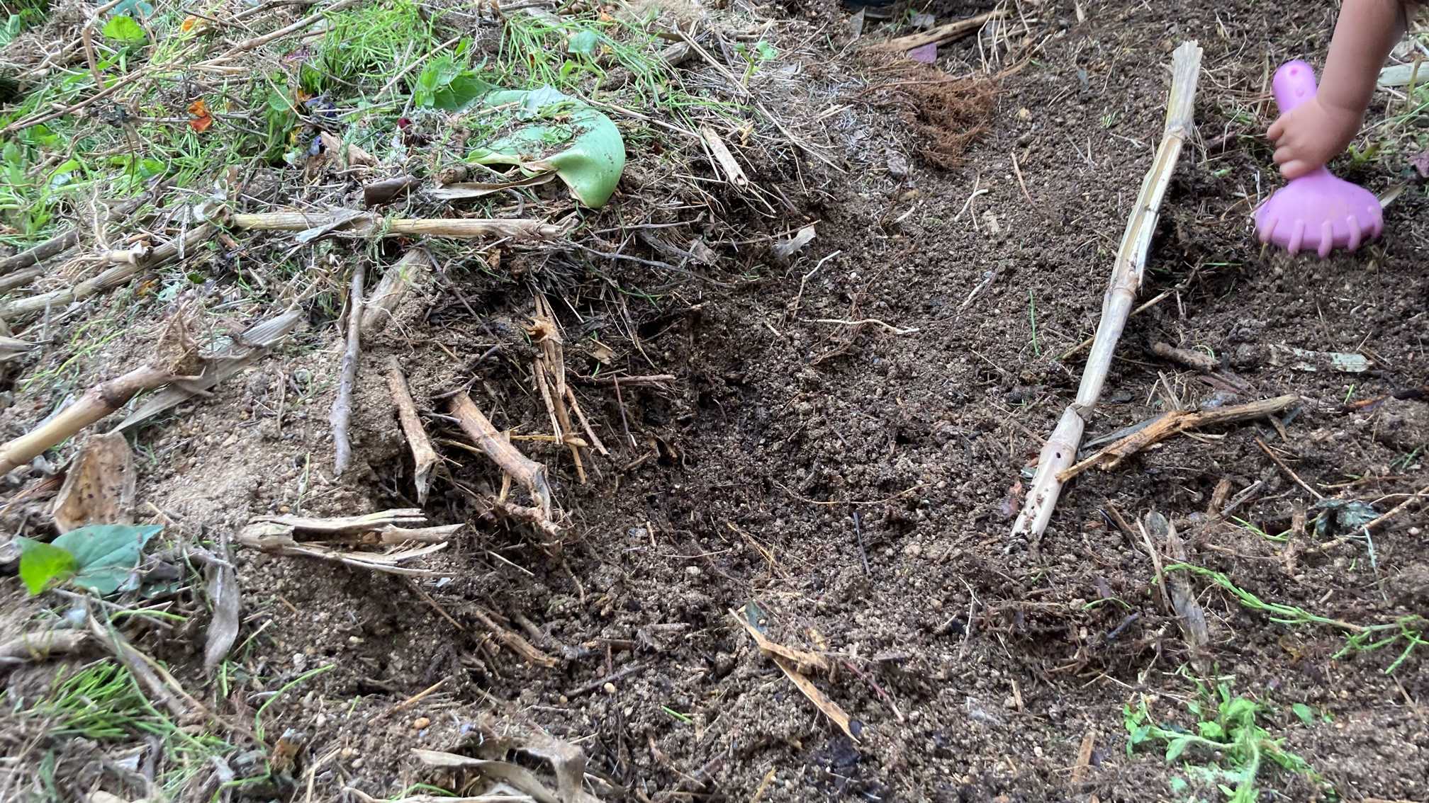 以前まとめにあげている生ゴミコンポストの堆肥を2ポット、深めに穴を掘って埋めました。