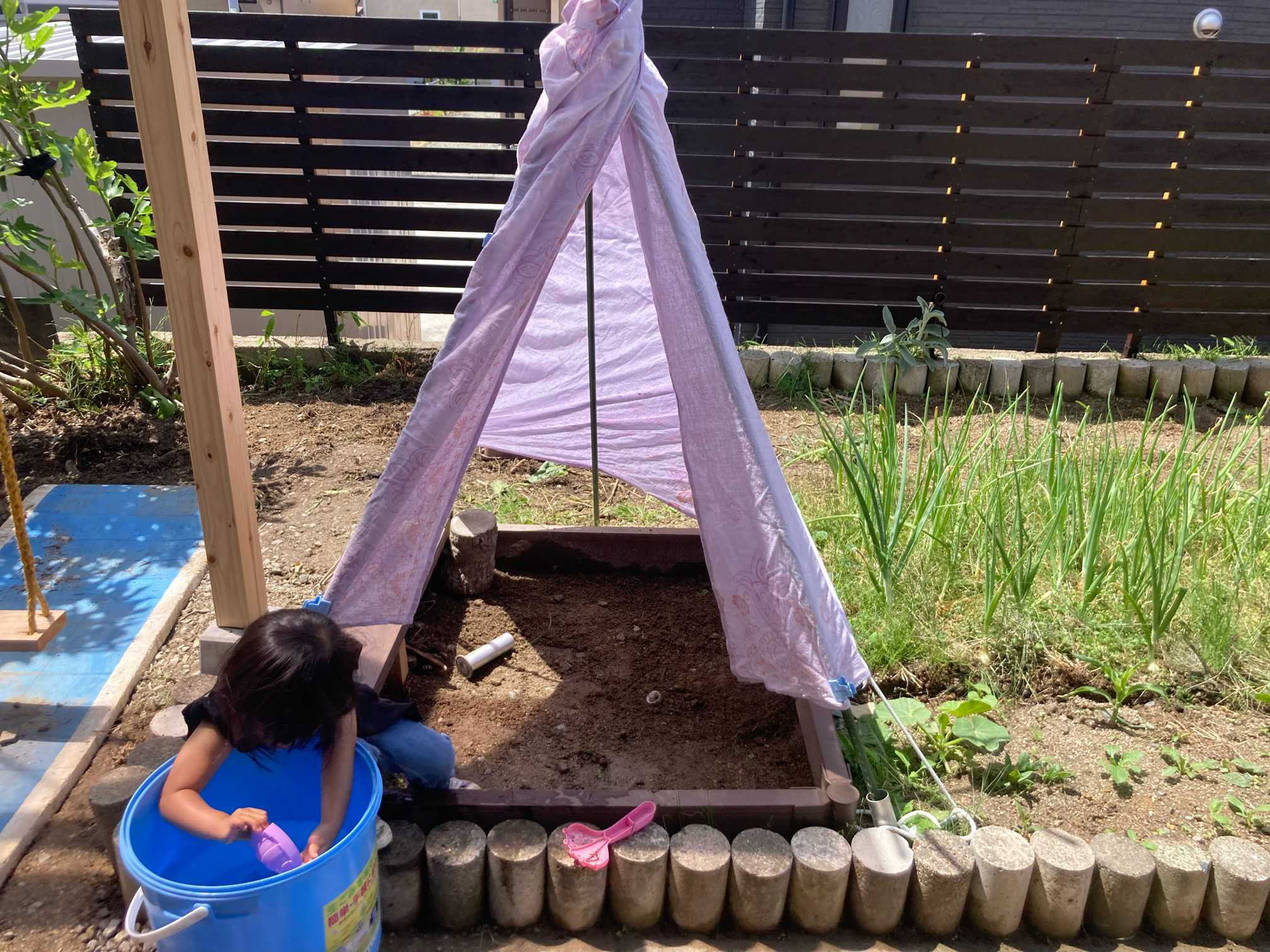 フェンスの色塗りをして、園芸資材でティピーテントを作りました。