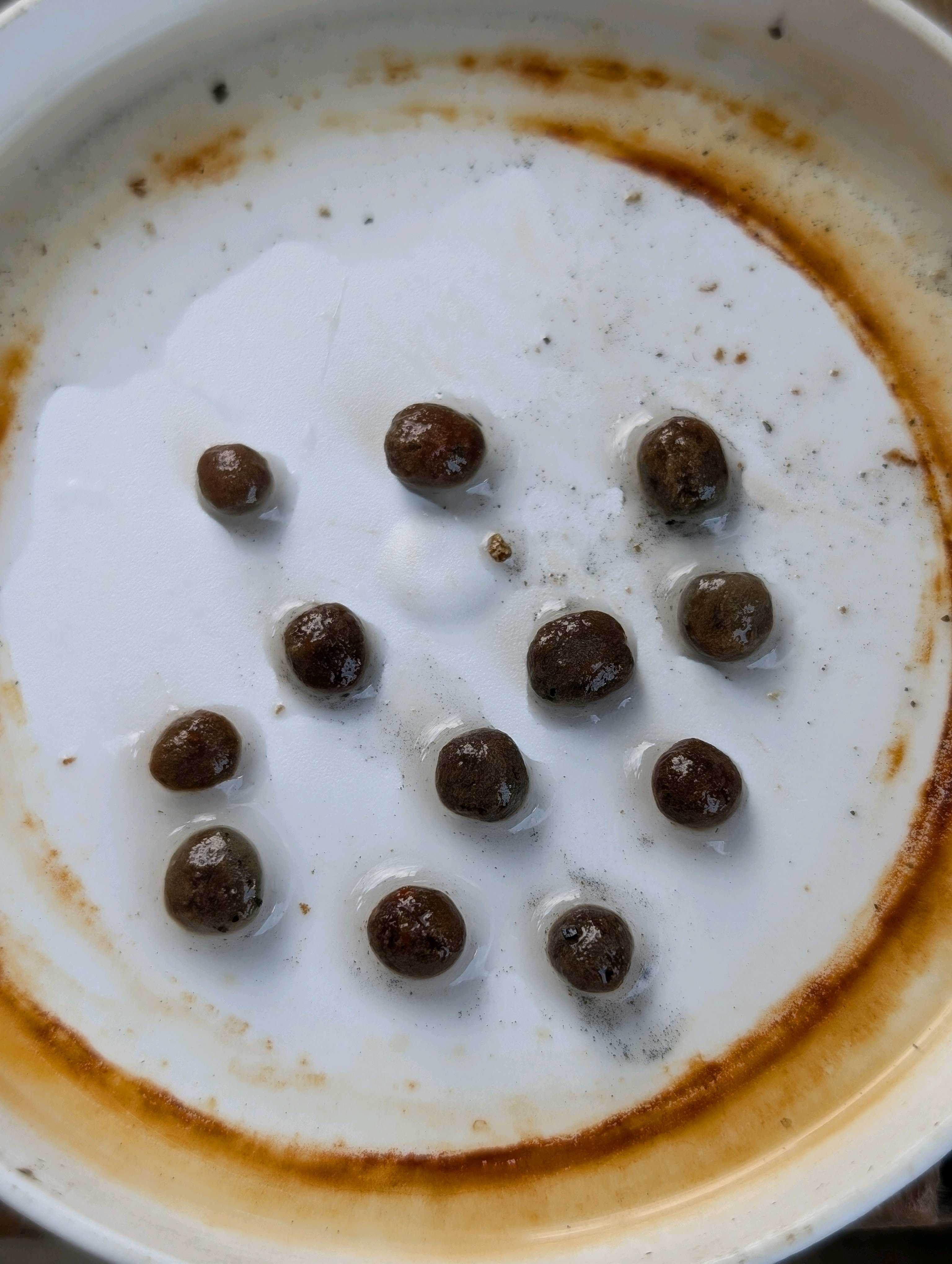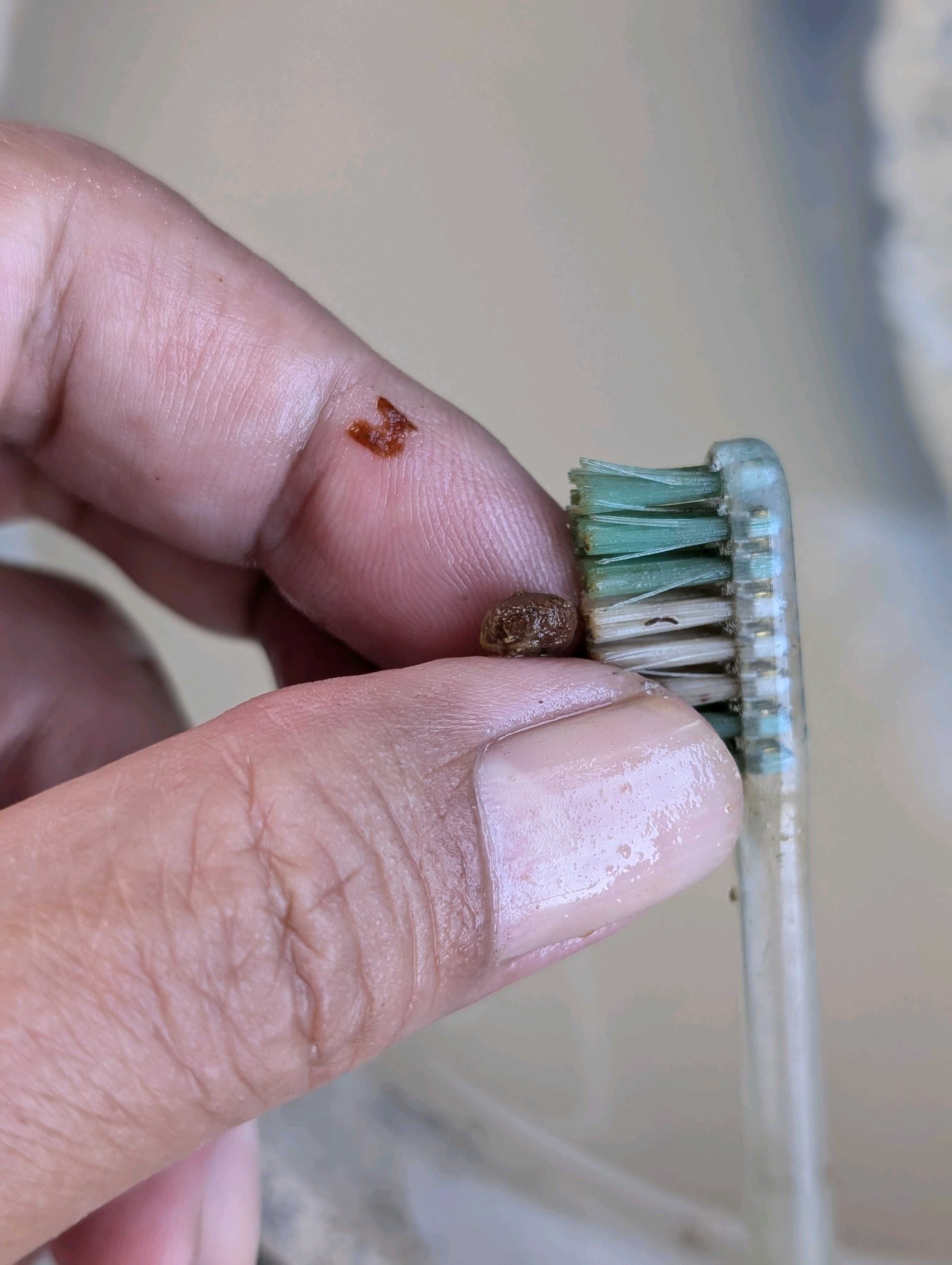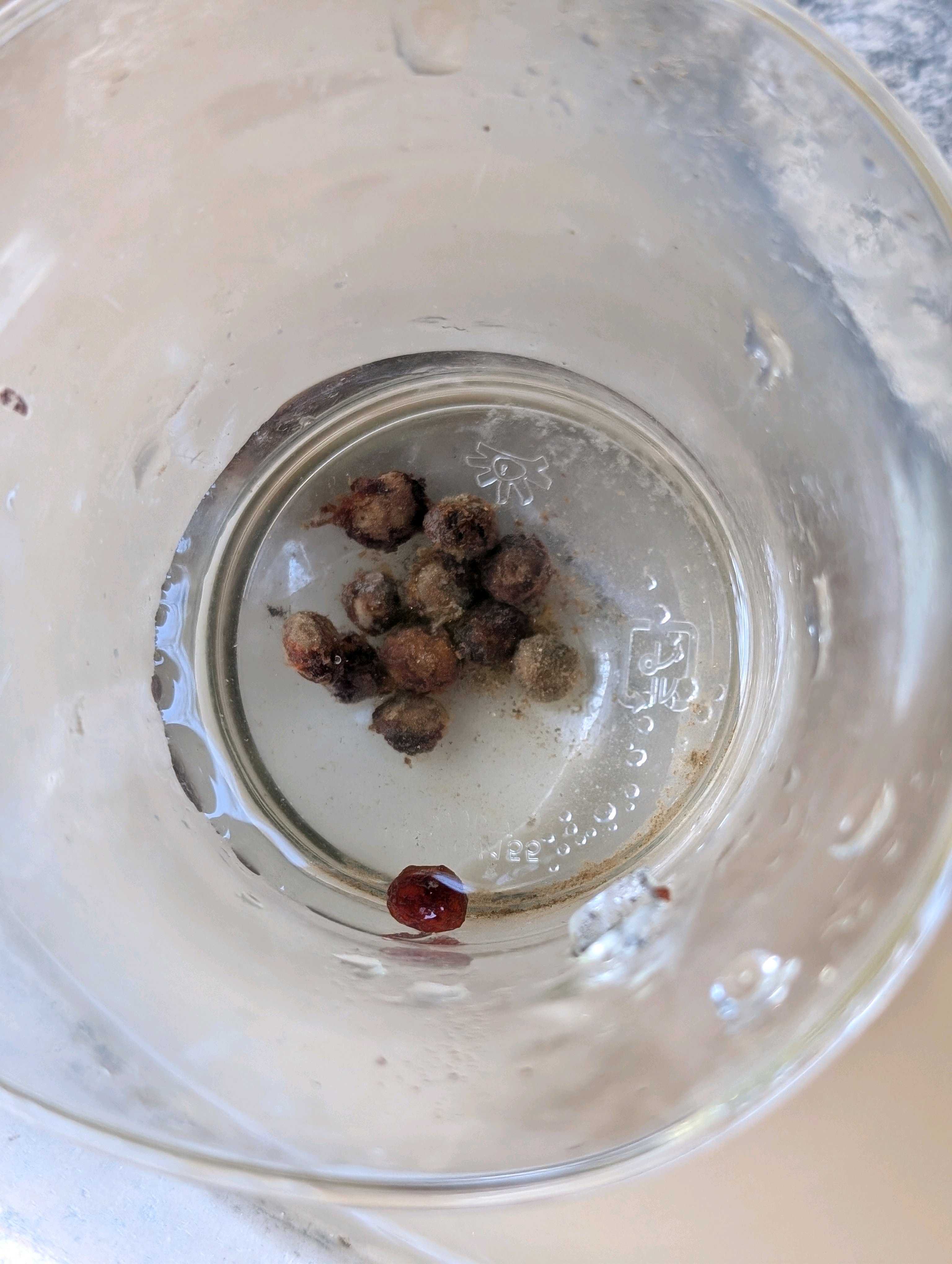 一粒ずつ取り出して、歯ブラシで果肉をこそぎとります。