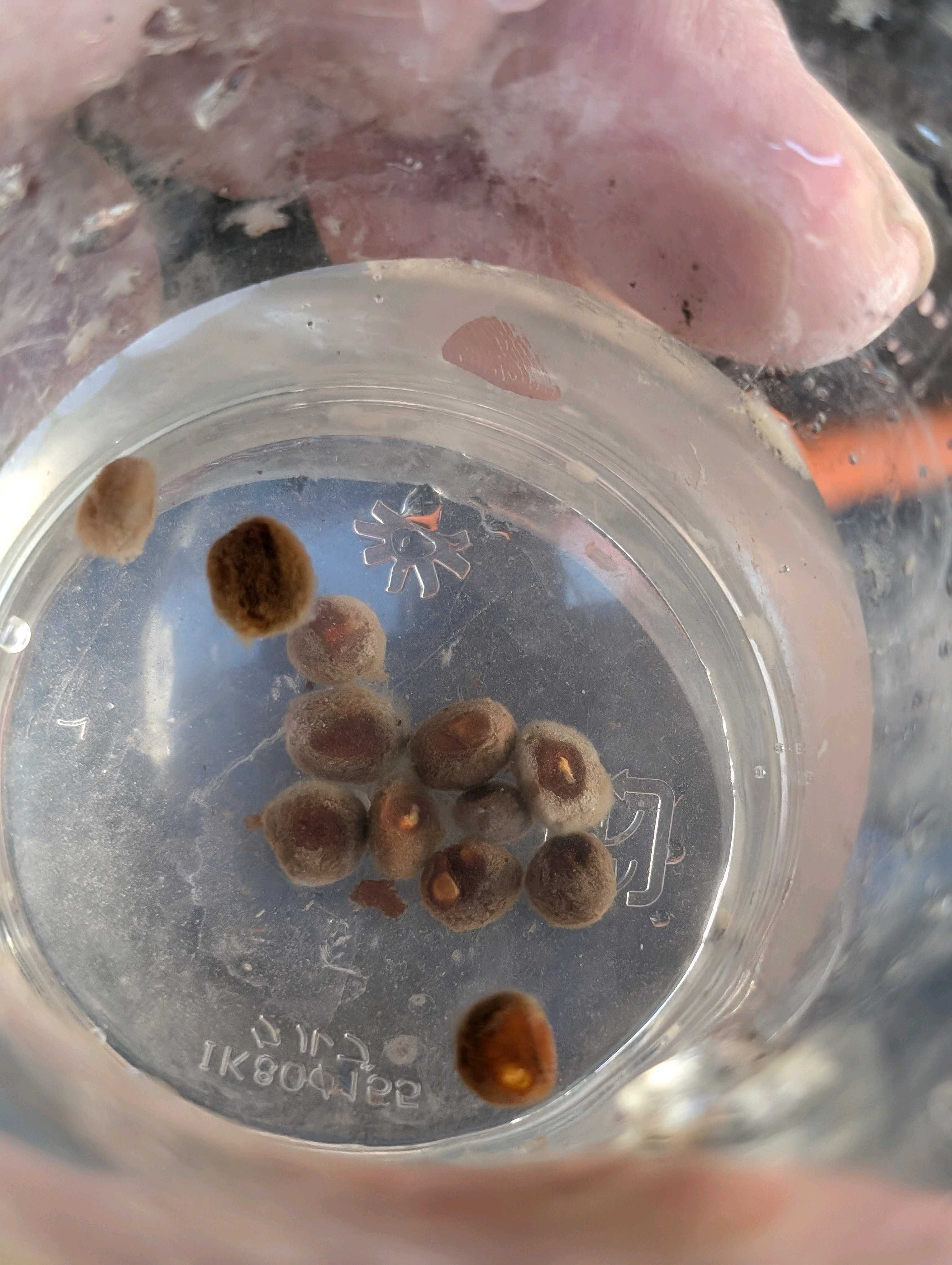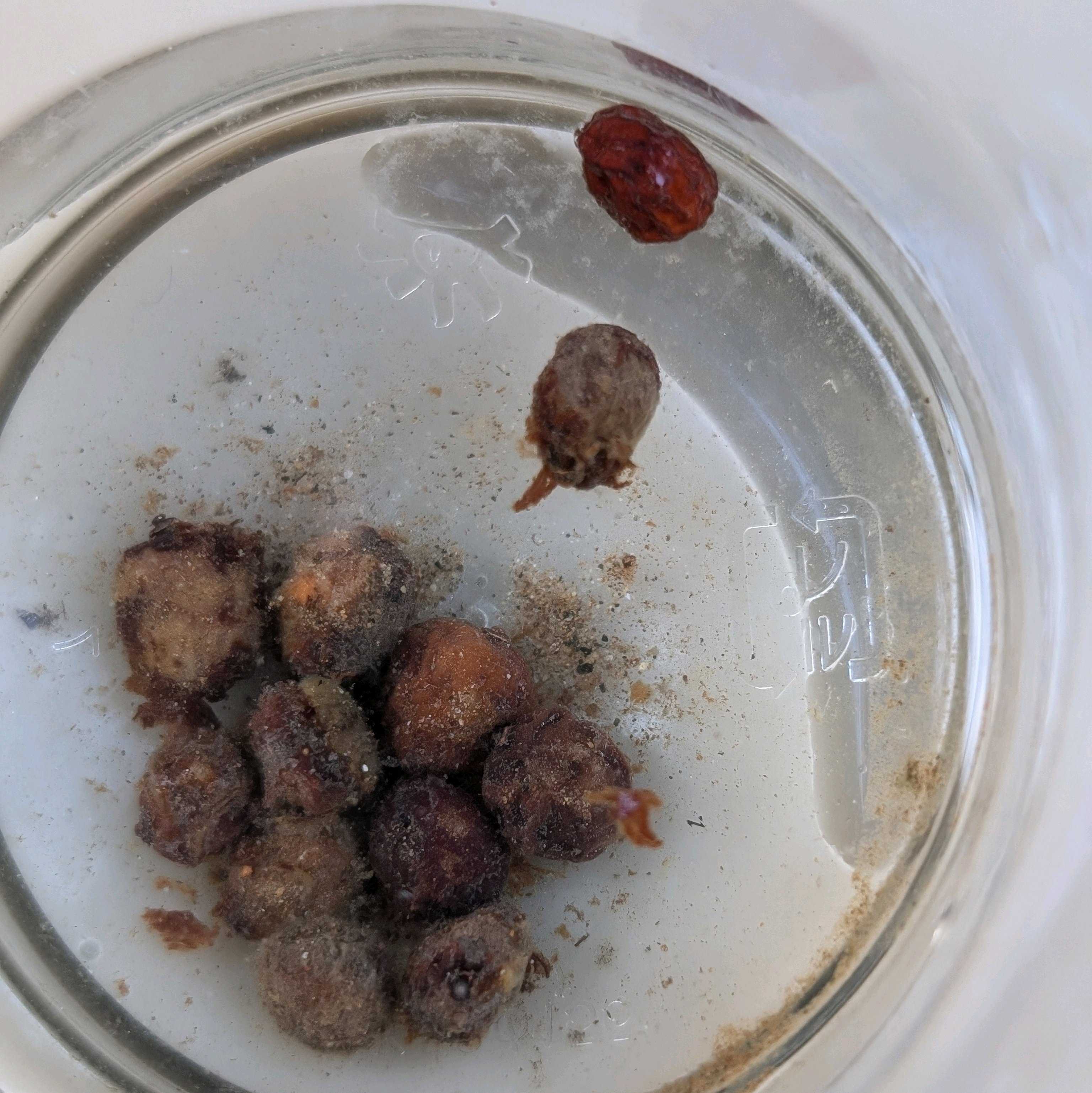 果実を取り除いた種子は、半日間、消毒液と発芽・発根促進剤を薄めた溶液に浸します。