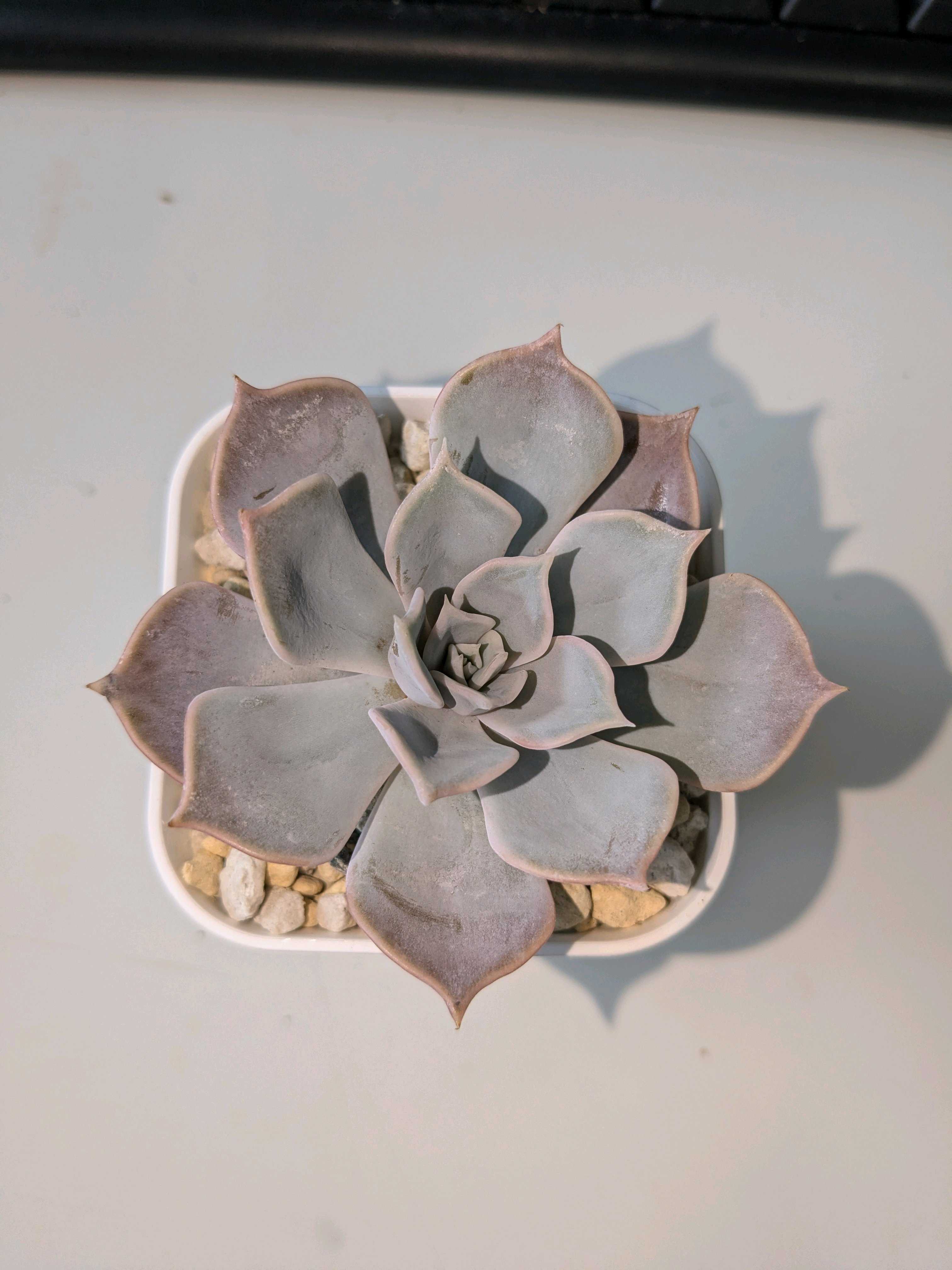 なぜ自分がこの苗を手に取ったか全く思い出せないのですが、ダイソーオンスロー、ダイソーギルバの次にやってきたのがこのリンダジェーン。多分緑でないエケベリアが欲しかったのだと😝徒長焼け野原だったホムセンの多肉売り場で何故か目があってしまったのですね😆