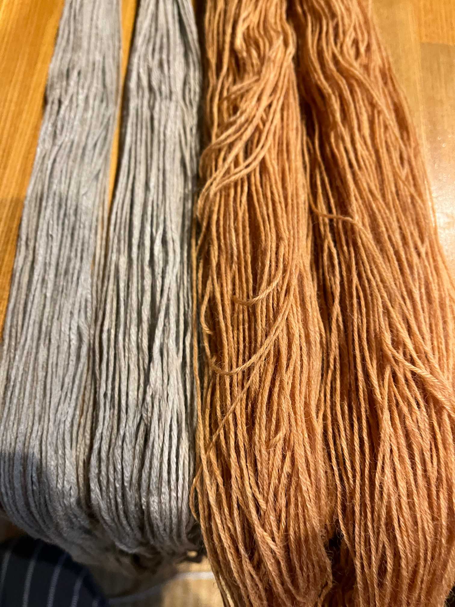 洗浄後自然乾燥したあずき色に染まったキビソの糸。