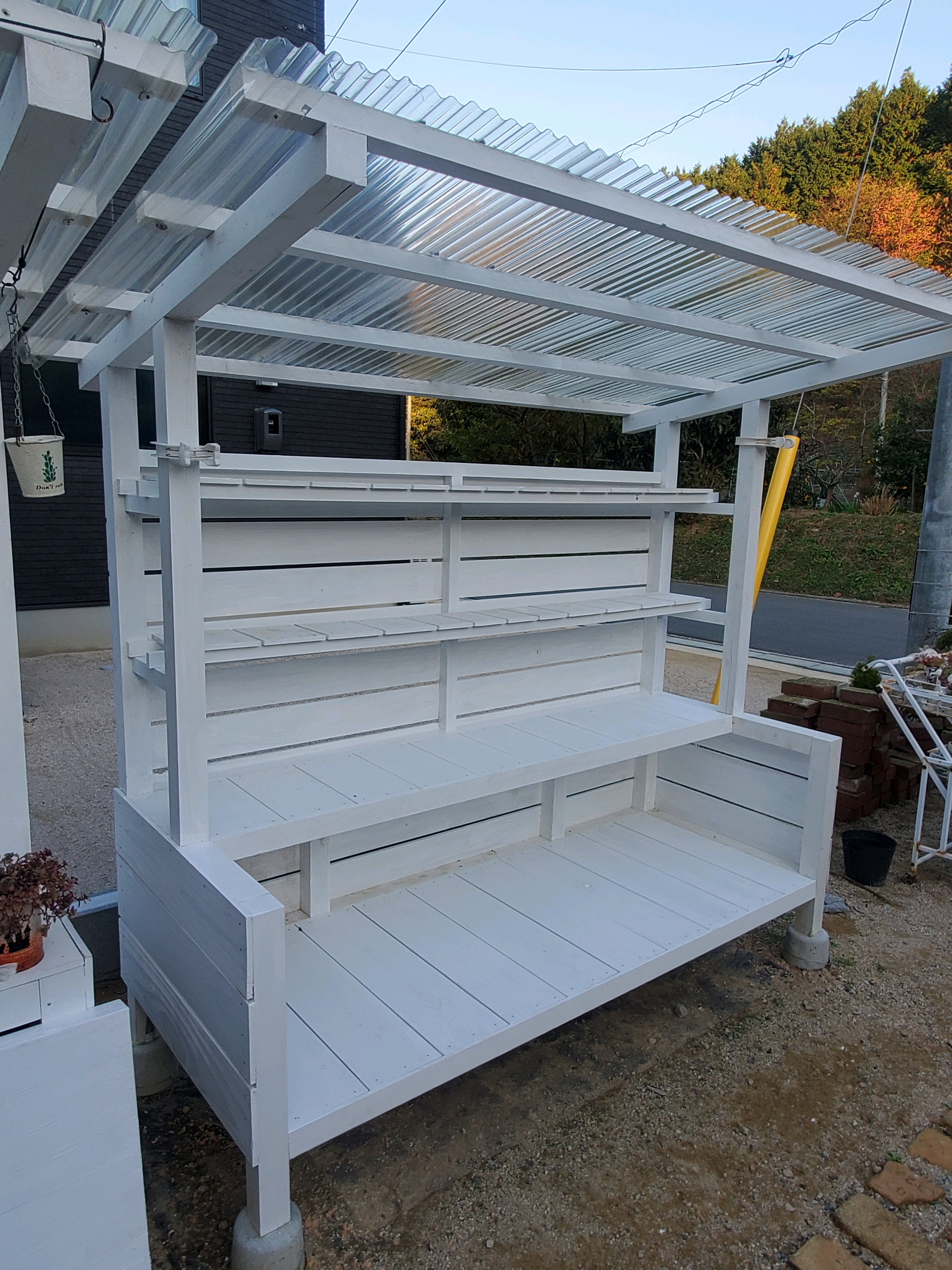 平台の部分にも並べる予定ですが、今は植え替えや寄せ植えの時の作業台に使っています😅