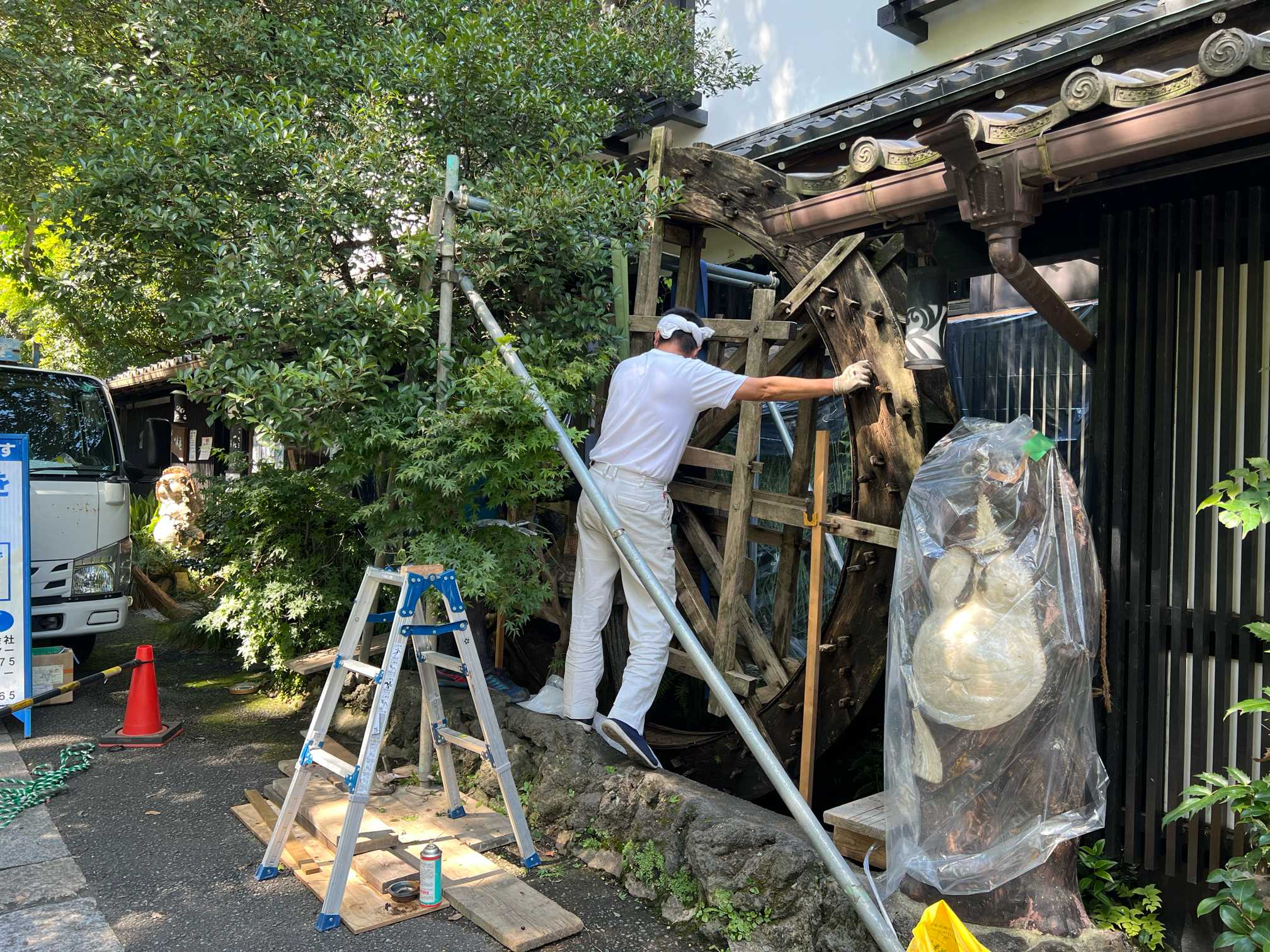 働く男の後ろ姿。惚れる。二人がかりで水車の修理中でした