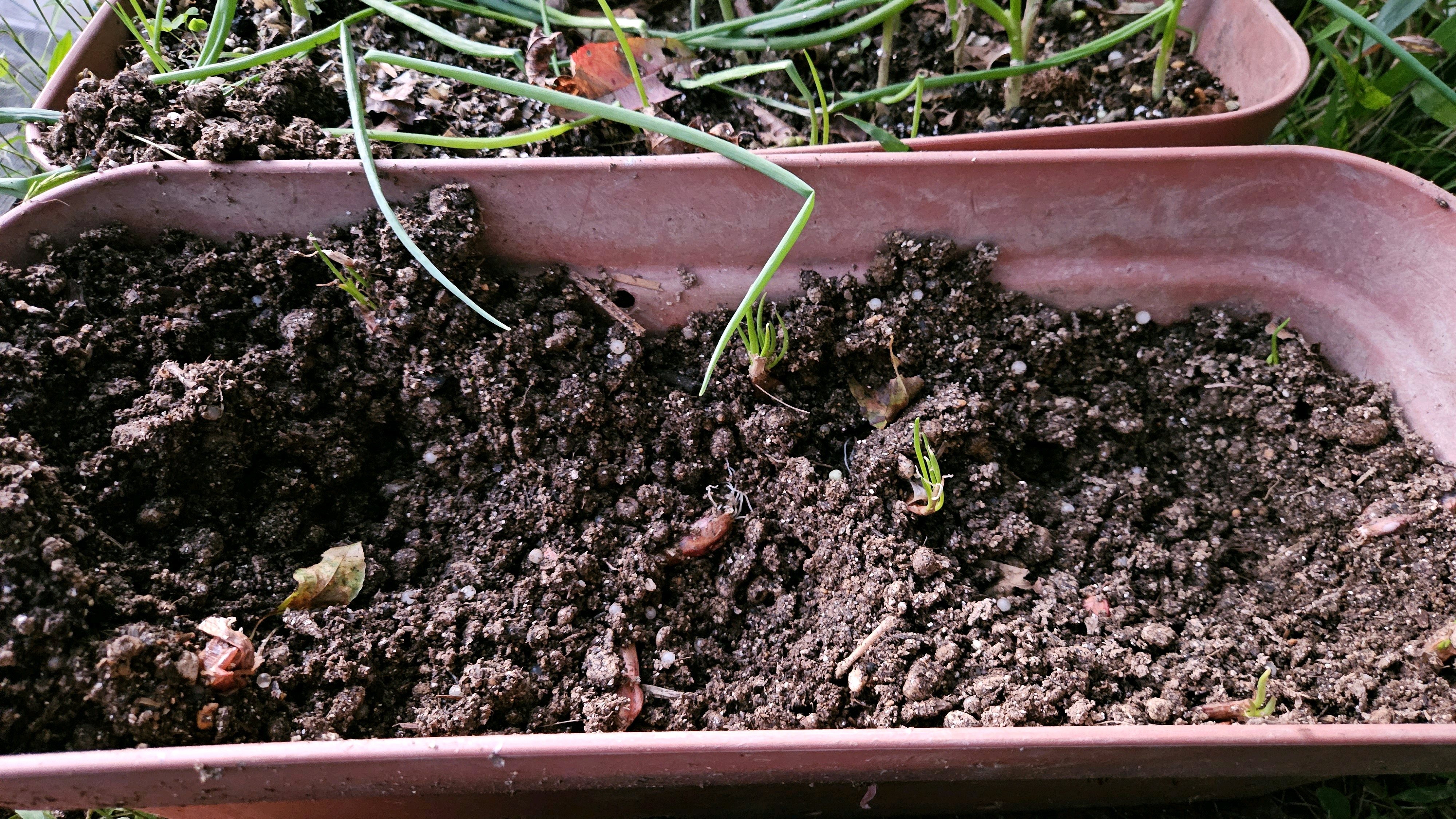 プランターのわけぎは、寒い季節なので冷害を受けて、少しずつ枯れてきています