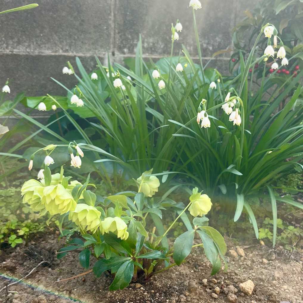 後ろのスノーフレークはここ何年か咲かなくて消えるかなーと思ってたのに今年は元気だ
