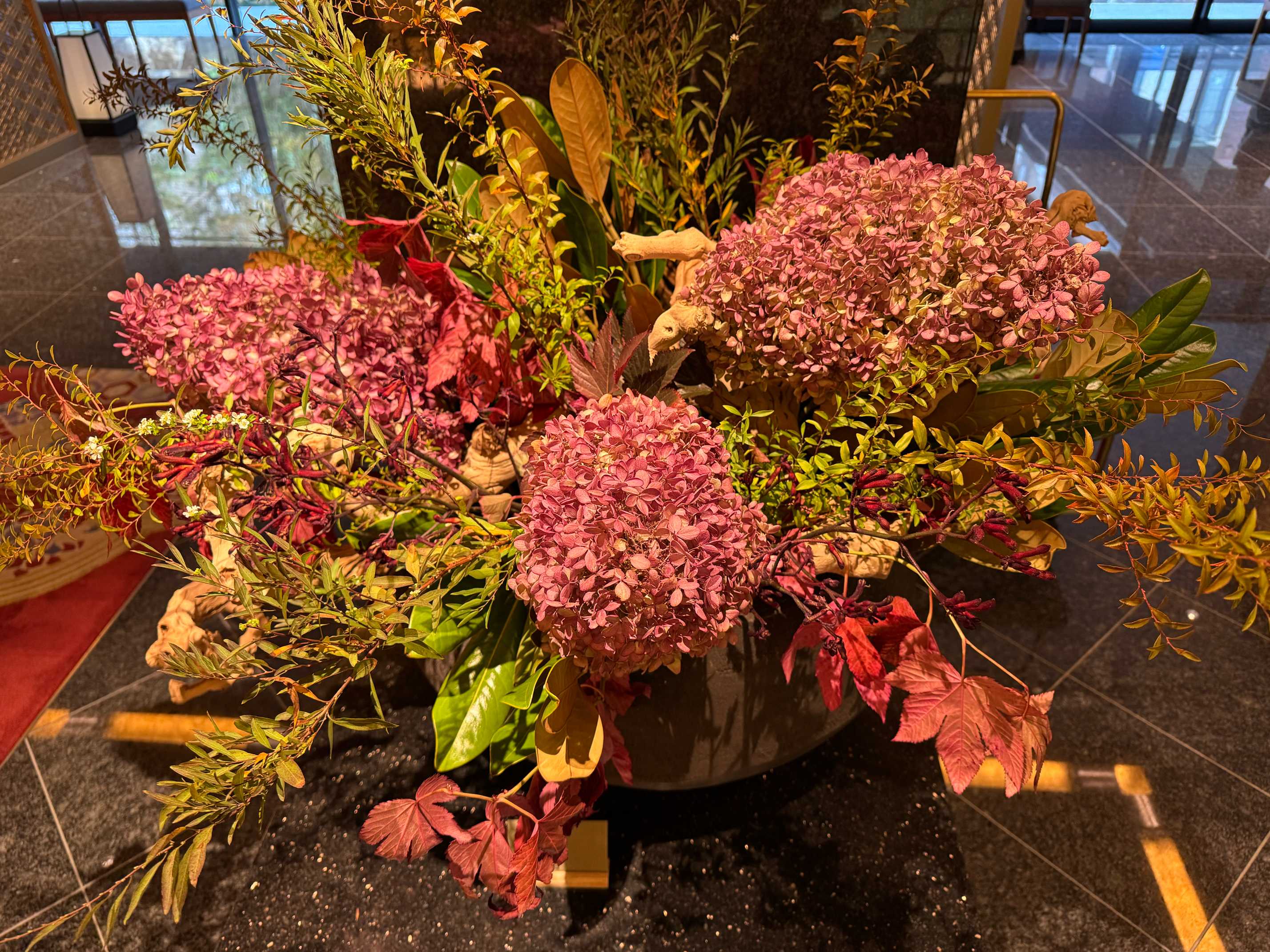 これから二連泊するホテルに荷物をあずけに。秋っぽいアレンジが飾られていました🍁🍂