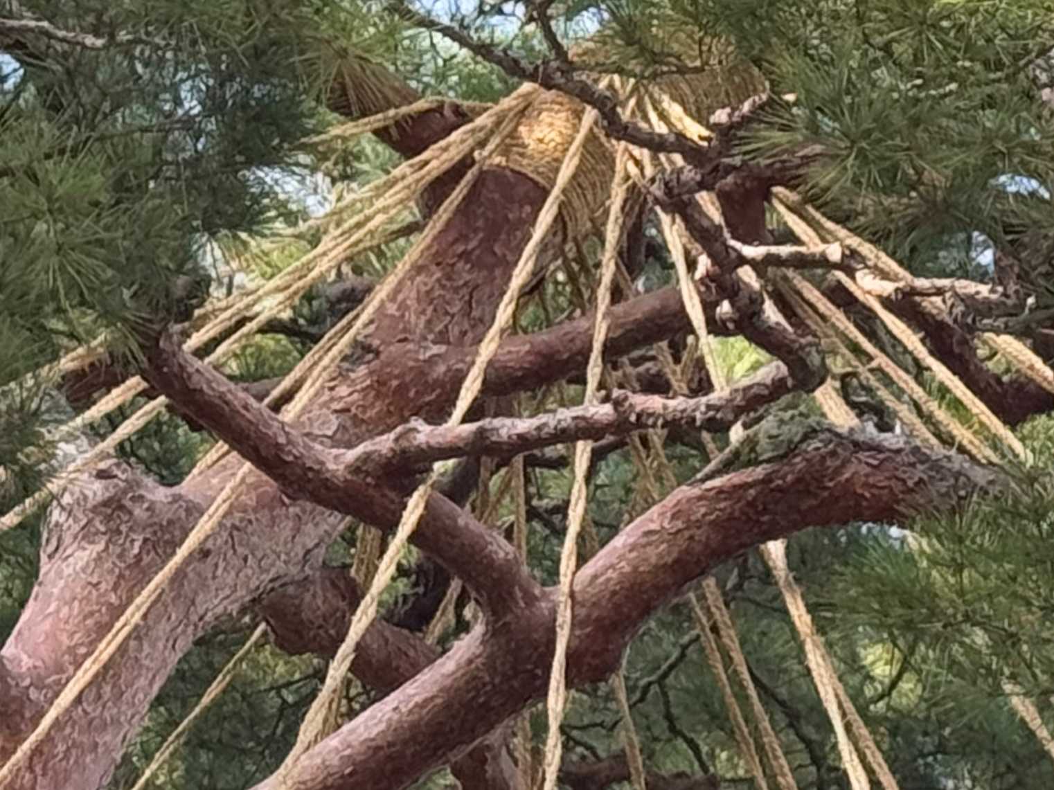 雪吊りの樹木を下から覗き込むと、各枝を吊った縄が中心の幹の上部に集められて括られていました。