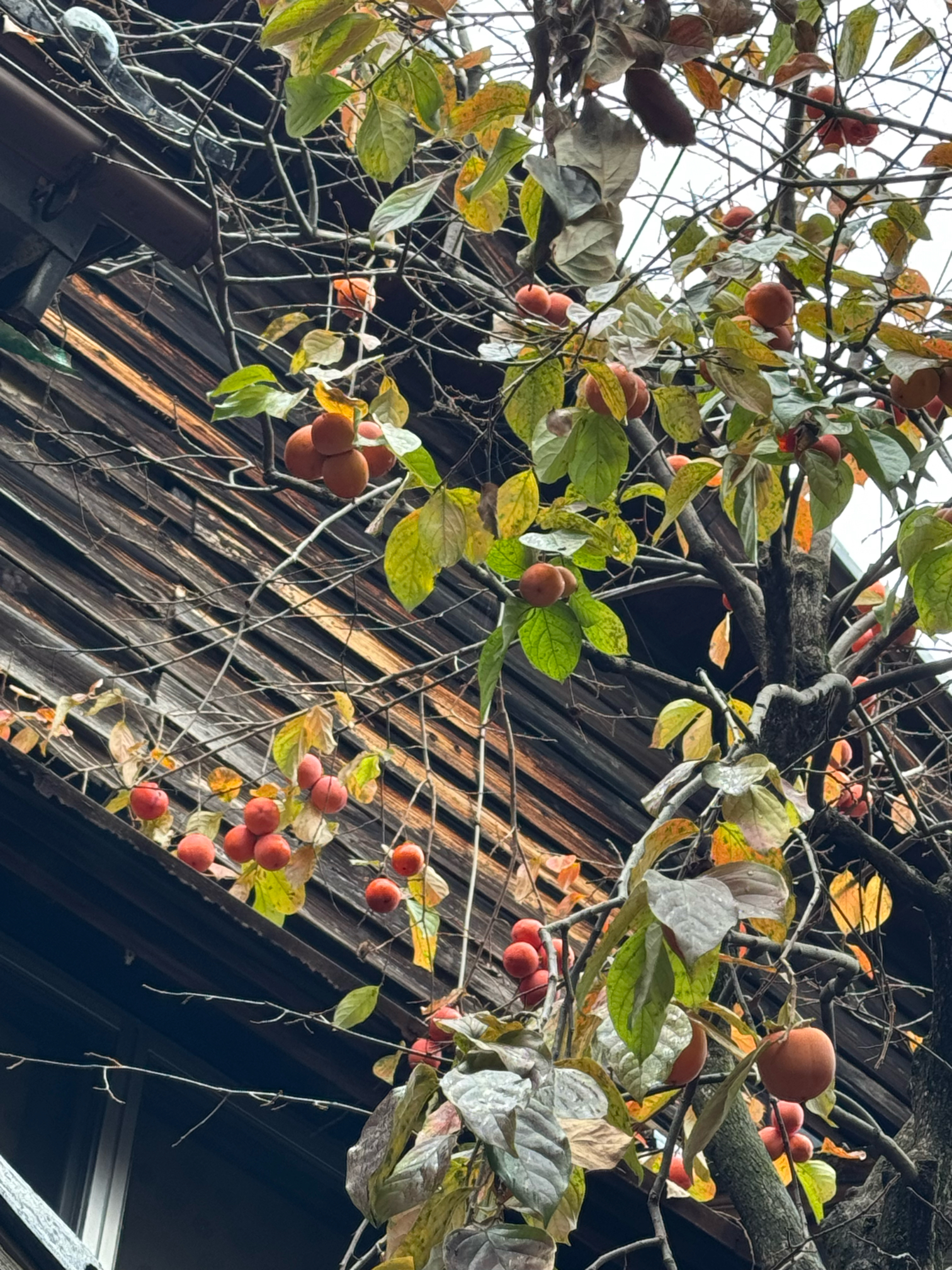 大きく尖った柿が頭上から御挨拶┏○ペコッ