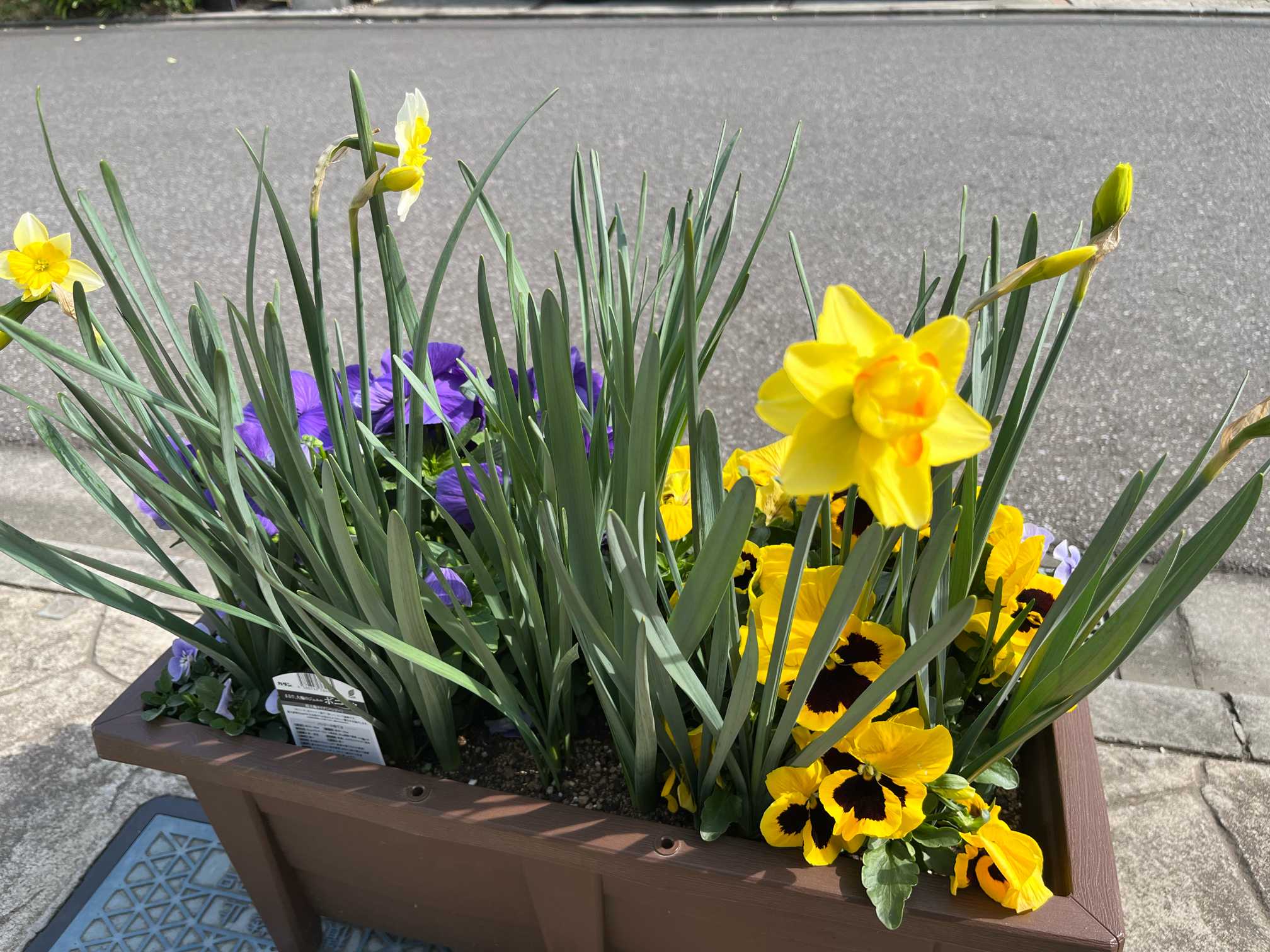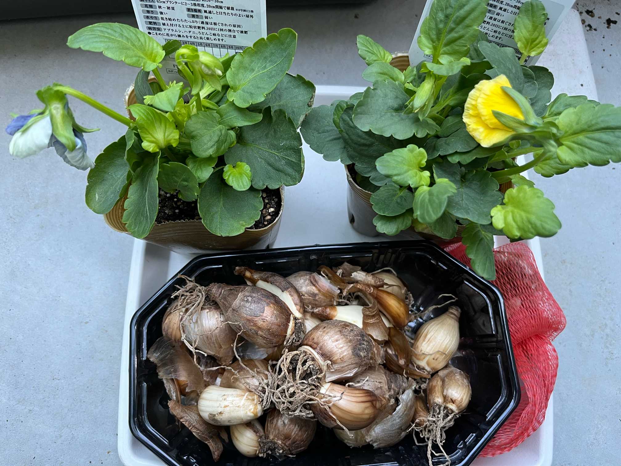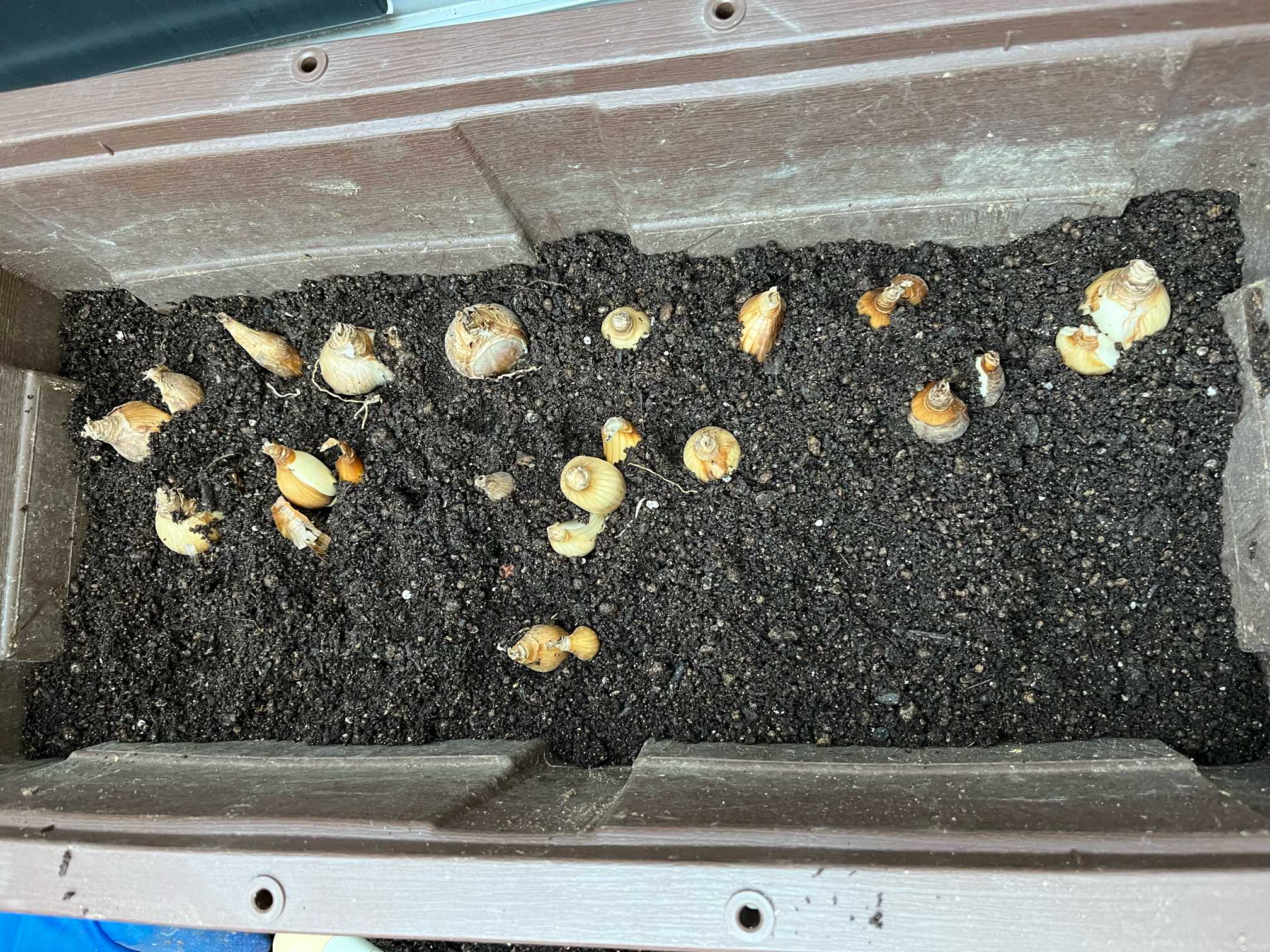 プランターが大きめなので、夏前に掘り上げていた水仙の球根を一緒に植え付けます😄
