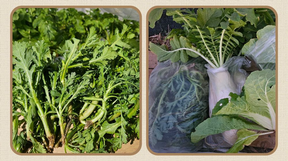自宅の持ち帰り用と、職場の同僚用で春菊と大根たくさん持ち帰りしました