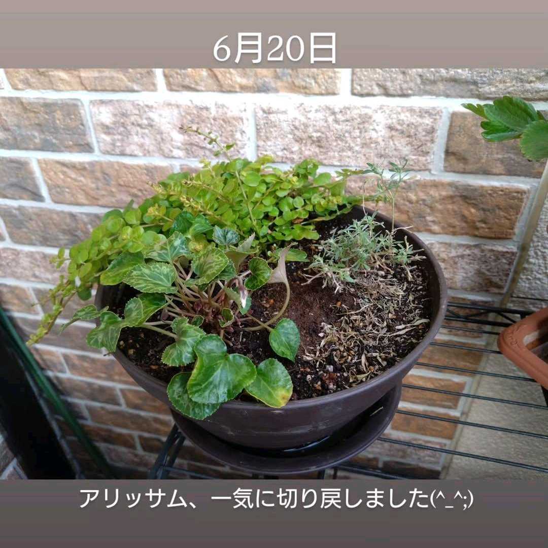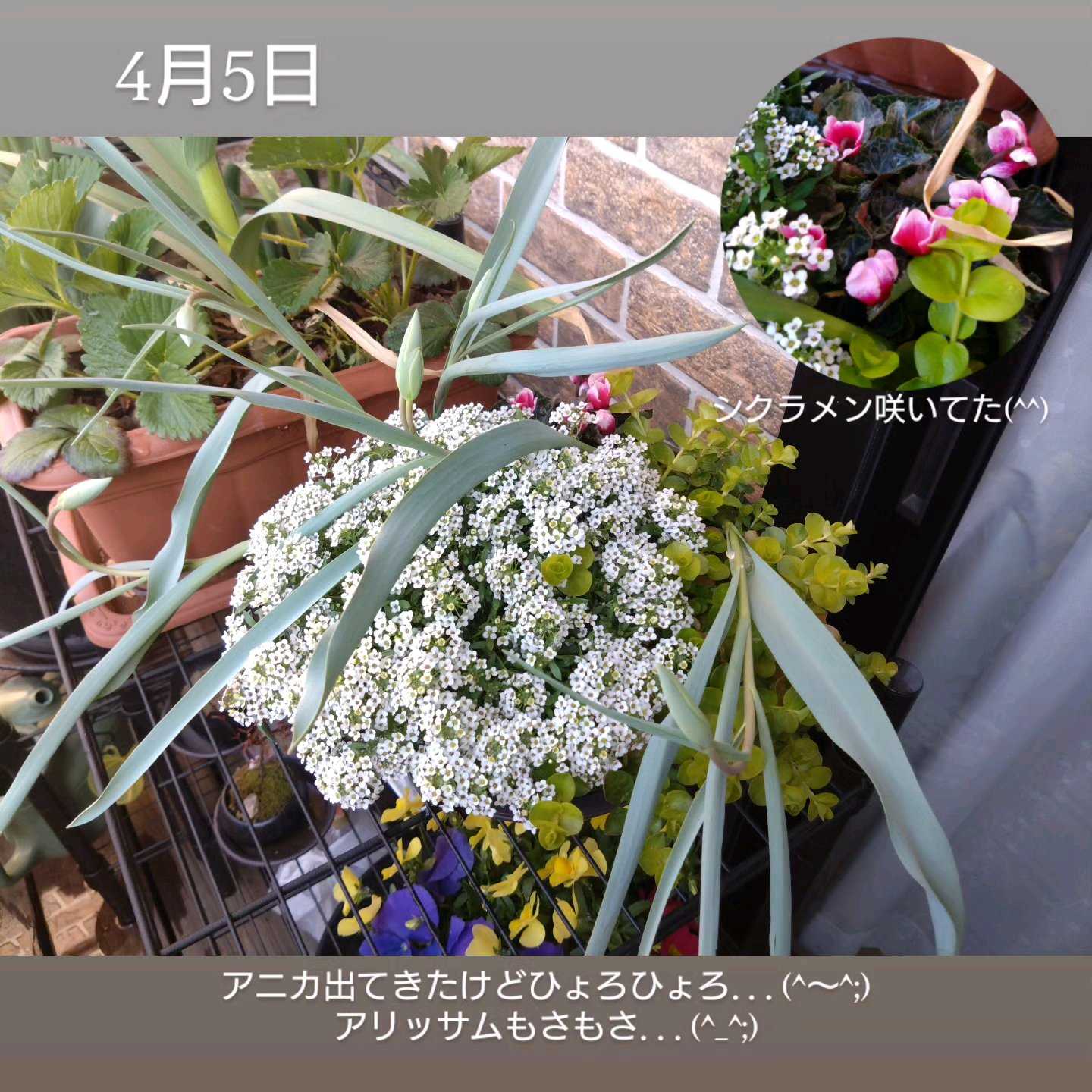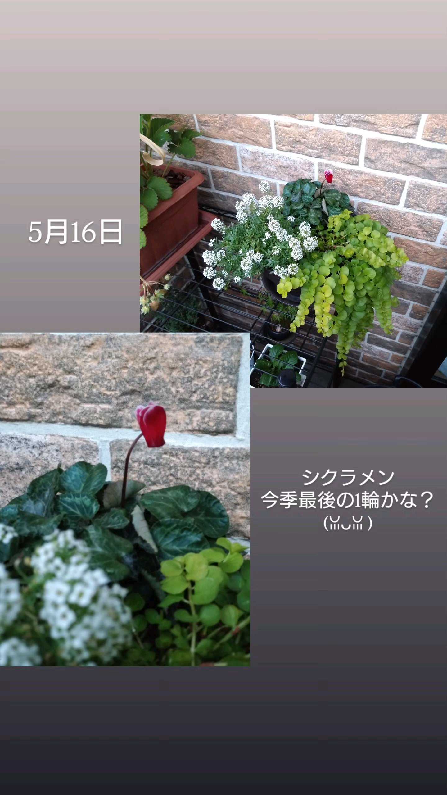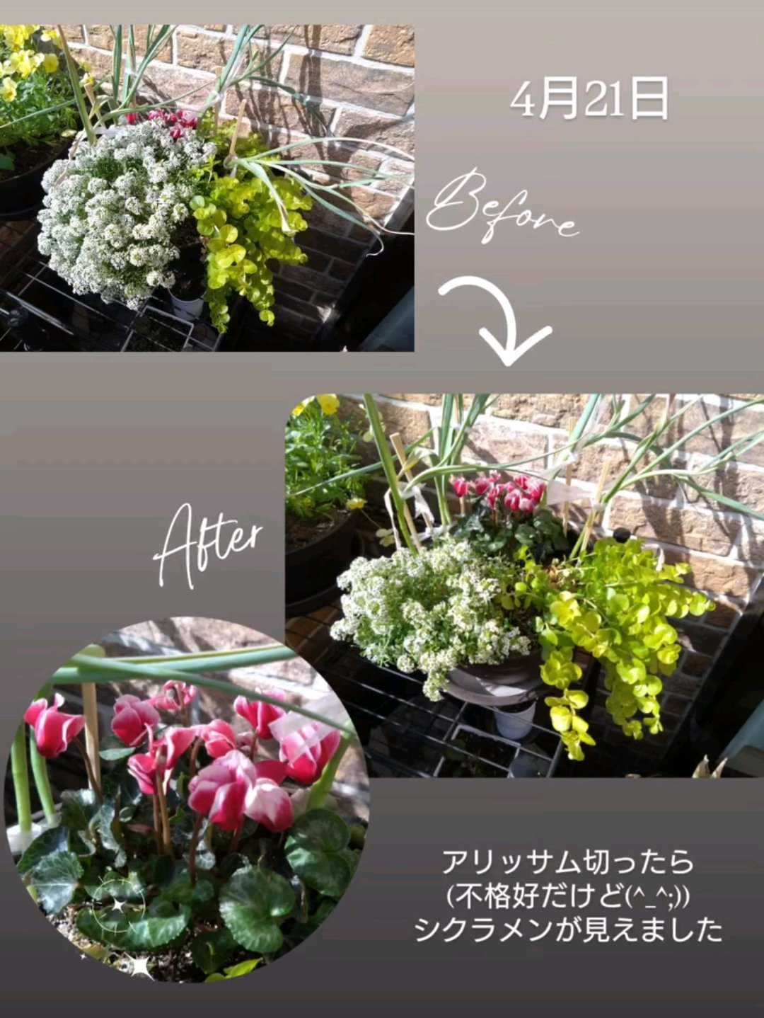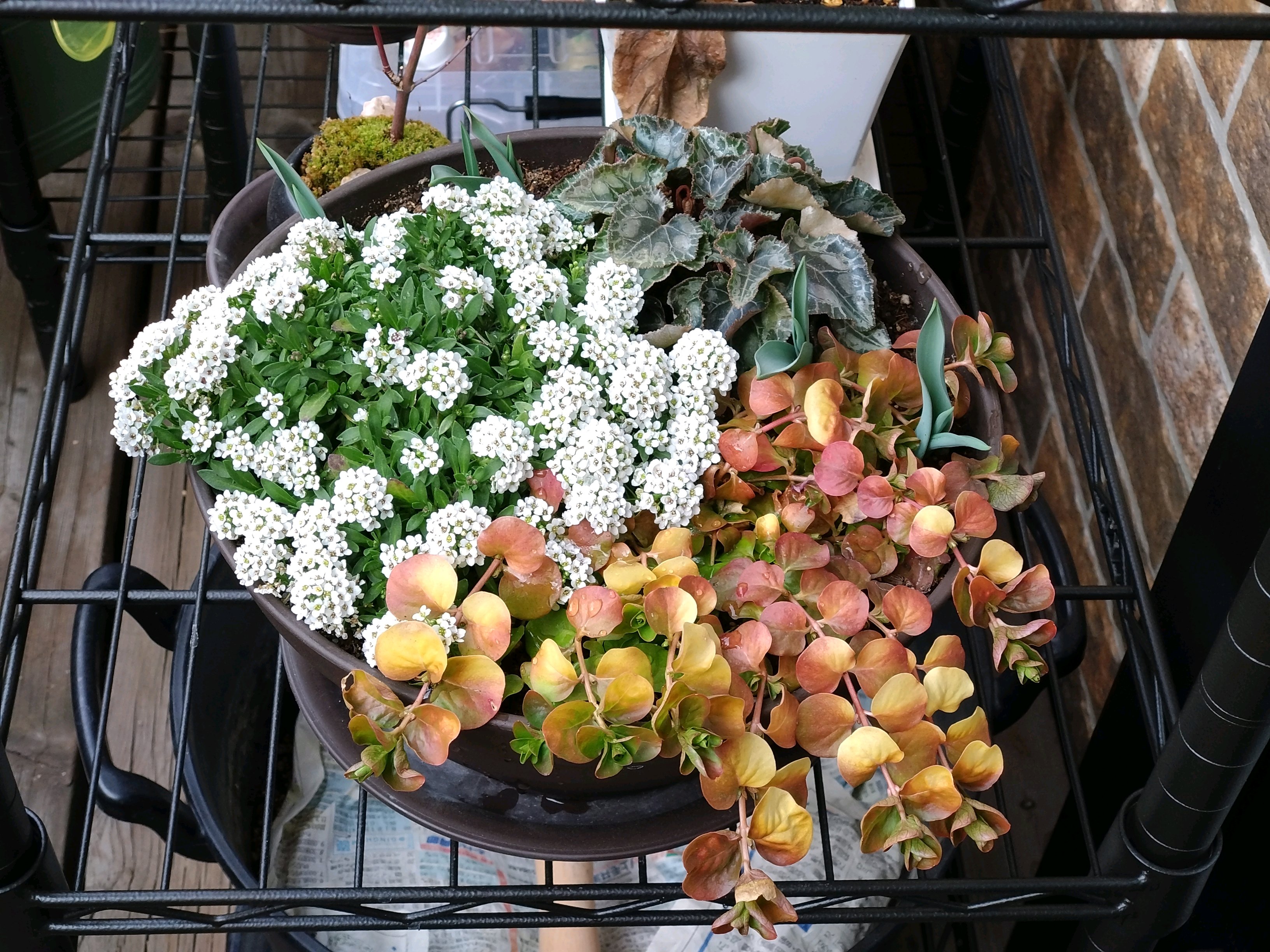 ガーデンシクラメン、アリッサム、リシマキア、アニカの寄せ植えです。みんなで夏越しできるか心配ですが、長い付き合いになるといいなぁ…(*´ω`*)