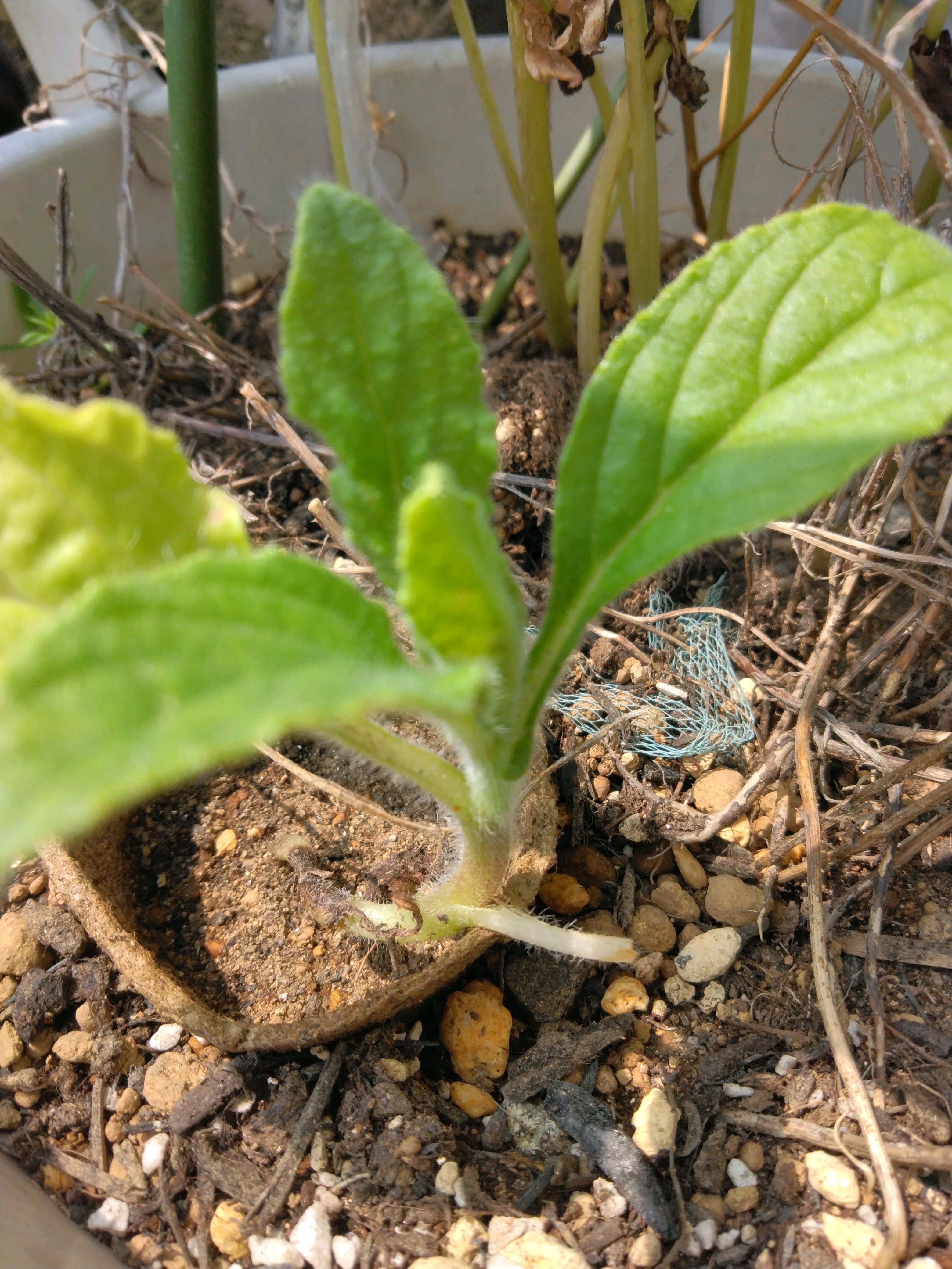 園芸店から種を見つけたのは’21.秋頃、袋の全量撒かずに1/3だけ撒いてみた、発芽はしたが、その後移植したら、行方不明に😭葉の姿はどのような姿か?初めての植物でしたから確認できませんでした。 ’22.春に2度目種蒔き、またもや、行方不明に私の住まいの地域はすり鉢状の平地、強風の通り道 行方不明は沢山居なくなる、時は過ぎて秋になり葉と植物名が結びつく、のを発見🧐❣️