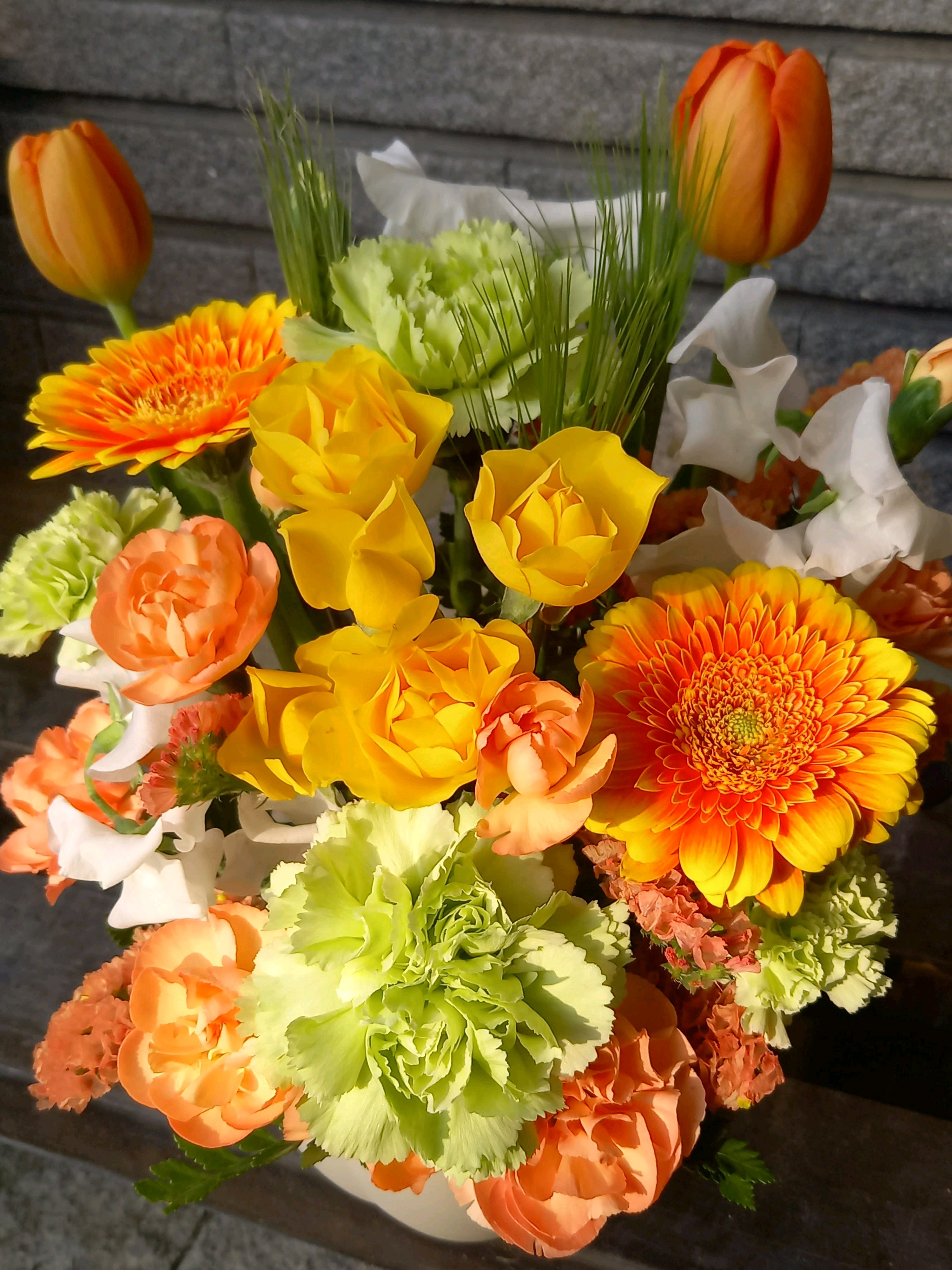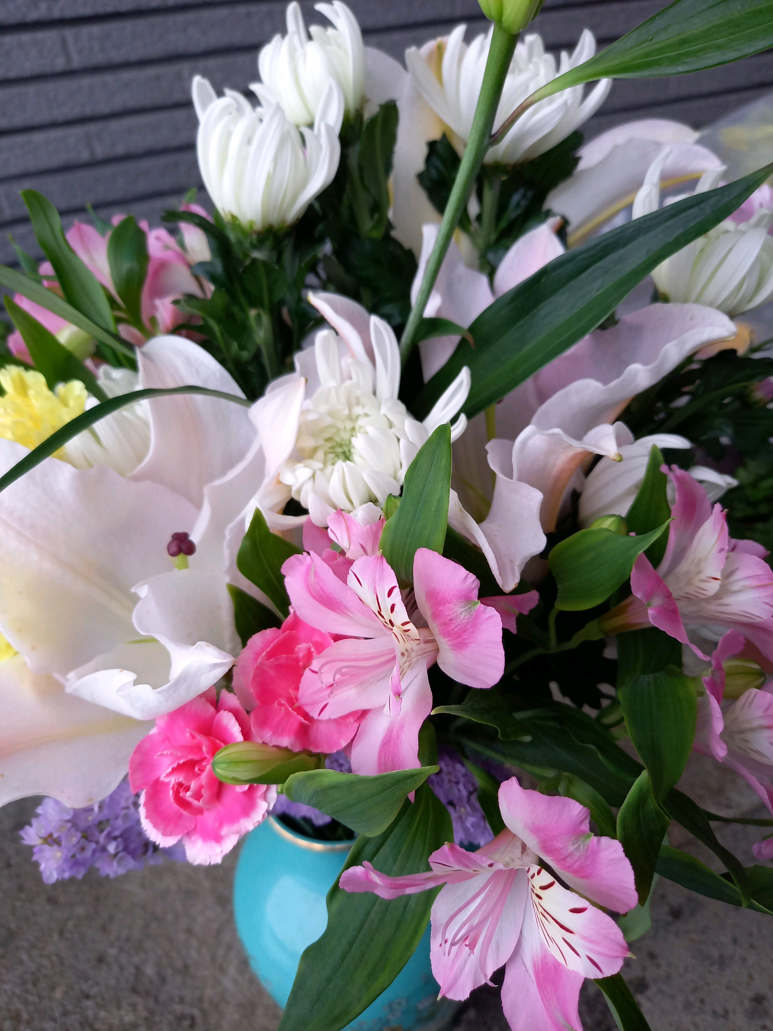 カサブランカ、キク、アルストロメリア、カーネーション、スターチスなど
