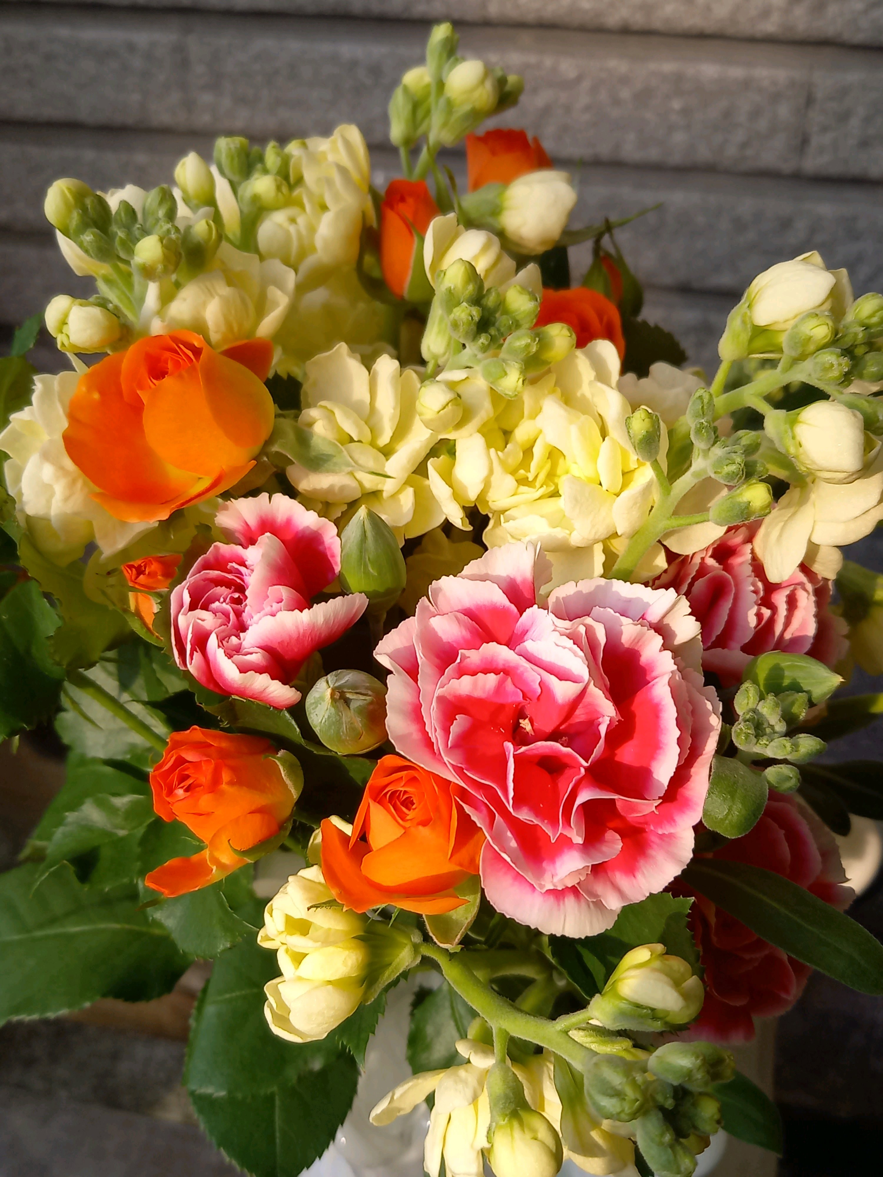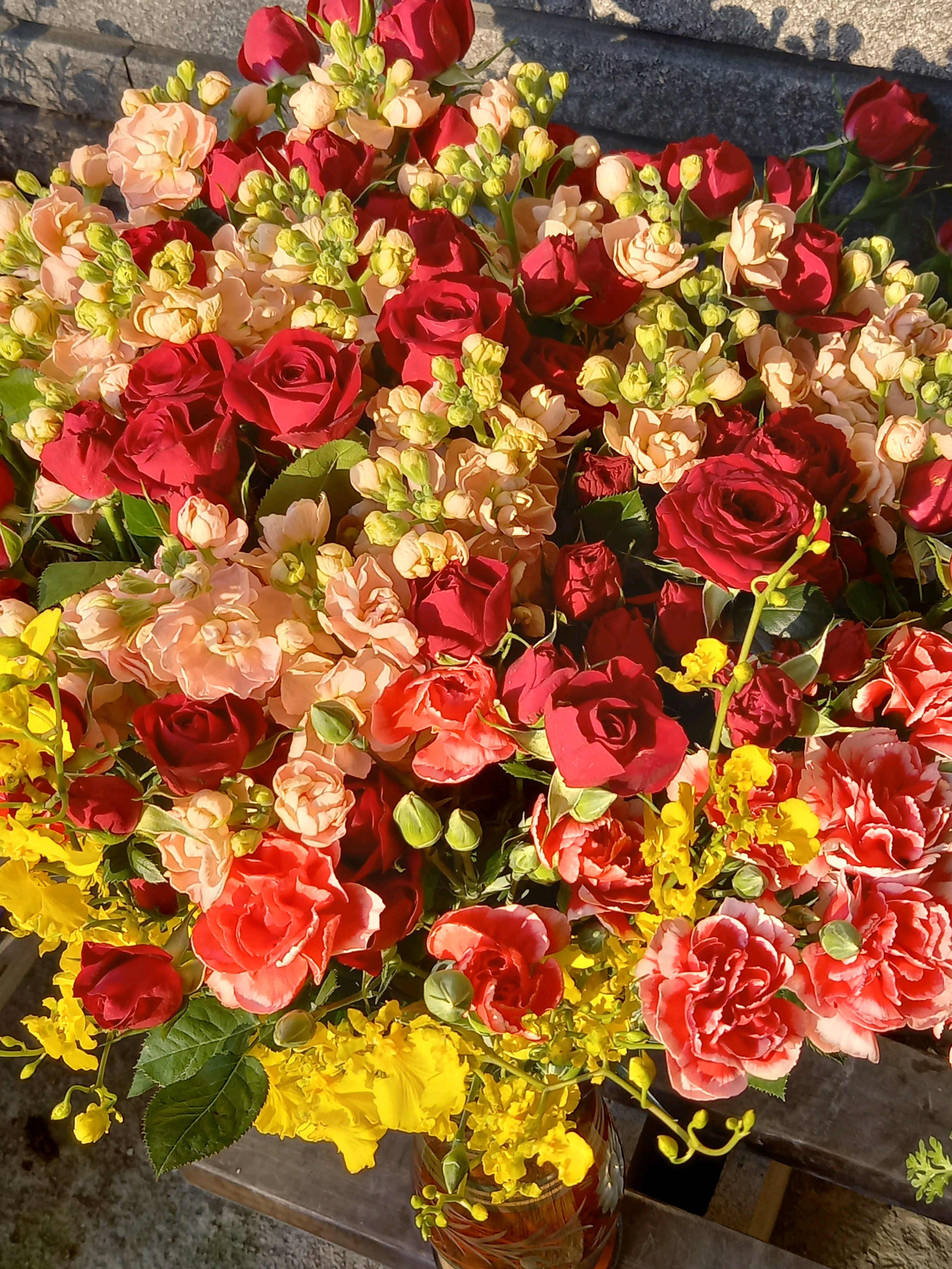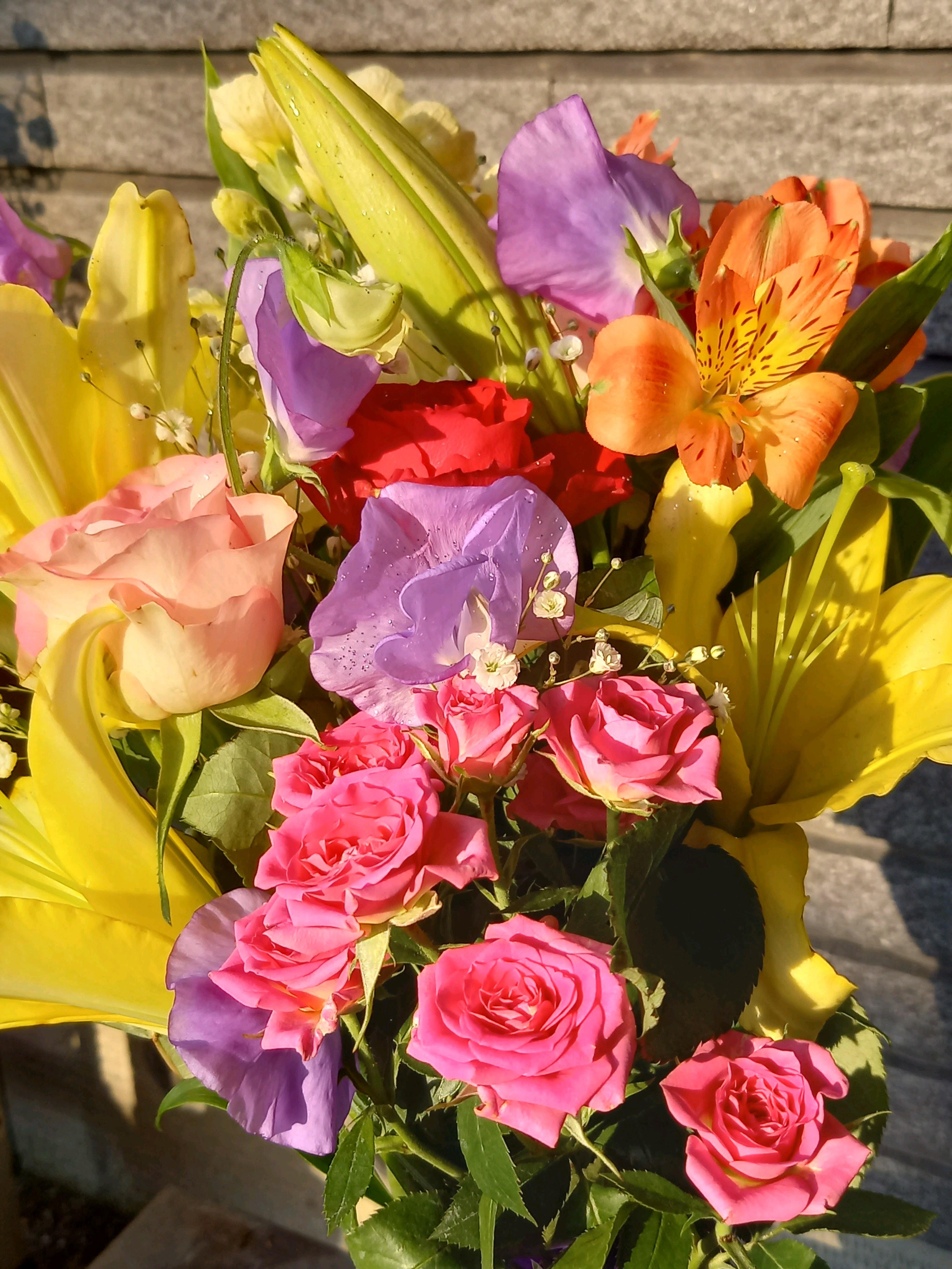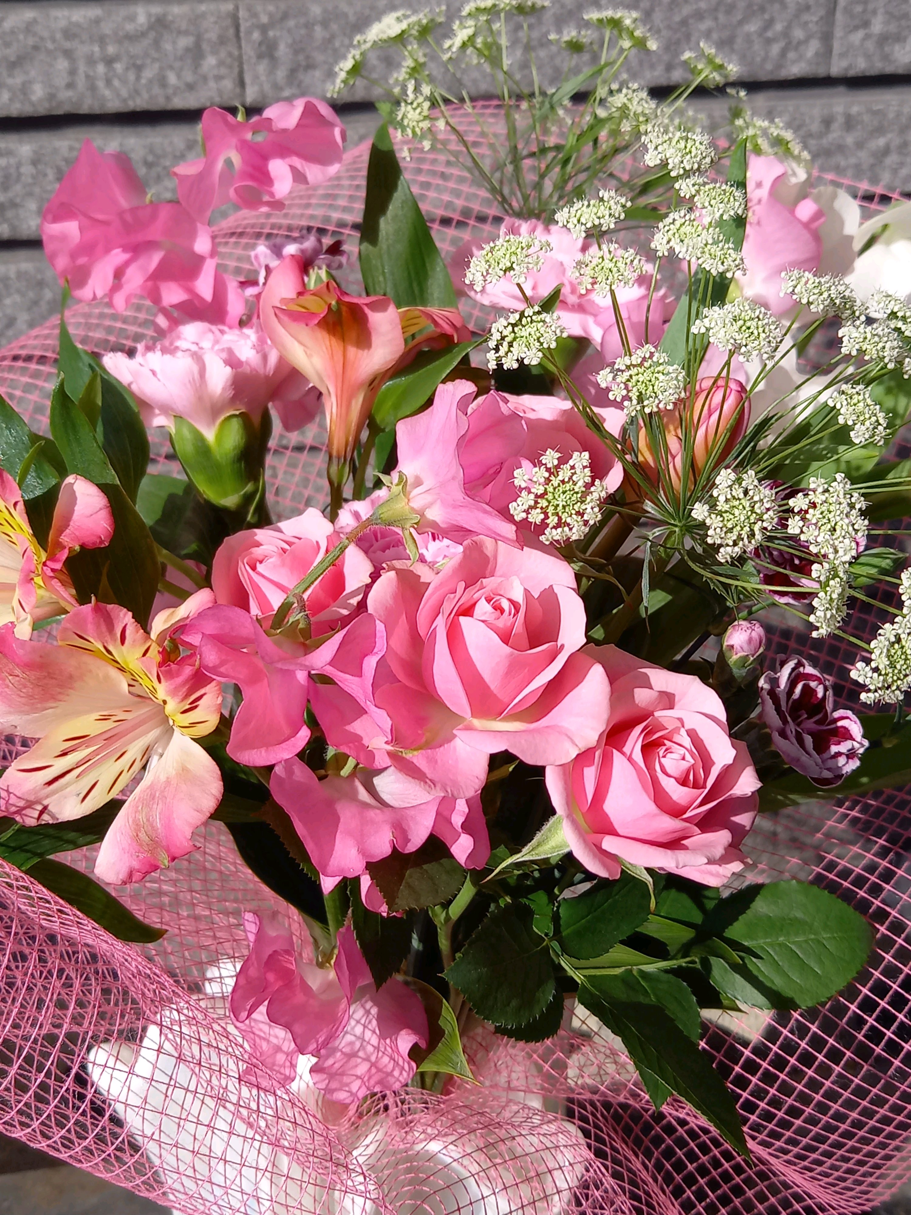 バラ、アルストロメリア、カーネーション、スイートピーなと