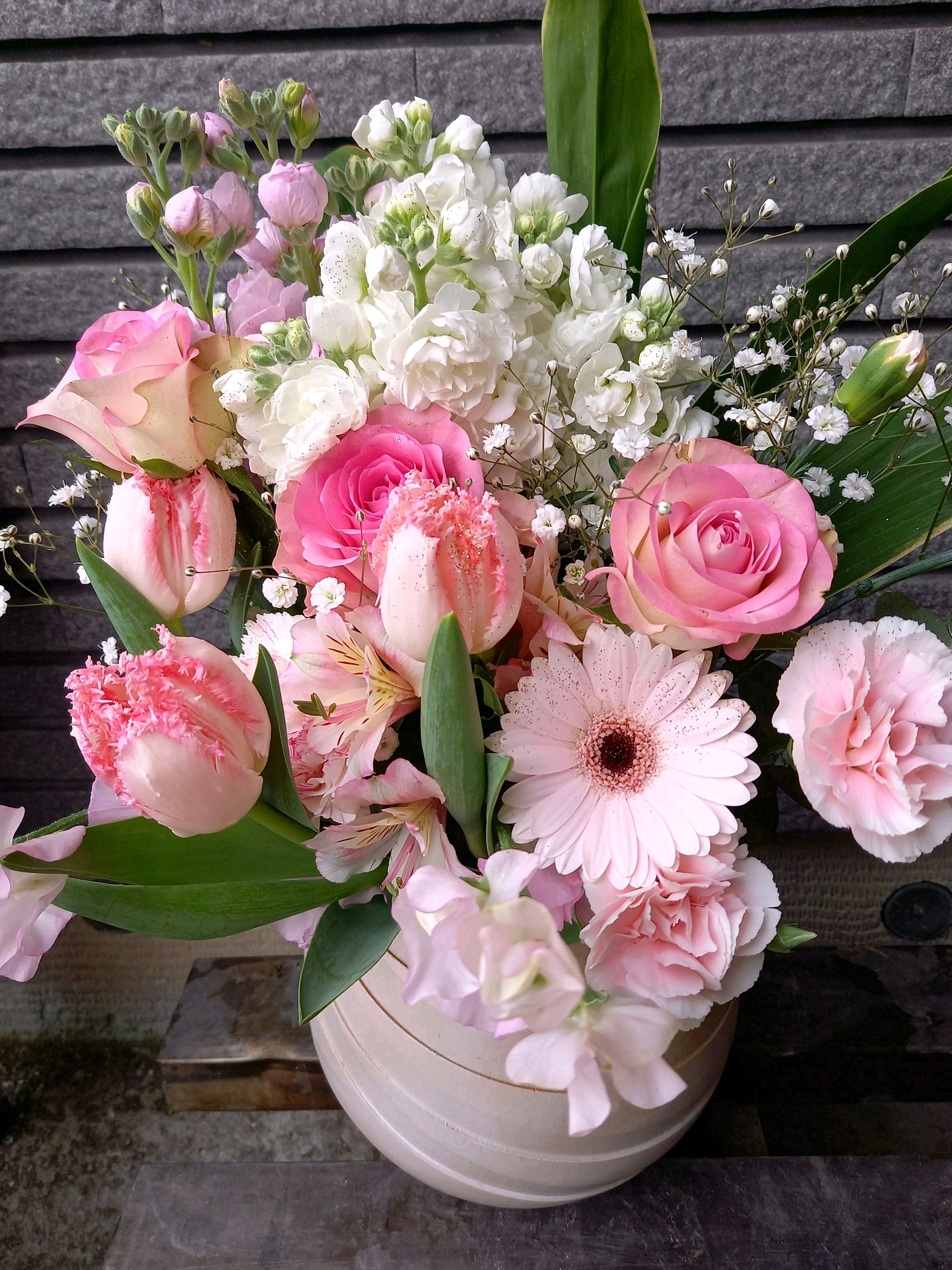ガーベラ、カーネーション、バラ、ストック、カスミソウ、スイートピーなど