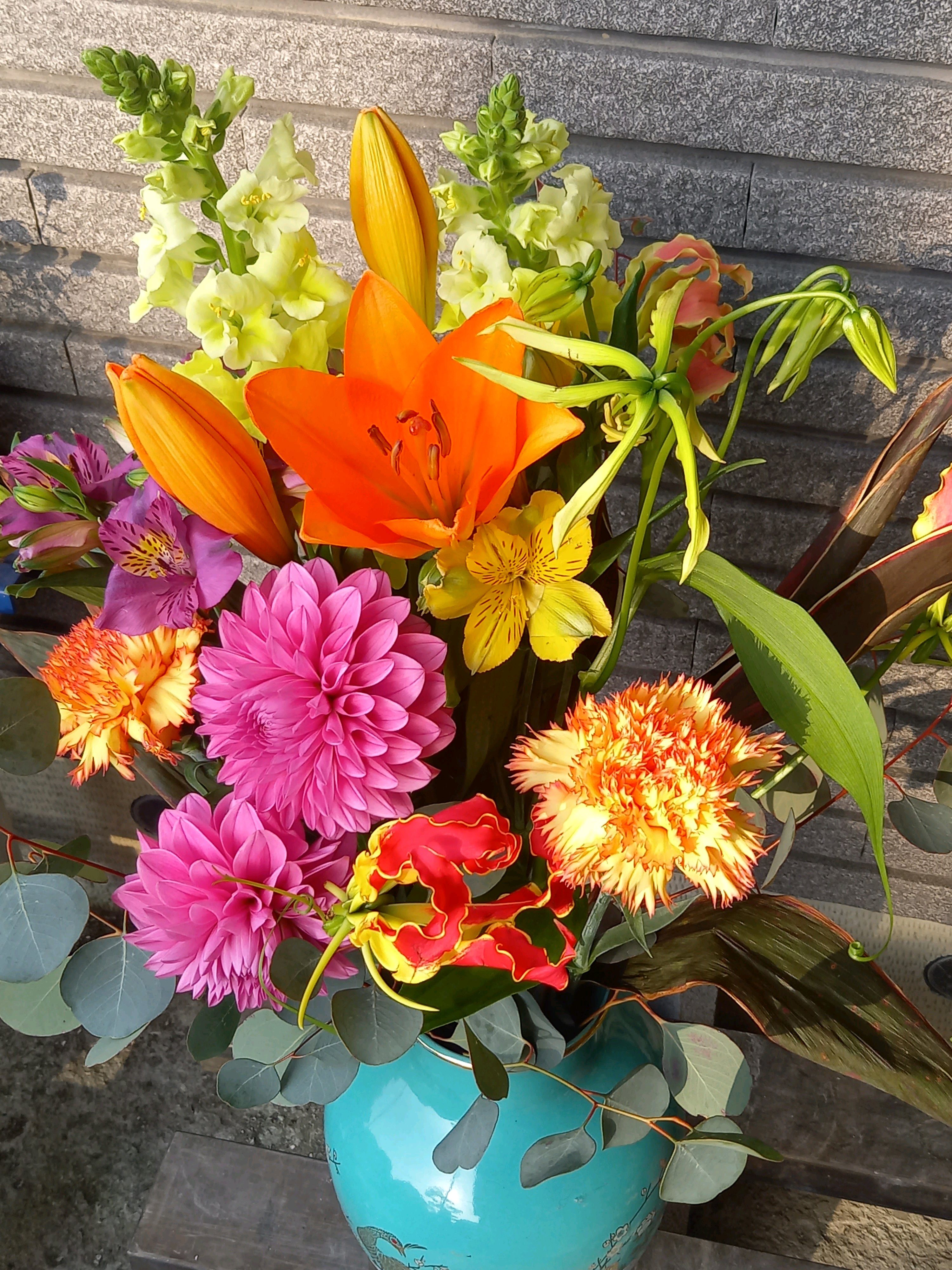 ダリア、グロリオサ、ユリ、カーネーション、アルストロメリア、ストック、ユーカリなど