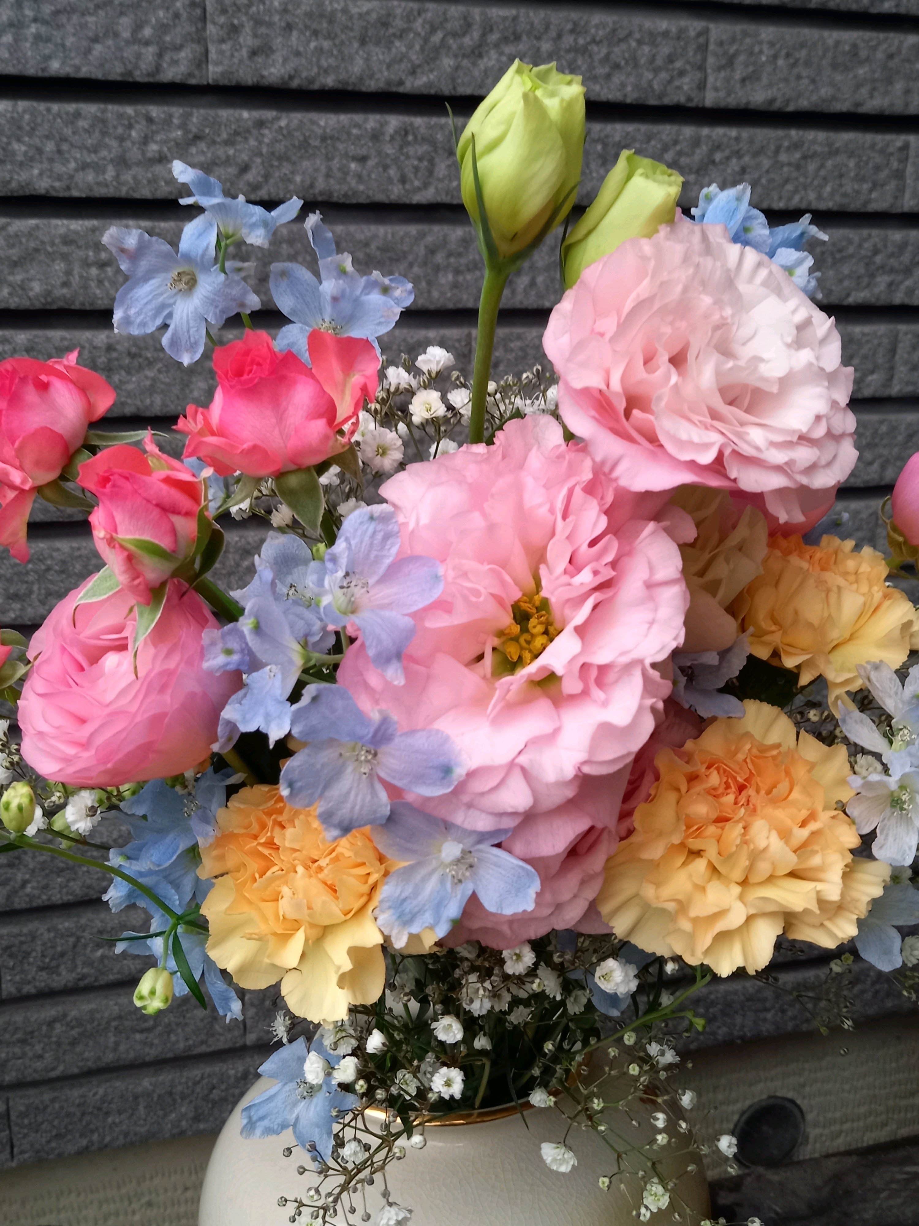 カーネーション、バラ、デルフィニウム、カスミソウ