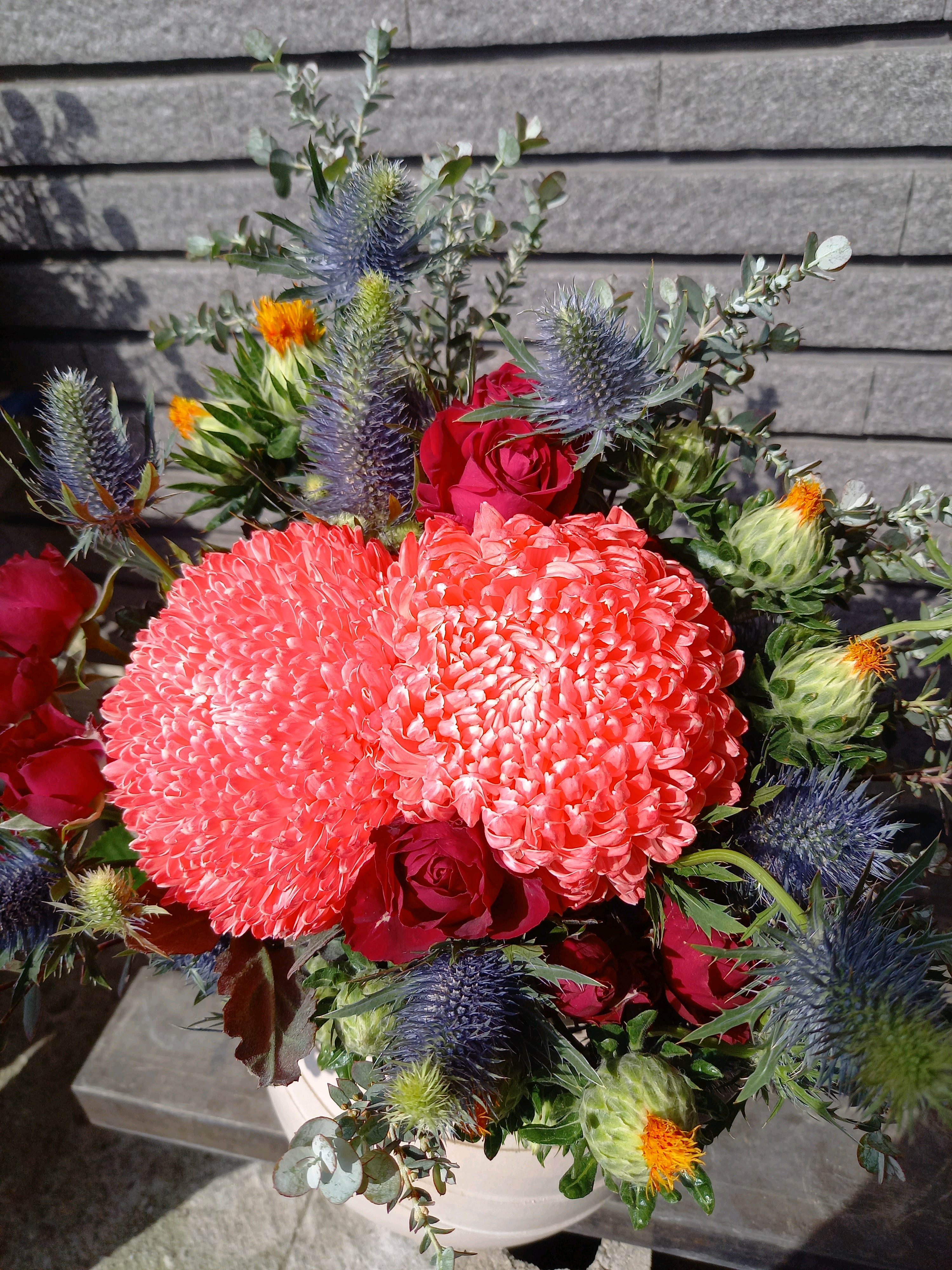 カラーリングマム、ベニバナ、バラ、エリンギウム、ユーカリグニーなど