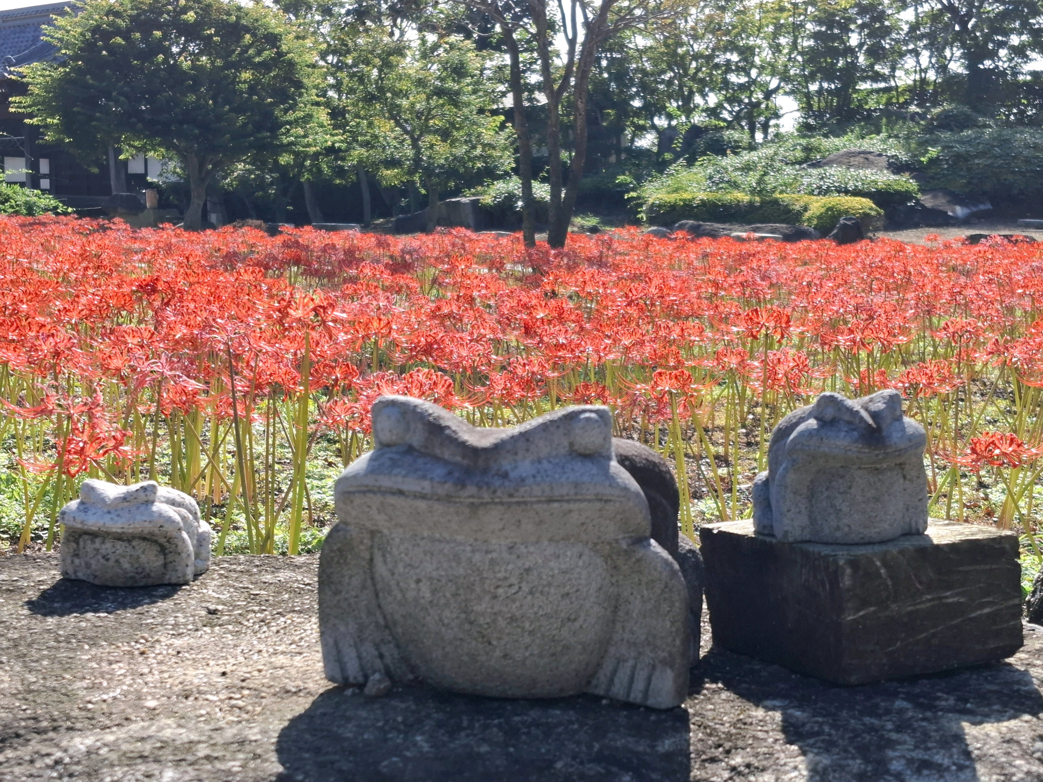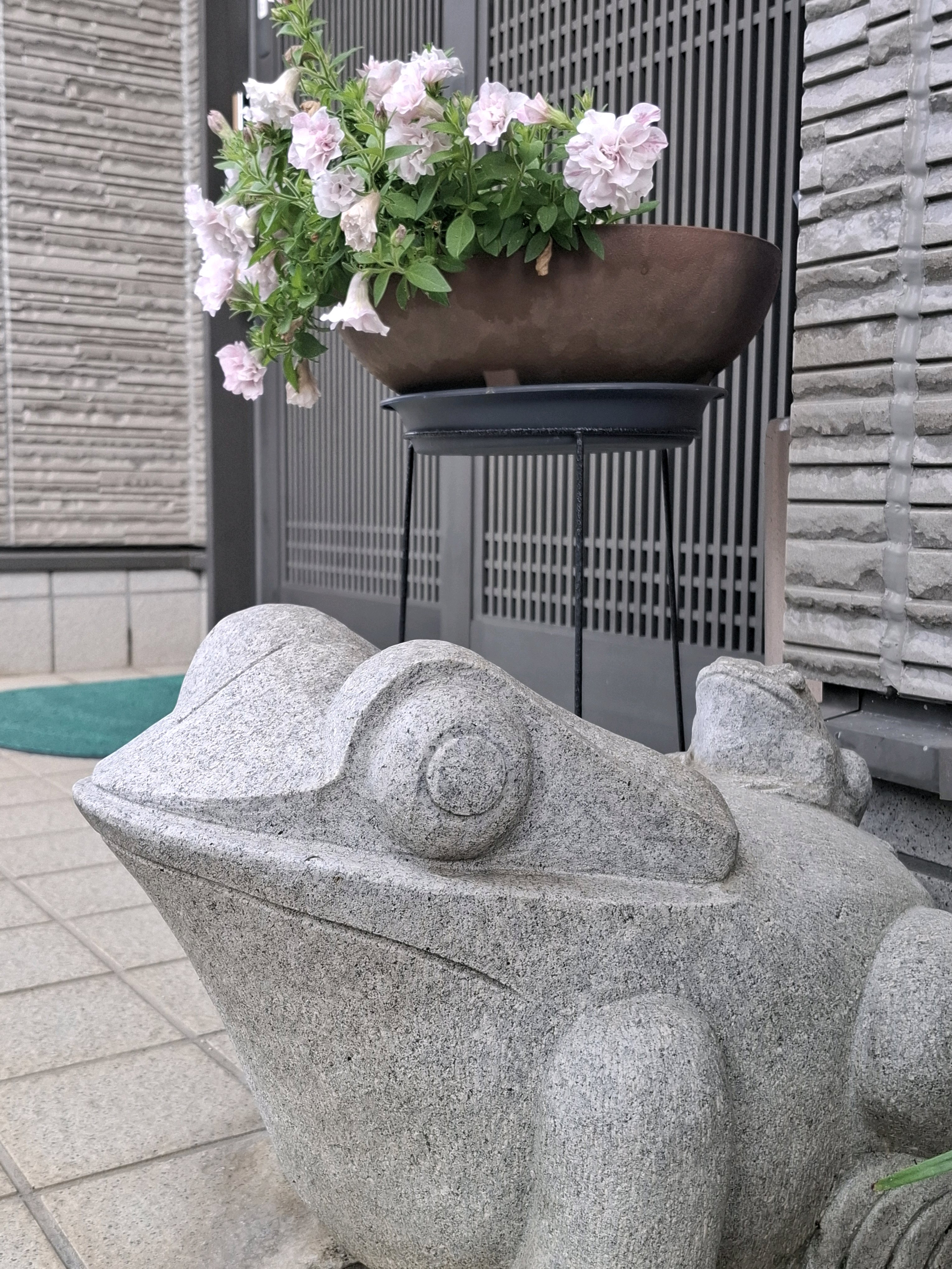 2025年10月の玄関前の写真。大きなカエル🐸の親子が玄関前にあるんですね~💓ペチュニアも元気に咲いてる。