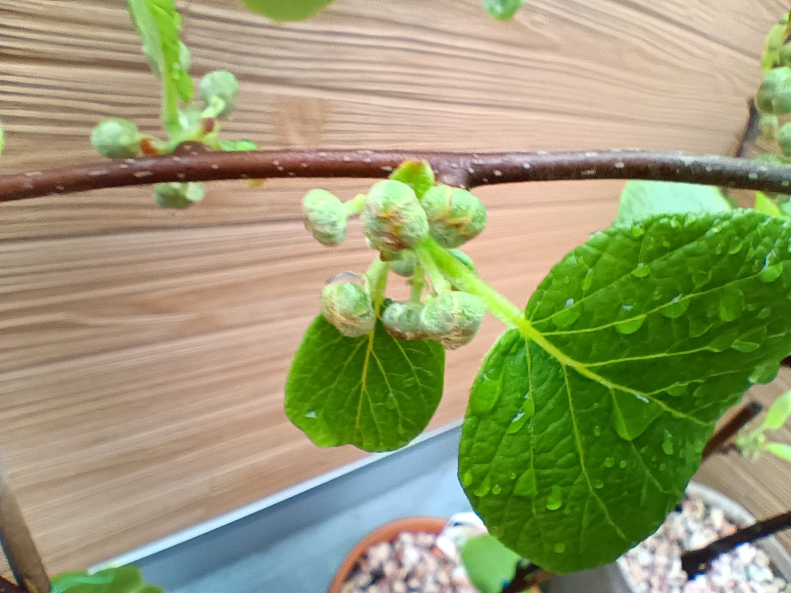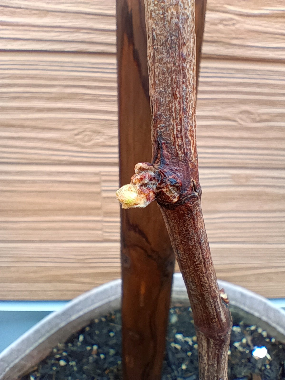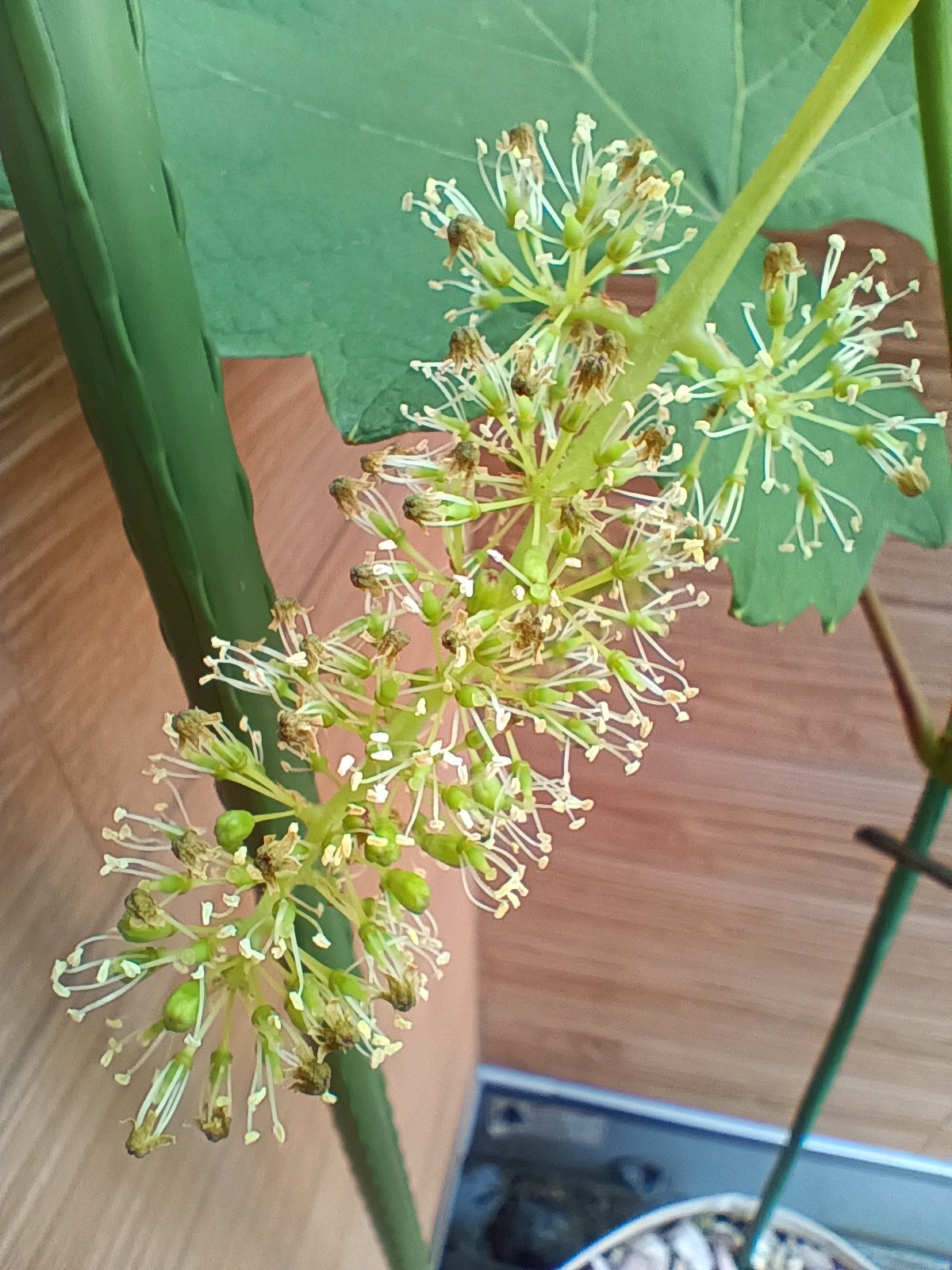 幹(鉢の真上に垂直に伸びている部分)から成長の早い芽が伸びていて房も見えています。