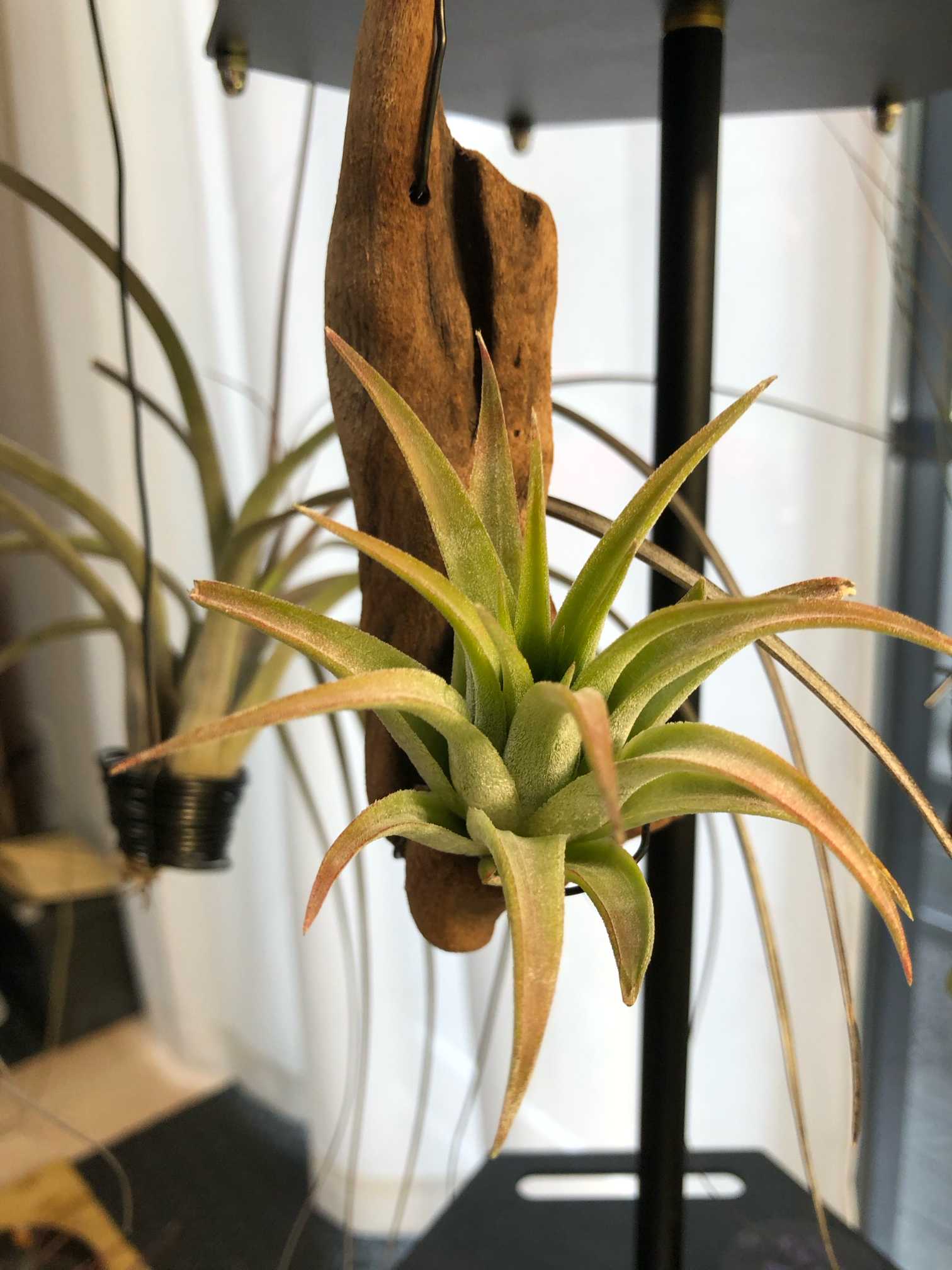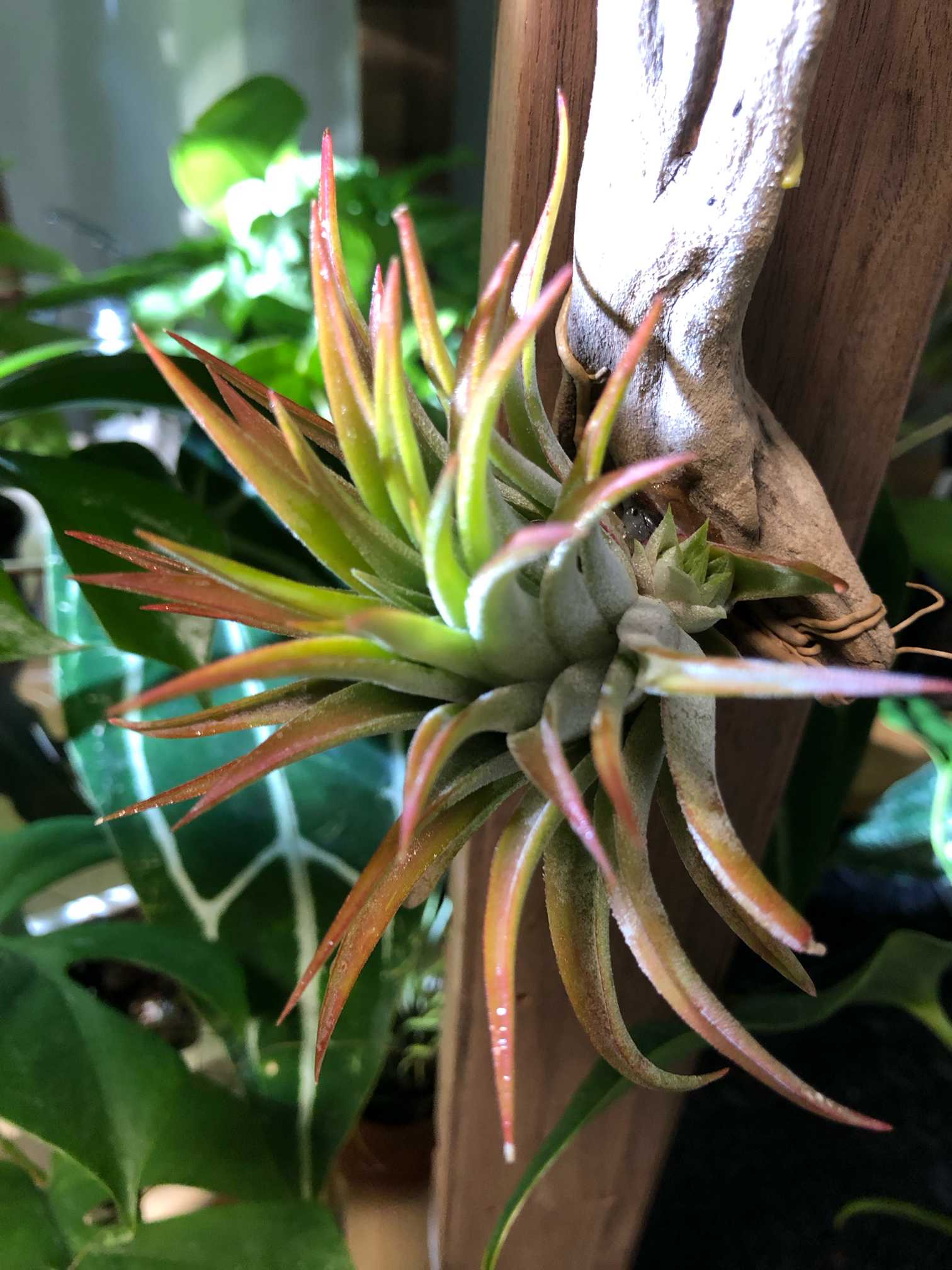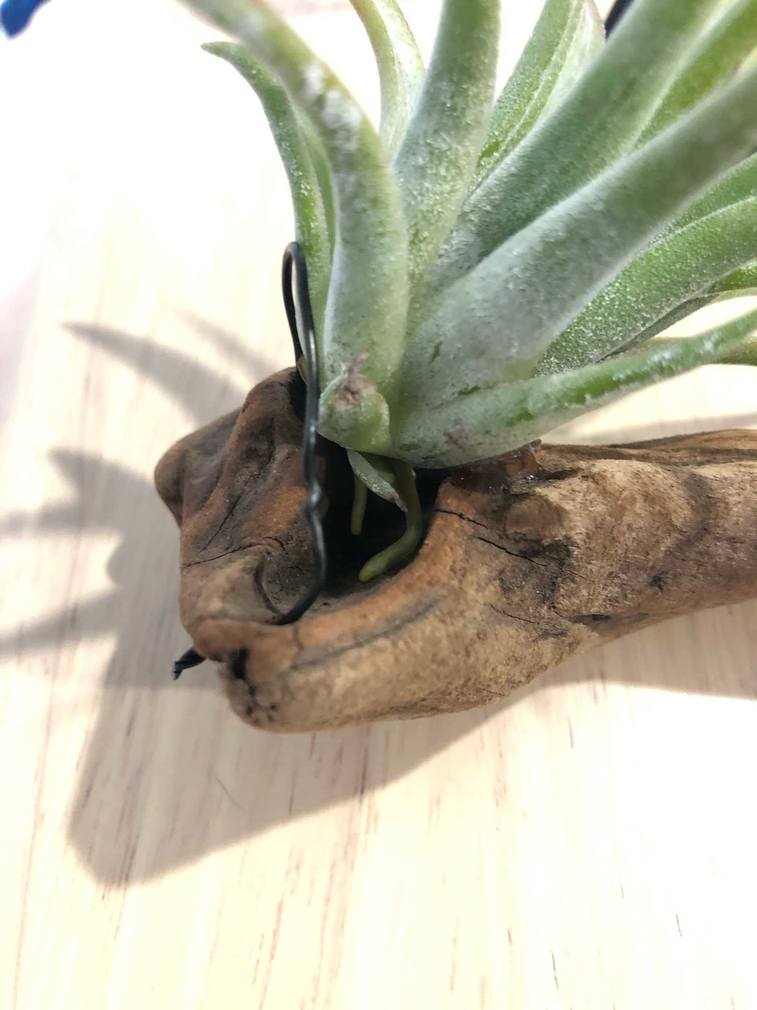 葉を折りたたんで発送しているとの事なので、展開しやすいように、流木に固定せず、針金で台座を作って落ちないように乗せる感じで優しく設置。なかなか大きくなる品種のようなので、将来が楽しみです😊