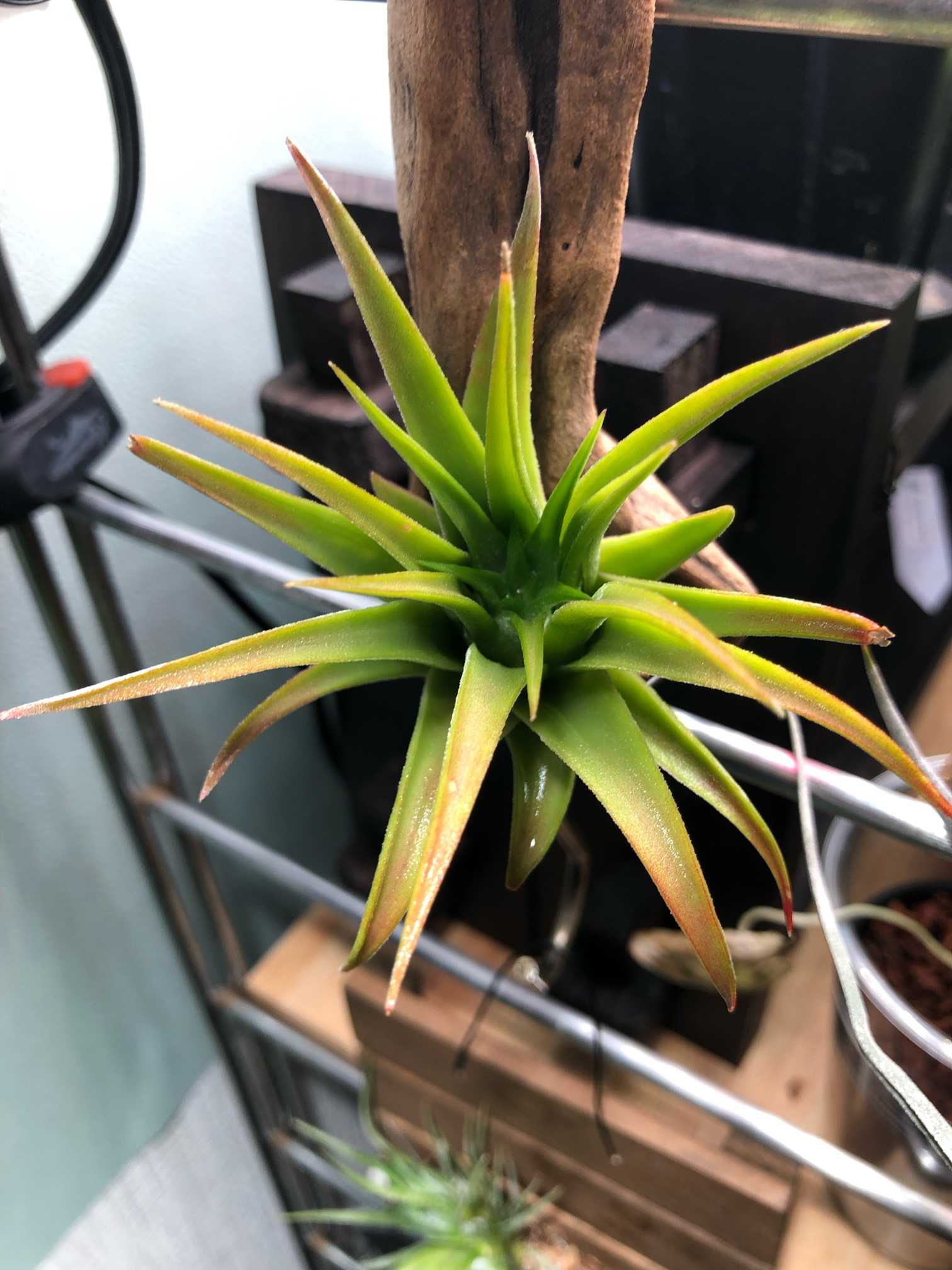 もっと水をくれと言わんばかりに葉が開きました。今の環境は毎日朝晩水やりがベスト。他のティランジアも同じ量の水やりで調子良さそう。