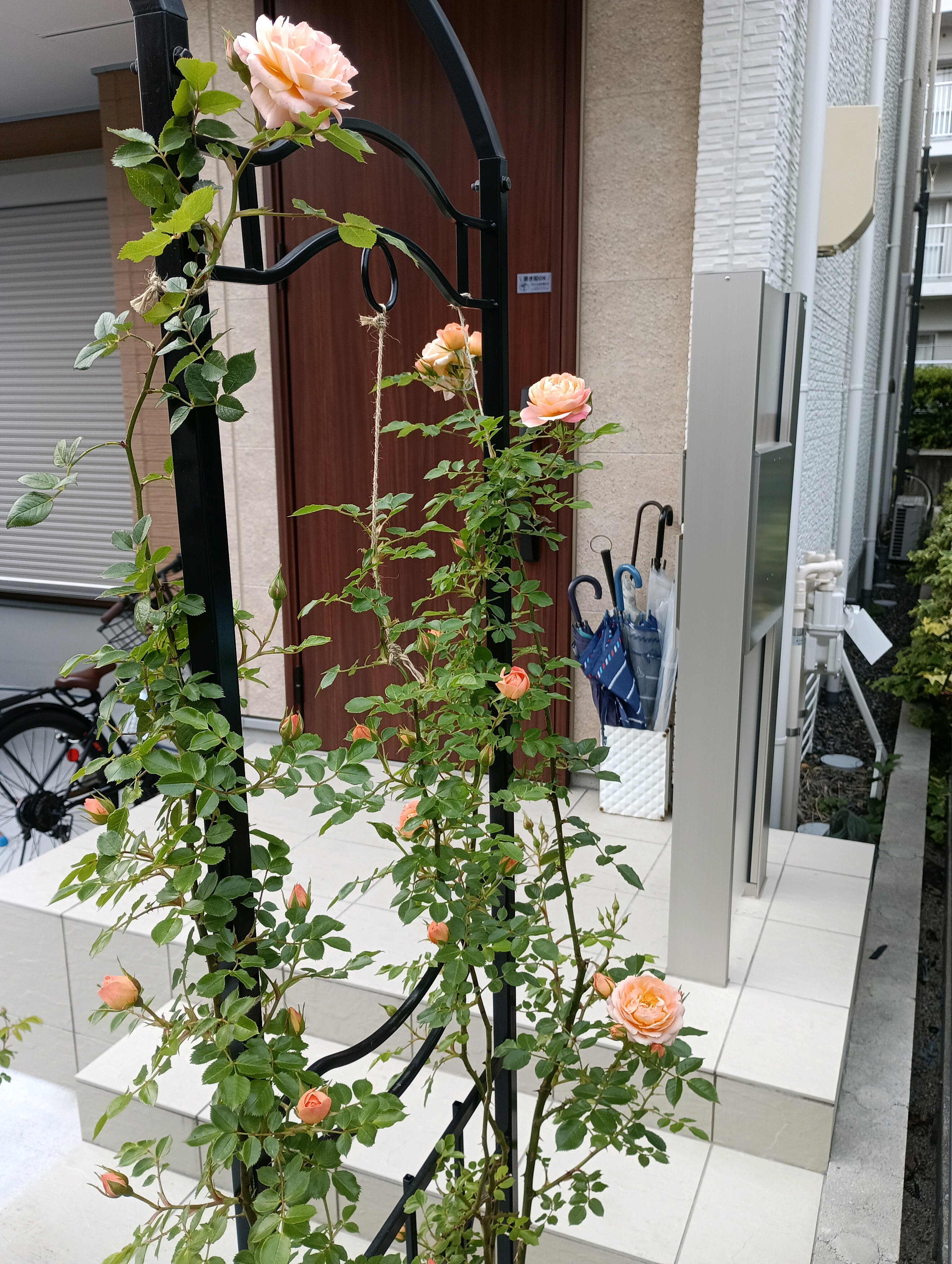 つるバラアーチの下半分は水平に渡した枝から伸ばすと、黒谷友香さんの番組でやっていたので早速。