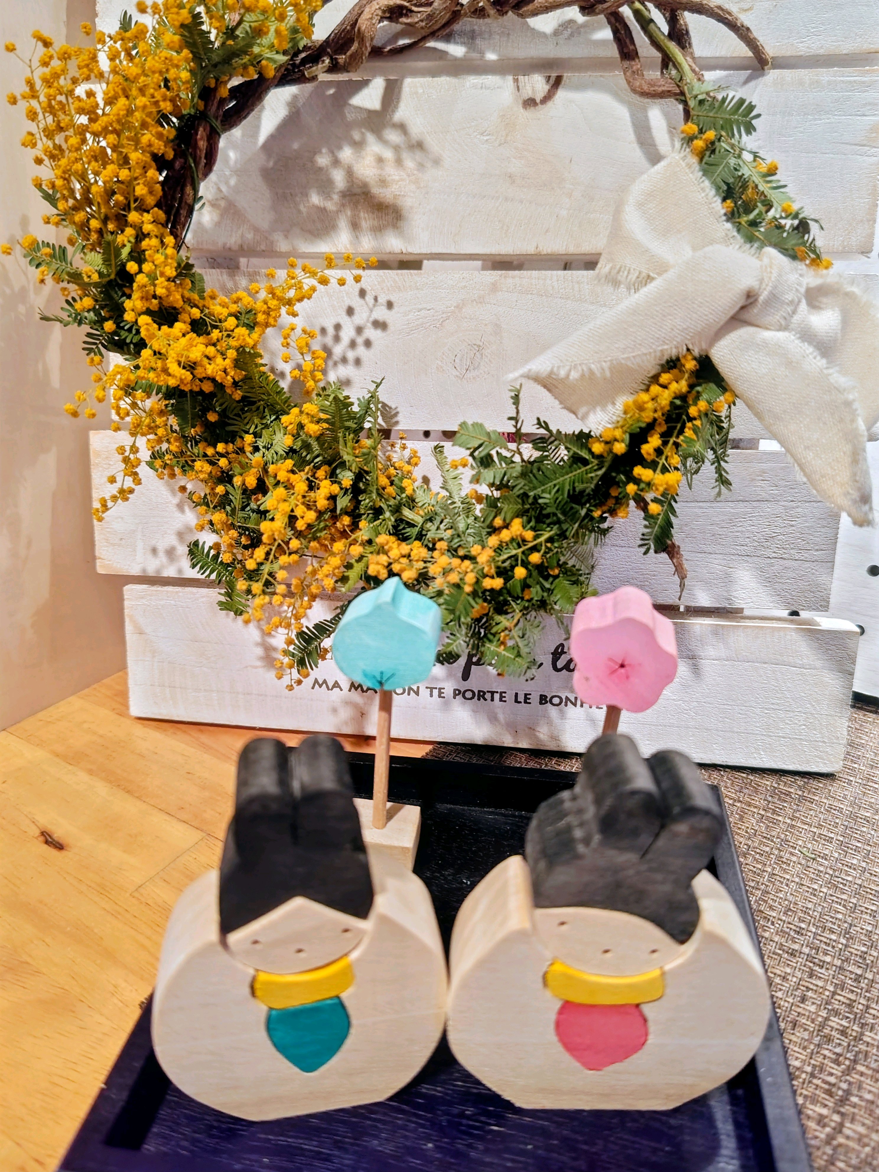 モフモフのミモザの切り花に出会うまで、アートフラワーの花籠🧺を添えて。