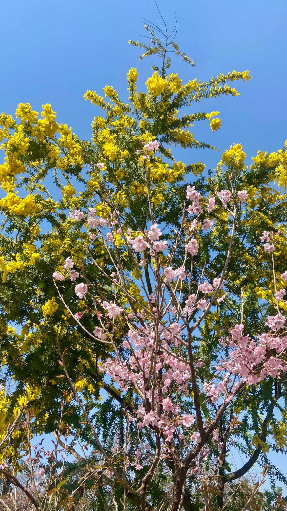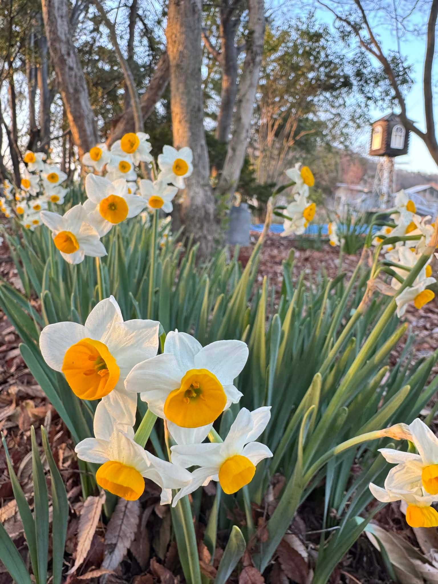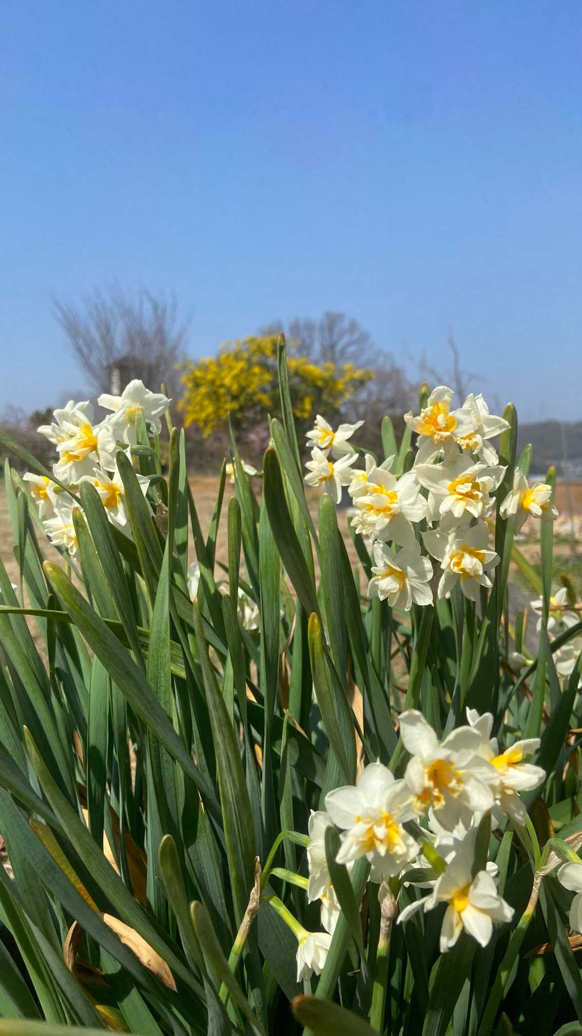 足元は水仙。このコラボもなかなか見れない。今年は八重咲きの水仙の開花が遅くて、お家でもお彼岸に満開を迎えました。
