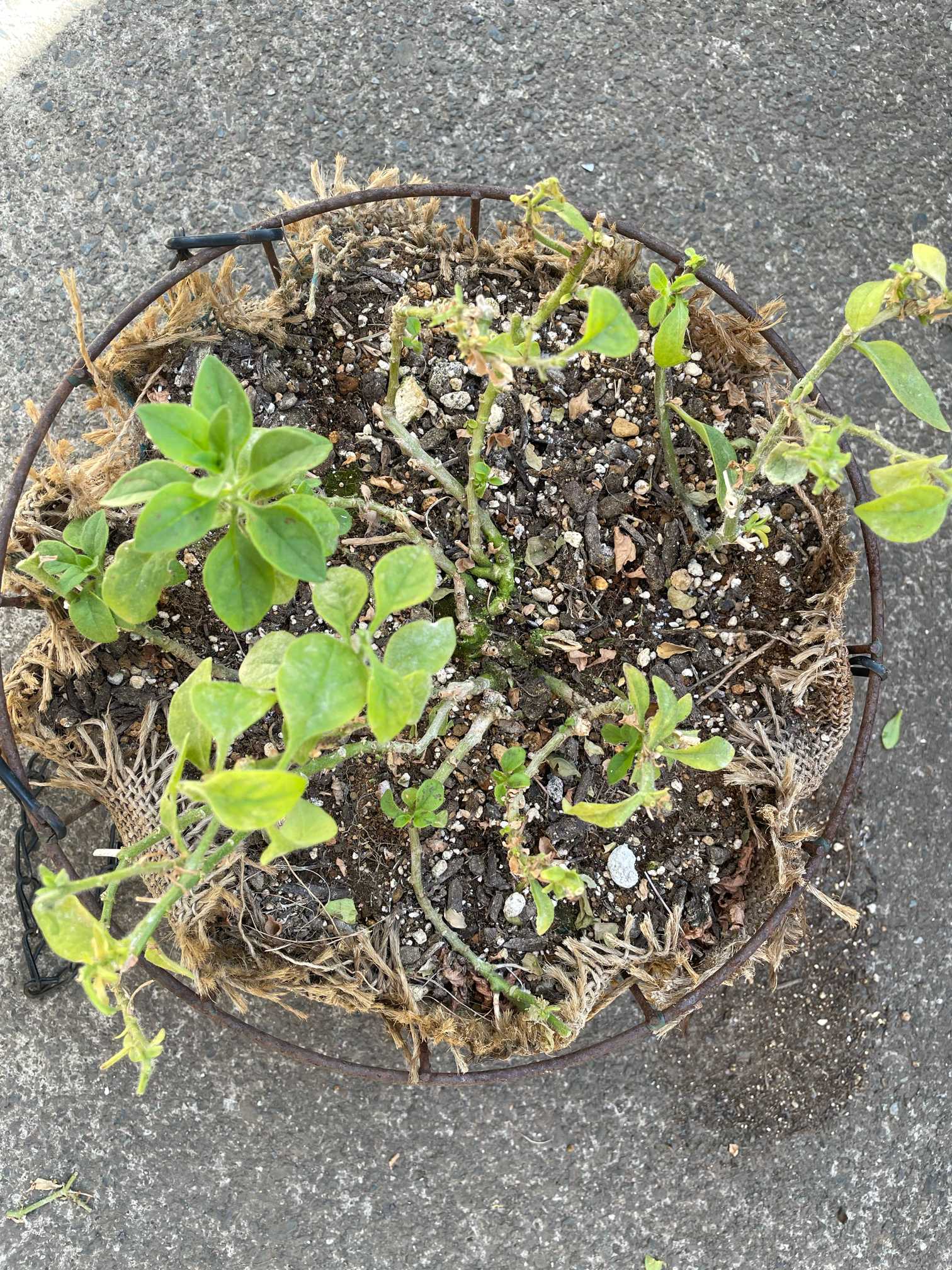 ハンギングのヤシ繊維もボロボロで用土が溢れても
