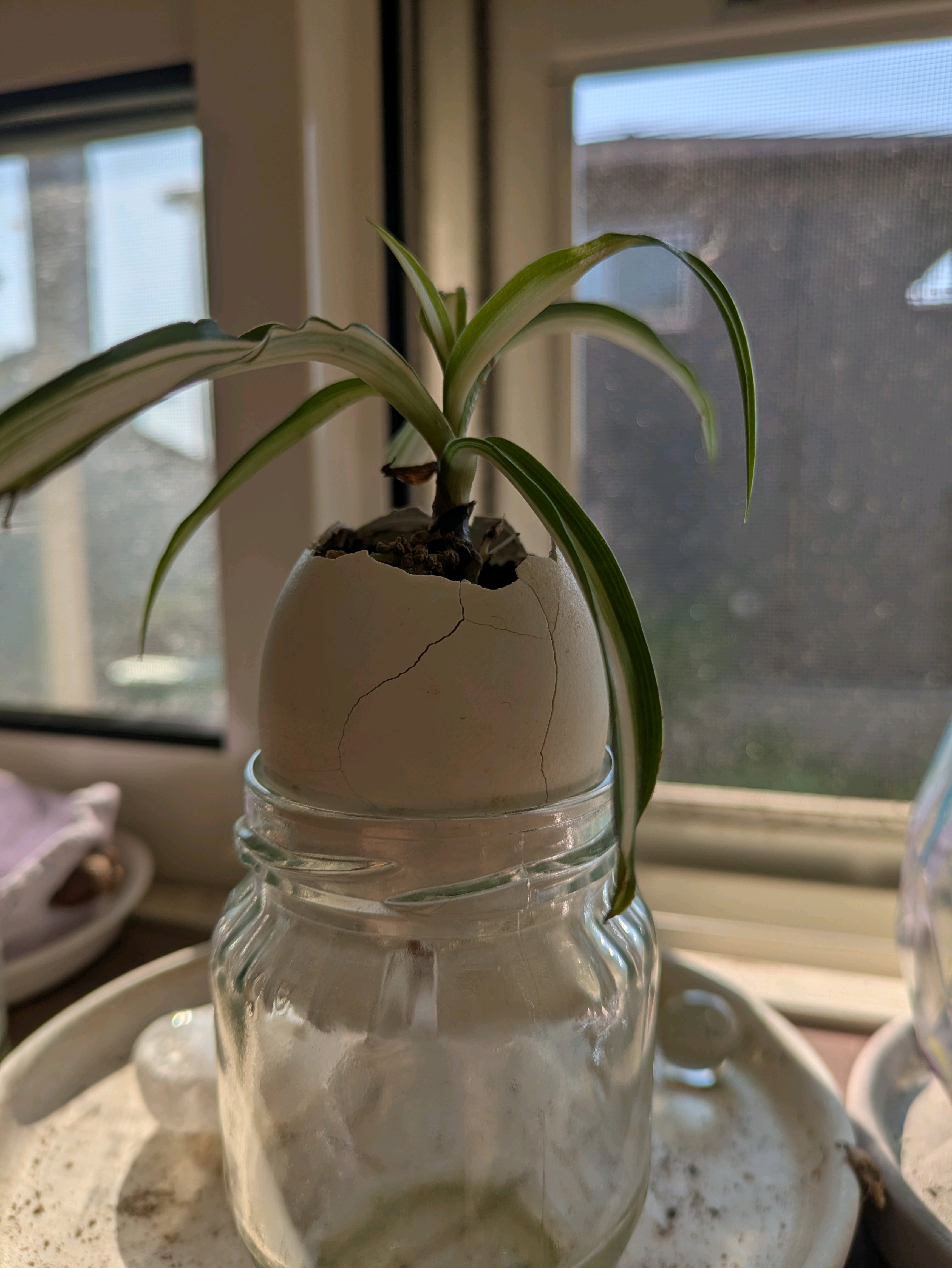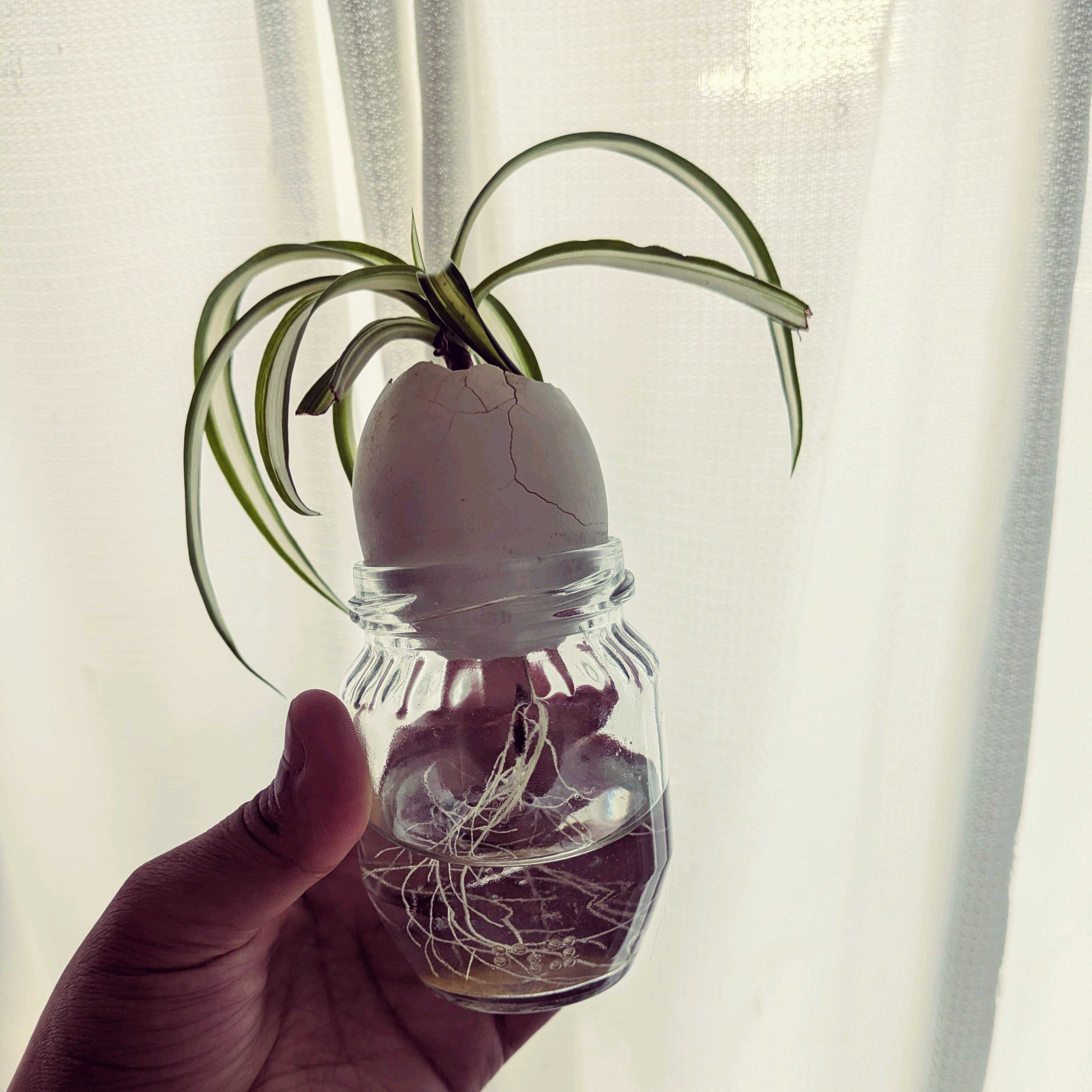 オリヅルランの子株をずっと水にさしていたのですが、根が出ていたので植えようと思ってました。たまたま、育苗用に使おうと思ってた卵の殻が目に入り、それを使ってみました。