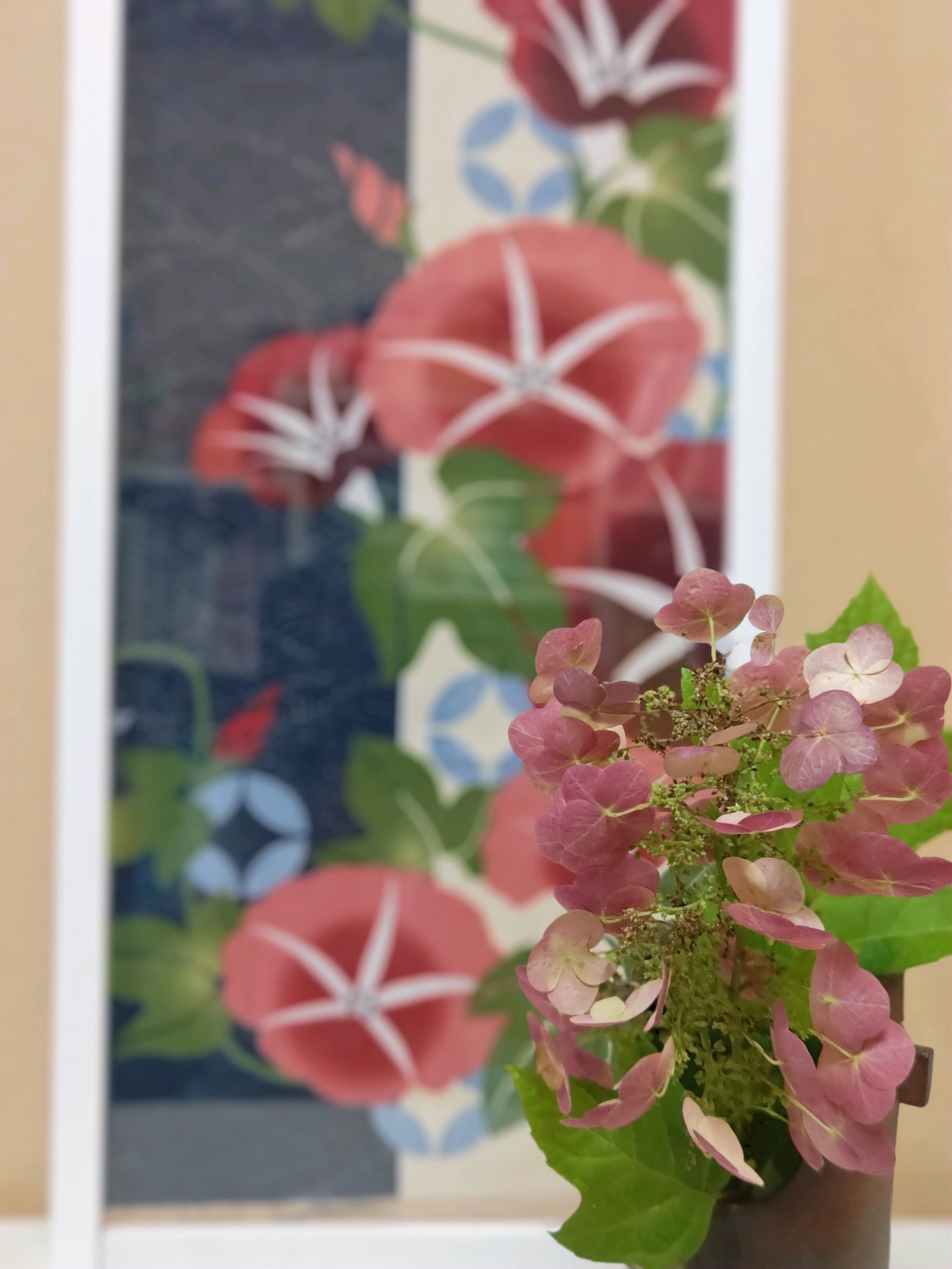 慌てて朝顔の絵手ぬぐい。カシワバアジサイと。