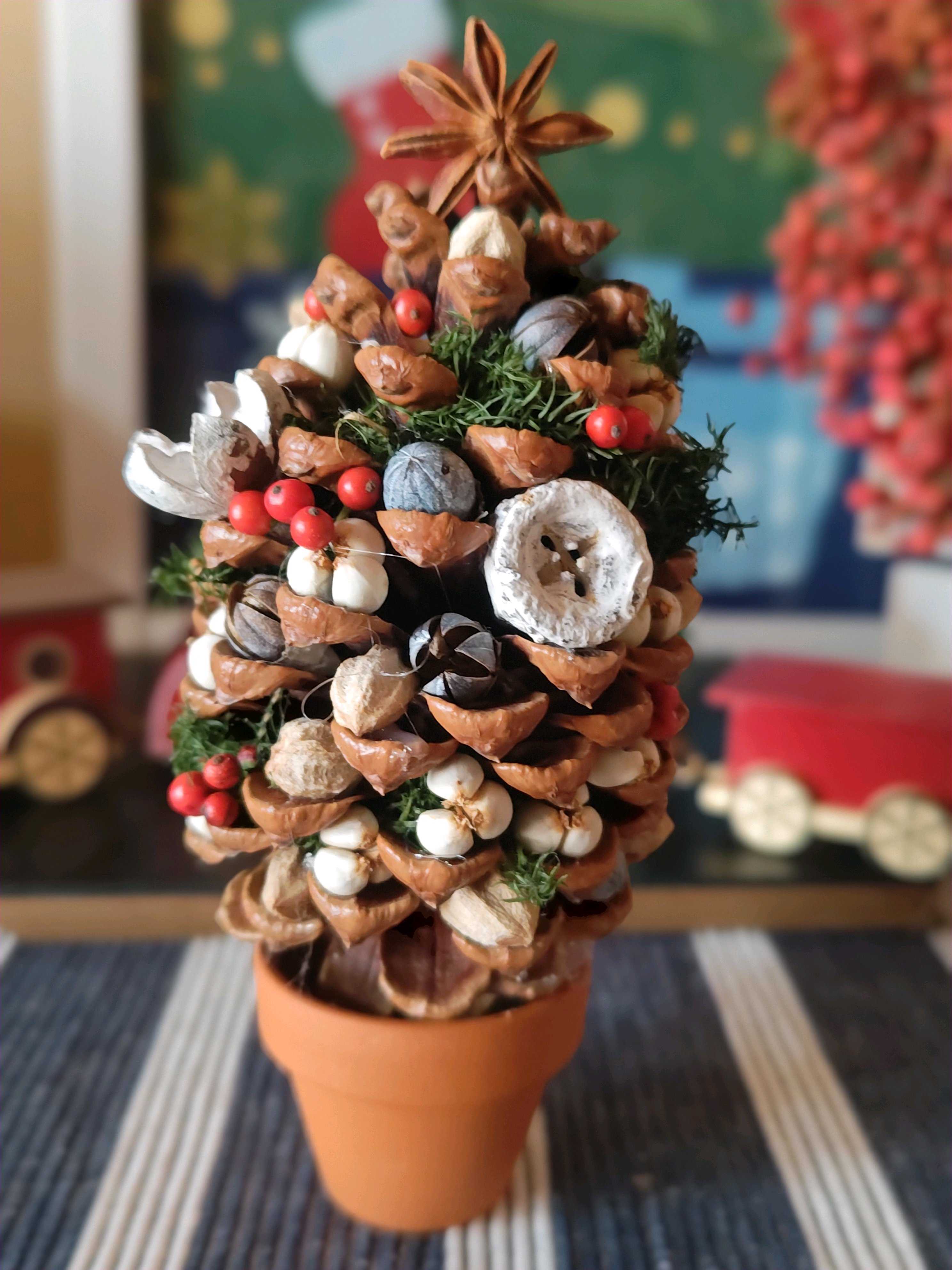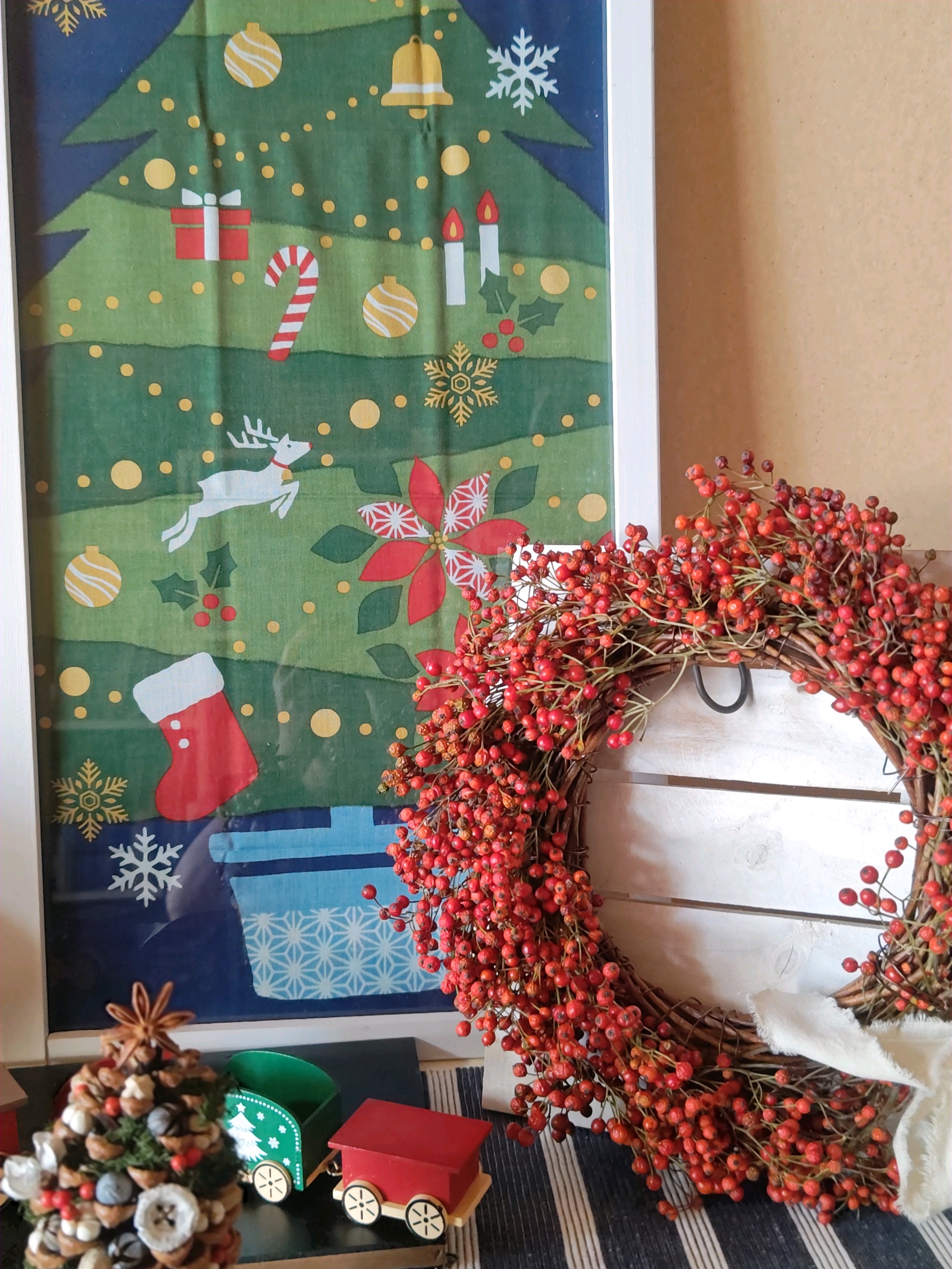 赤いノイバラの実のリースと、松ぼっくりツリー🎄。