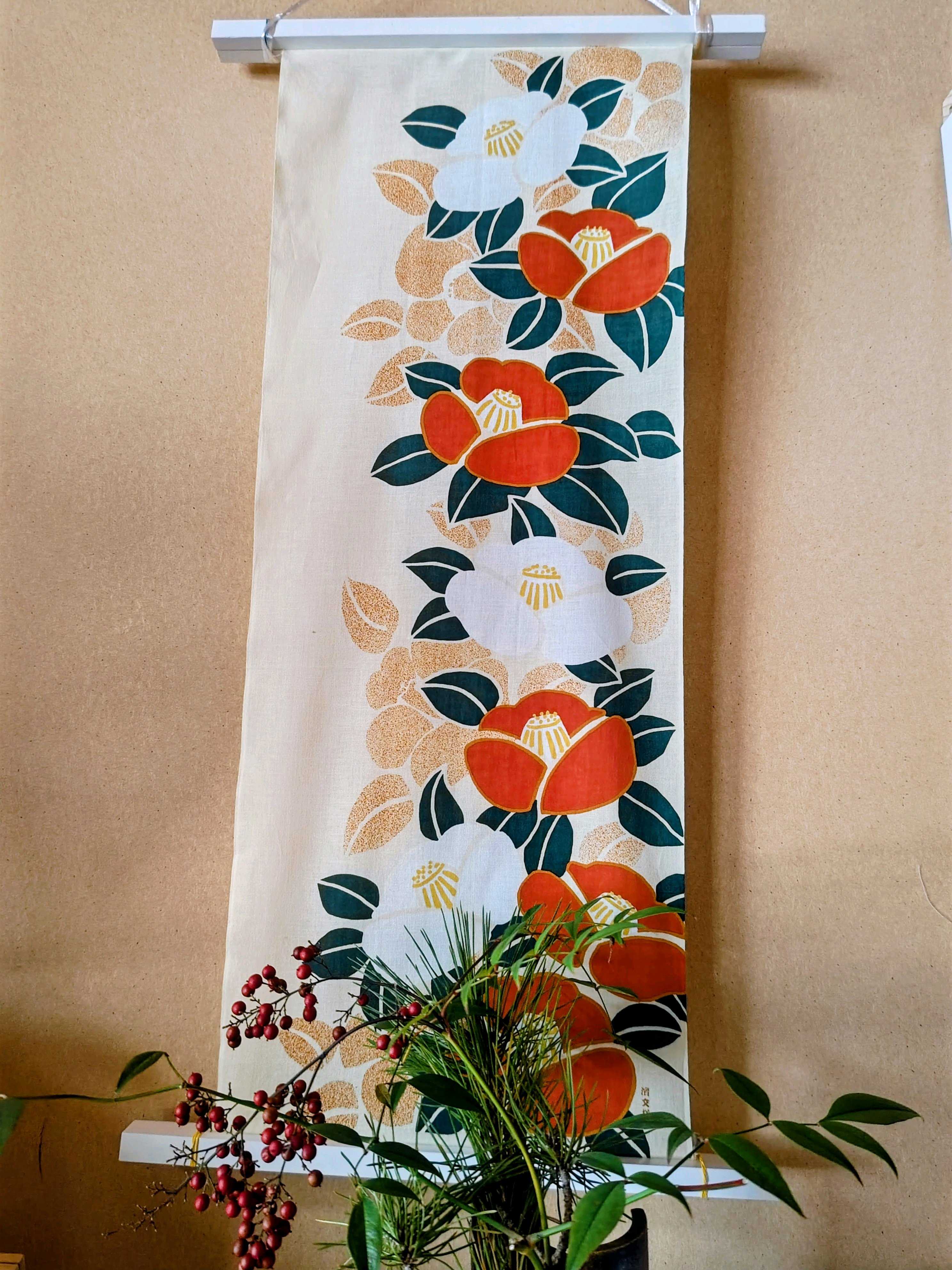 立春に、椿の絵手ぬぐい。