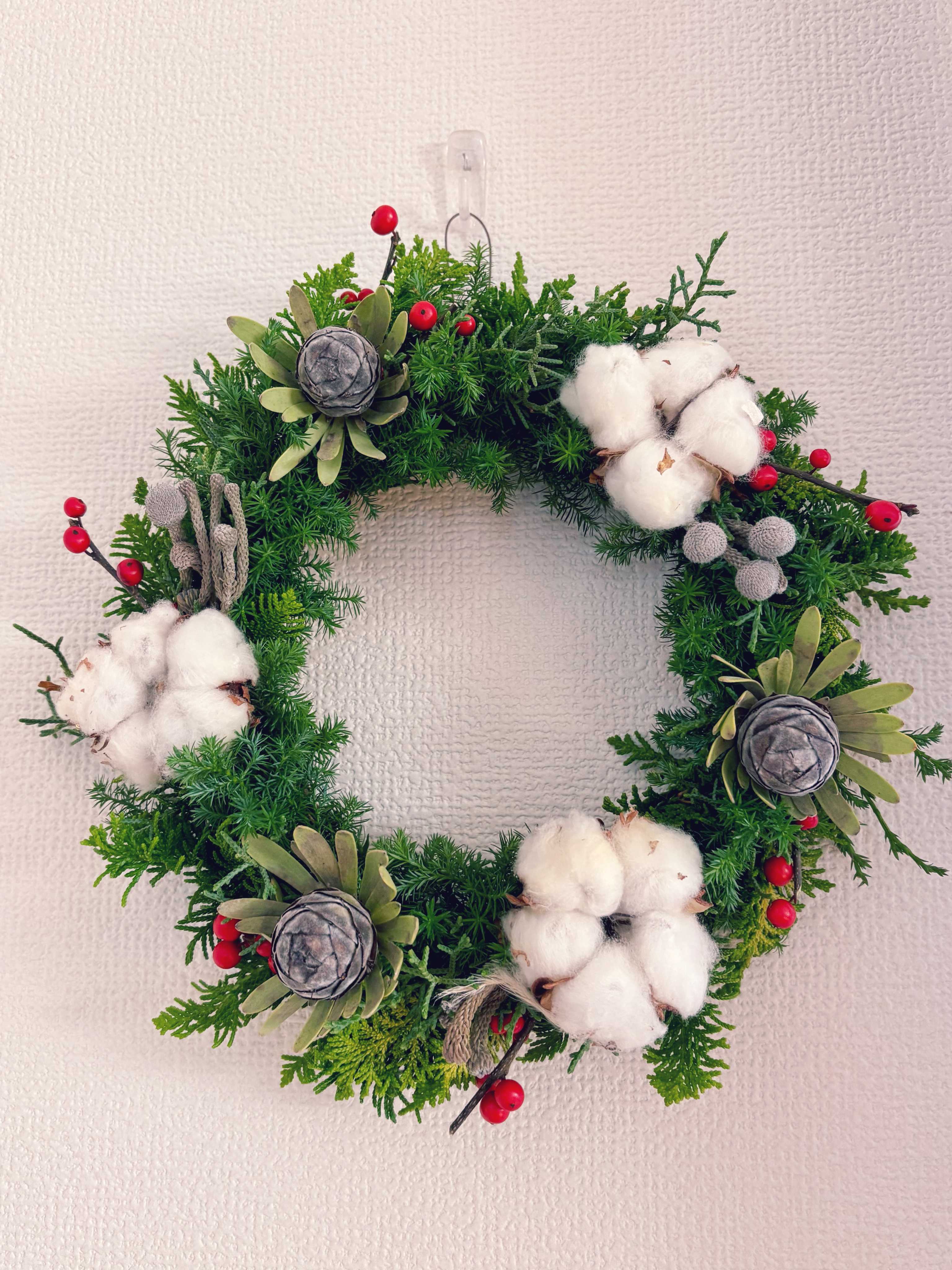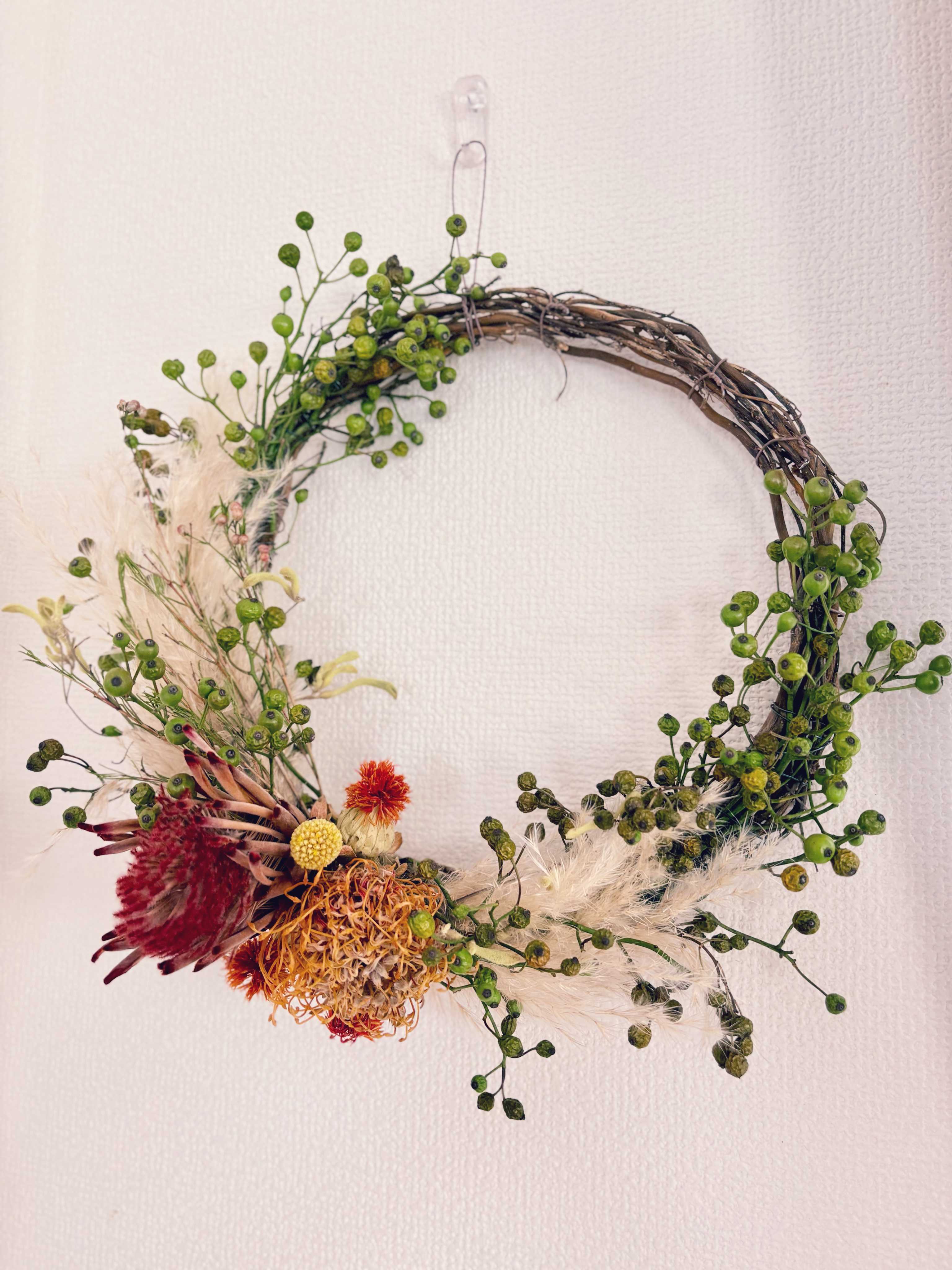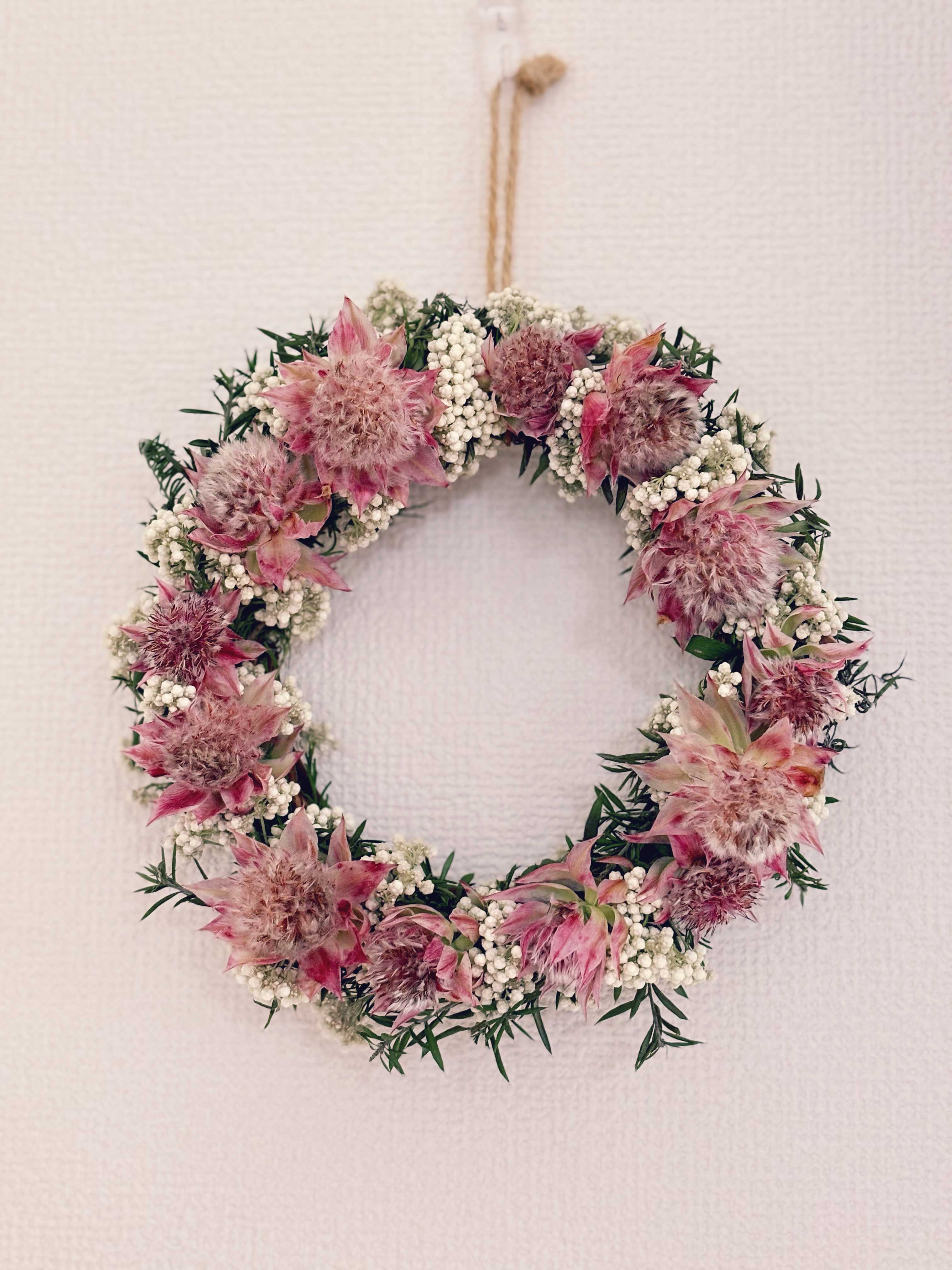 コットン、リューカデンドロン、ウィンターベリー、ブルニアのクリスマスリース(2025)