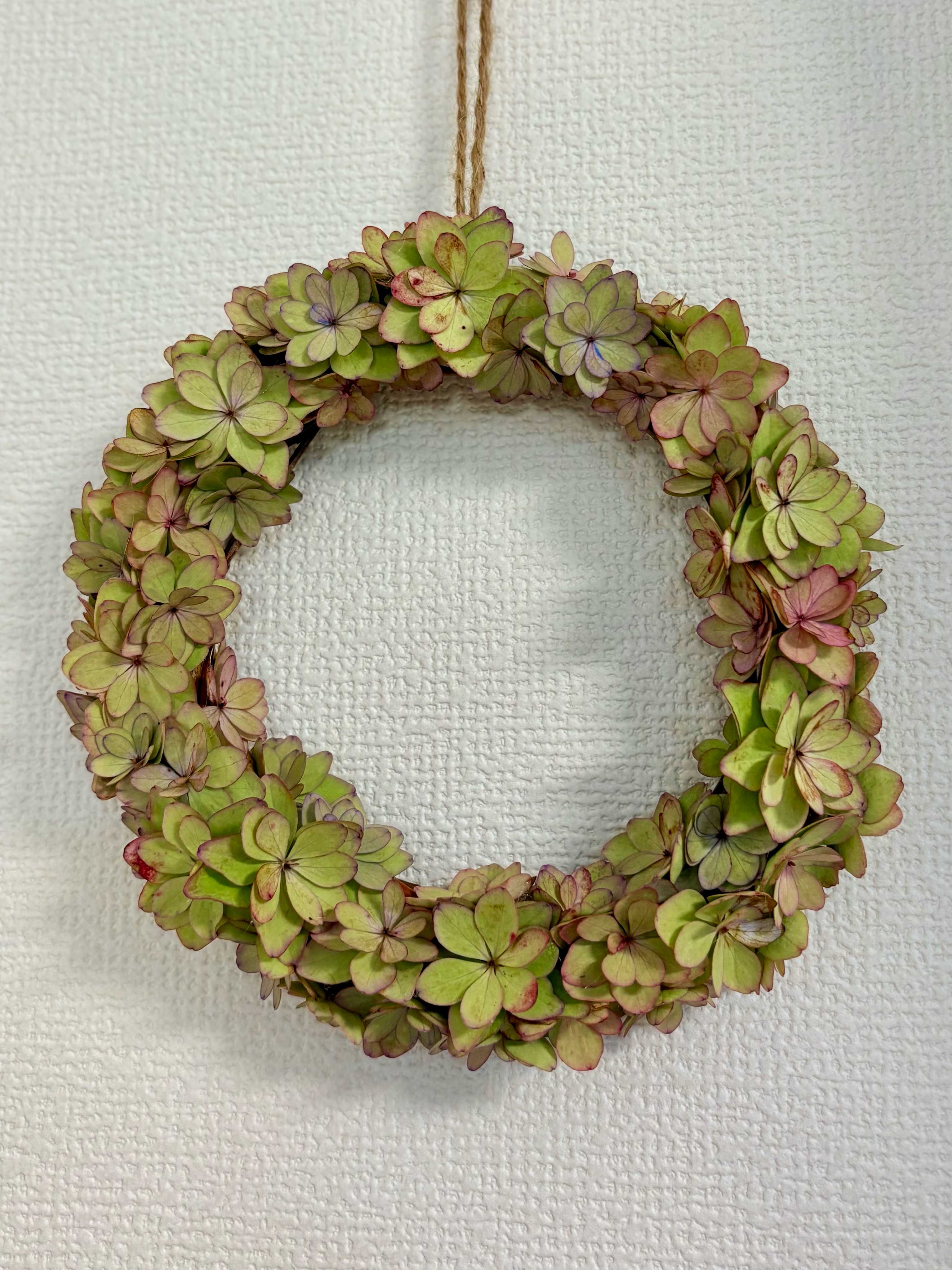 お庭のガクアジサイ「ひな祭り」のガクだけ使ってリースを作りました。