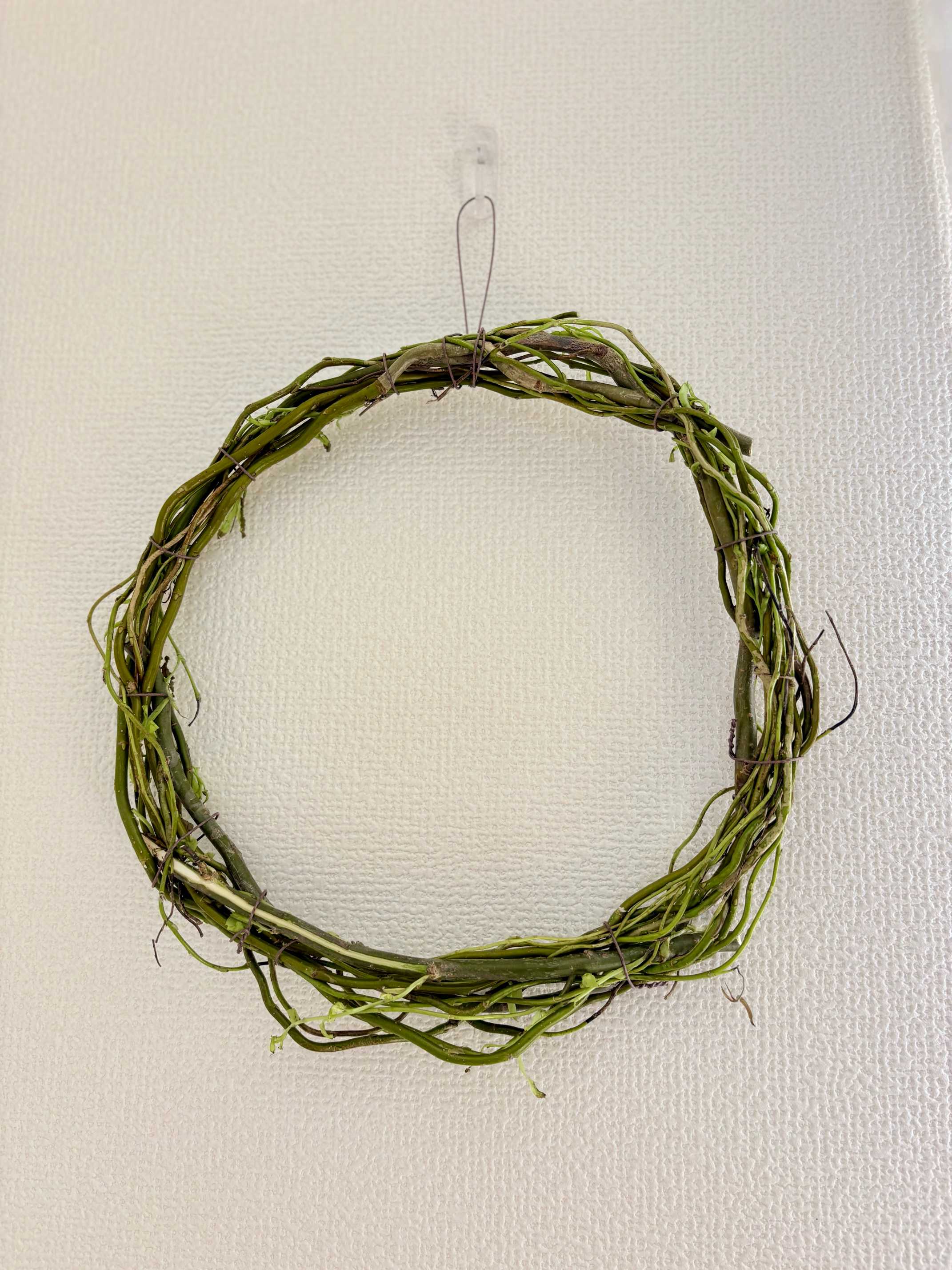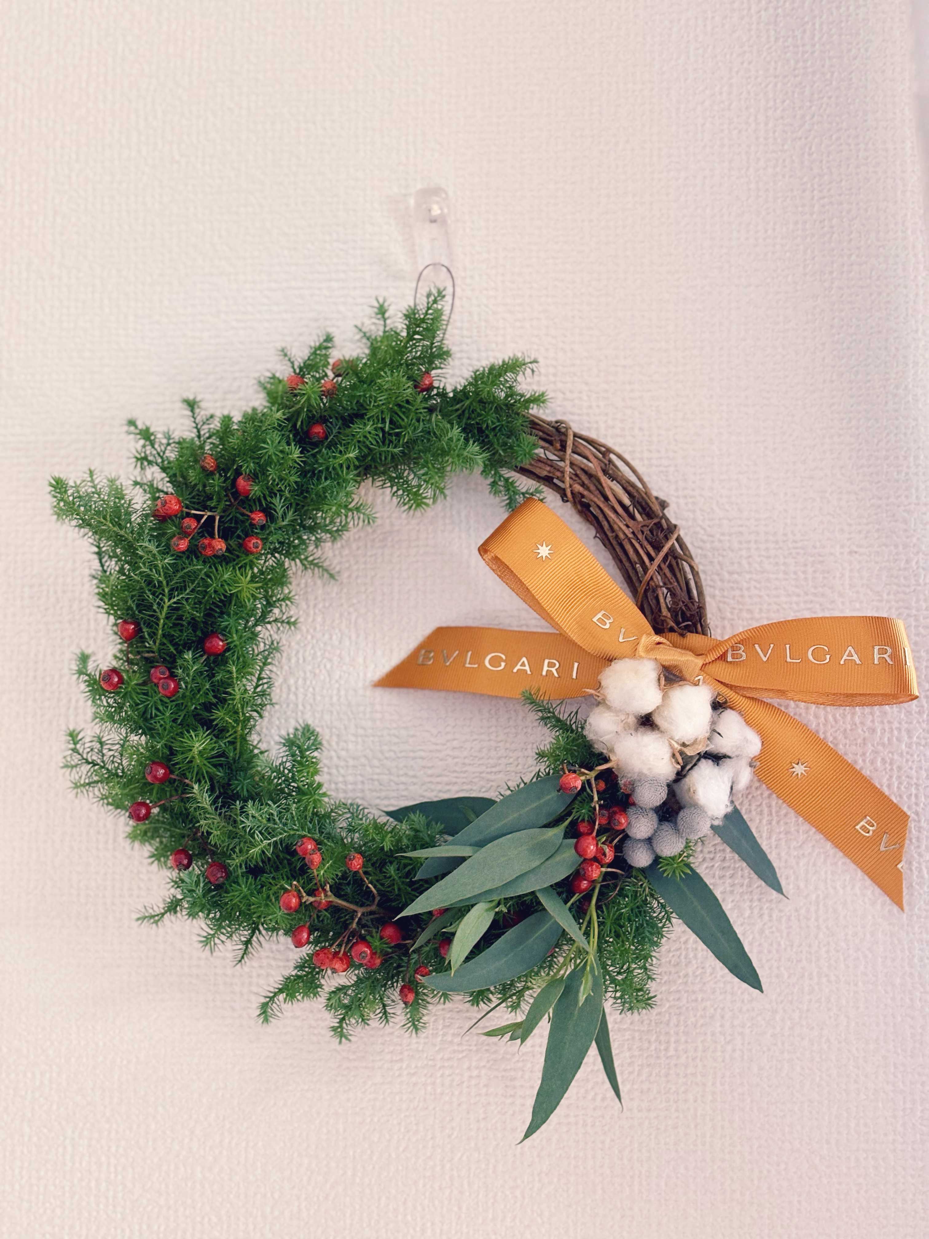 こちらはリース台も手作り。しばらく飾っていたウンリュウヤナギをぐるぐる巻いて、ベースを作りました。