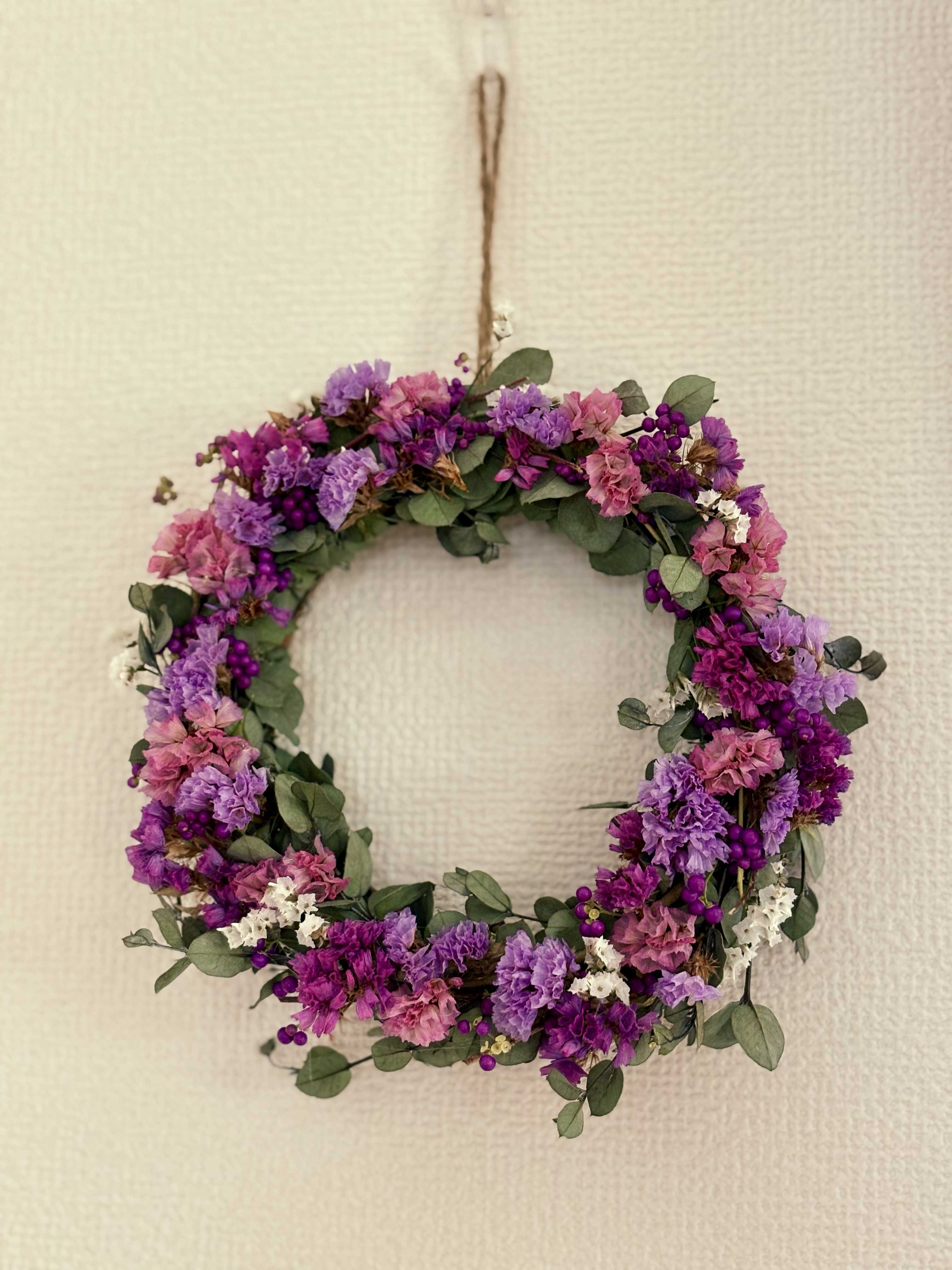 生花で飾っていたり庭で育てたものをドライにしていたスターチス数種類を使ってリースを作りました。