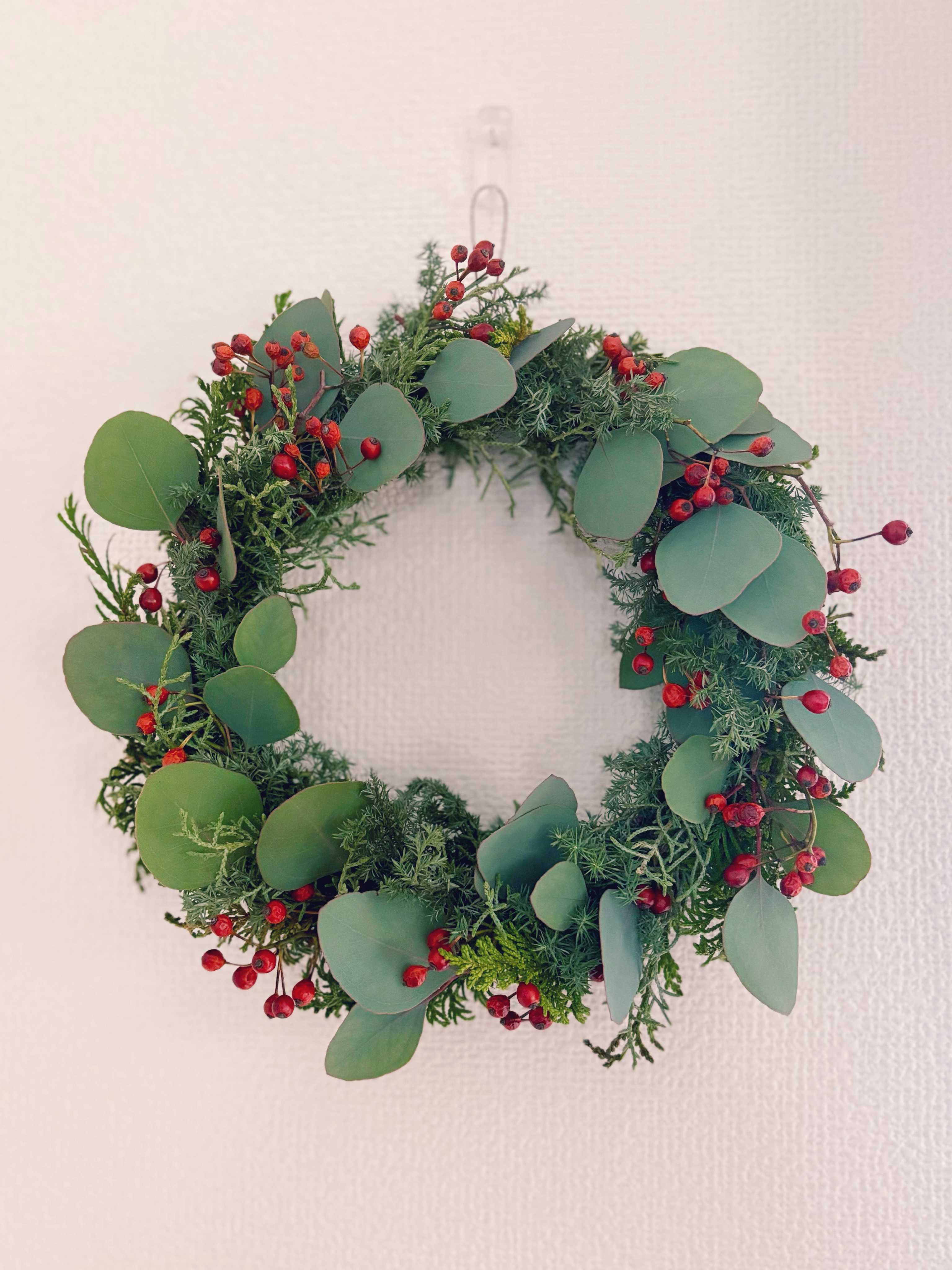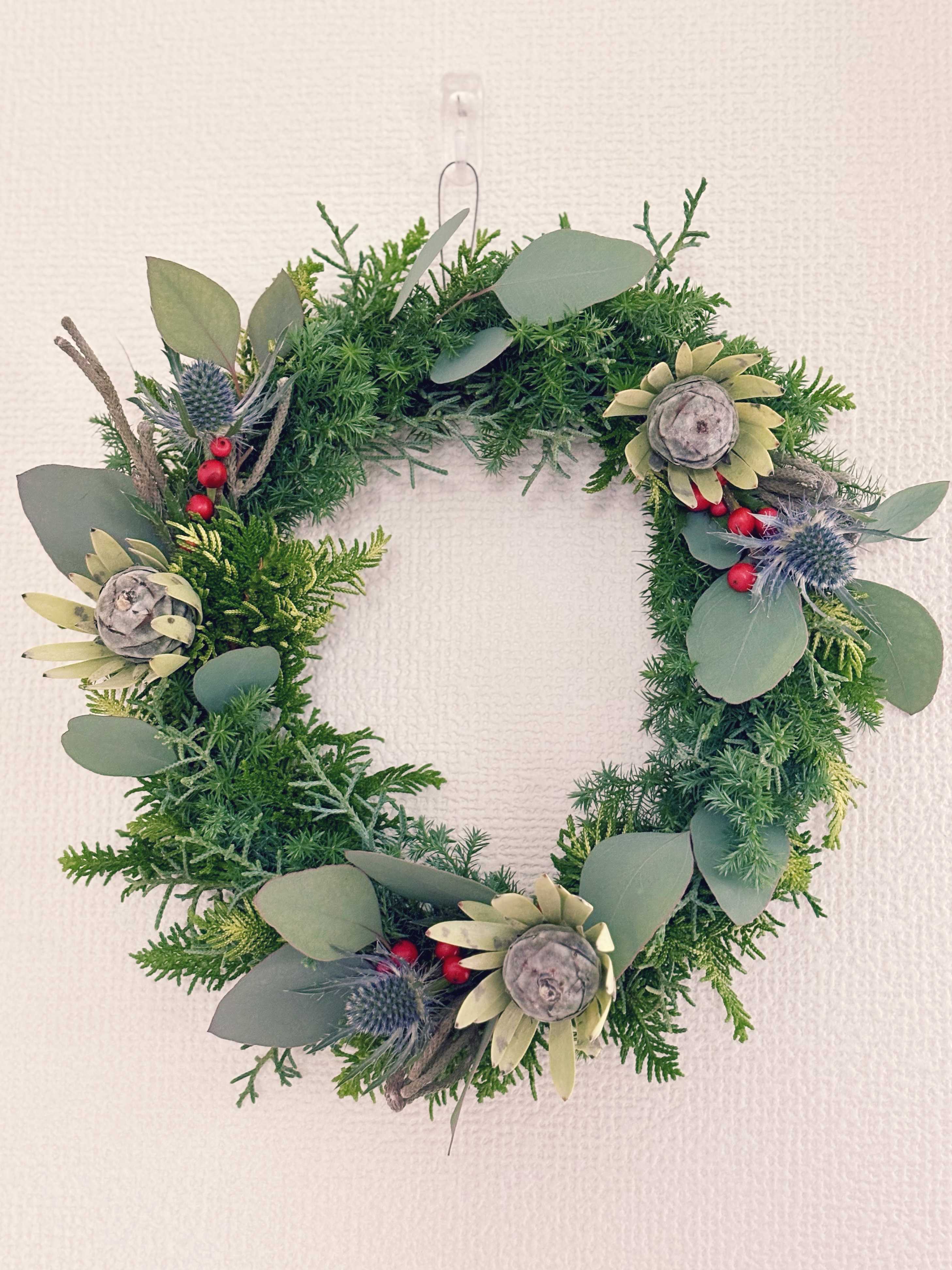 ユーカリポポラス、リューカデンドロン、エリンジウム、ウィンターベリー、ブルニアのナチュラルリース(2025)